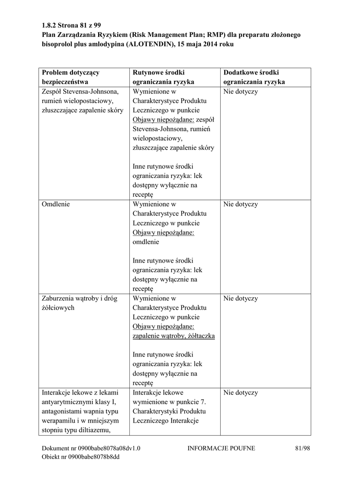 1.8.2 Strona 81 z 99 Plan Zarządzania Ryzykiem (Risk Management Plan; RMP) dla preparatu złożonego bisoprolol plus amlodypina (ALOTENDIN), 15 maja 2014 roku Problem dotyczący bezpieczeństwa Zespół Stevensa-Johnsona, rumień wielopostaciowy, złuszczające zapalenie skóry Omdlenie Zaburzenia wątroby i dróg żółciowych Interakcje lekowe z lekami antyarytmicznymi klasy I, antagonistami wapnia typu werapamilu i w mniejszym stopniu typu diltiazemu, Rutynowe środki ograniczania ryzyka Wymienione w Charakterystyce Produktu Leczniczego w punkcie Objawy niepożądane: zespół Stevensa-Johnsona, rumień wielopostaciowy, złuszczające zapalenie skóry Dodatkowe środki ograniczania ryzyka Nie dotyczy Inne rutynowe środki ograniczania ryzyka: lek dostępny wyłącznie na receptę Wymienione w Charakterystyce Produktu Leczniczego w punkcie Objawy niepożądane: omdlenie Nie dotyczy Inne rutynowe środki ograniczania ryzyka: lek dostępny wyłącznie na receptę Wymienione w Charakterystyce Produktu Leczniczego w punkcie Objawy niepożądane: zapalenie wątroby, żółtaczka Nie dotyczy Inne rutynowe środki ograniczania ryzyka: lek dostępny wyłącznie na receptę Interakcje lekowe wymienione w punkcie 7. Charakterystyki Produktu Leczniczego Interakcje Dokument nr 0900babe8078a08dv1.0 Obiekt nr 0900babe8078b8dd Nie dotyczy INFORMACJE POUFNE 81/98 1.8.2 Strona 81 z 99 Plan Zarządzania Ryzykiem (Risk Management Plan; RMP) dla preparatu złożonego bisoprolol plus amlodypina (ALOTENDIN), 15 maja 2014 roku inhibitorami CYP 3A4 i simwastatyną Niewydolność nerek Nie dotyczy (potencjalne Nie dotyczy ryzyko) Włóknienie Nie dotyczy (potencjalne Nie dotyczy ryzyko) Próba Nie dotyczy (potencjalne Nie dotyczy ryzyko) samobójcza/samobójstwo i myśli samobójcze Stosowanie w Nie dotyczy (potencjalne Nie dotyczy niezarejestrowanych ryzyko) wskazaniach Stosowanie w czasie Ostrzeżenie z Nie dotyczy ciąży/karmienia piersią (brak Charakterystyki Produktu Leczniczego: bisoprolol informacji) może wywierać szkodliwy wpływ na ciążę i/lub płód/noworodka Stosowanie u dzieci (brak Niezalecane w Nie dotyczy informacji) Charakterystyce Produktu Leczniczego: bisoprolol + amlodypina nie może być zalecany u dzieci Stosowanie u pacjentów z Ostrzeżenie z Nie dotyczy upośledzoną czynnością Charakterystyki Produktu wątroby (brak informacji) Leczniczego: zalecana ostrożność w razie stosowania u pacjentów z upośledzoną czynnością wątroby VI. 2 Podsumowanie planu zarządzania ryzykiem dla produktu leczniczego Alotendin przeznaczone do do publicznej wiadomości VI.2.1 Omówienie rozpowszechnienia choroby Pierwotne nadciśnienie tętnicze (wysokie ciśnienie krwi) stanowi częstą chorobę; cierpi na nią średnio 3,2 osób na 100. Częstość występowania choroby rośnie wraz z wiekiem. W wielu krajach 50% populacji powyżej 60. roku życia ma nadciśnienie. Ogółem szacuje się, że około 20% dorosłych na świecie (1 miliard) ma nadciśnienie, które przyczynia się do ponad 1,7 milionów zgonów rocznie. Dokument nr 0900babe8078a08dv1.0 Obiekt nr 0900babe8078b8dd INFORMACJE POUFNE 81/98 1.8.2 Strona 81 z 99 Plan Zarządzania Ryzykiem (Risk Management Plan; RMP) dla preparatu złożonego bisoprolol plus amlodypina (ALOTENDIN), 15 maja 2014 roku Nadciśnienie tętnicze jest najważniejszym czynnikiem ryzyka sercowo-naczyniowego na świecie. Szacuje się, że 49% przypadków choroby wieńcowej można przypisać nadciśnieniu tętniczemu, z nadciśnieniem może wiązać się 36% zawałów mięśnia sercowego (ataków serca) u kobiet i 20% u mężczyzn. Około 69% osób, które mają swój pierwszy zawał serca, 77% tych, którzy mają pierwszy udar i 74% tych, którzy mają zastoinową niewydolność serca, ma wartości ciśnienia tętniczego powyżej 140/90 mmHg. Nadciśnienie wiąże się też z udarem mózgu, schyłkową chorobą nerek (niewydolnością nerek) i chorobą naczyń obwodowych (słabe krążenie krwi). VI.2.2. Podsumowanie korzyści ze stosowania Uważa się, że codzienne przyjmowanie połączenia bisoprololu i amlodypiny w pierwotnym nadciśnieniu tętniczym II stopnia jest skuteczne i dobrze tolerowane. Oba leki są standardowym leczeniem o udowodnionym dobrym stosunku korzyści do ryzyka a ponieważ działają w różny sposób, wywierają addycyjny efekt obniżający ciśnienie. Preparat złożony ma za zadanie ułatwić pacjentom przyjmowanie leków – łatwiej jest pamiętać o przyjmowaniu 1 tabletki niż 2 tabletek. Gdy stosuje się małe dawki 2 leków, działania niepożądane tych leków są rzadsze niż przy przyjmowaniu jednego z tych leków w maksymalnej dawce. W badaniu EMR 200006_519 (BRIGHT AM) przeanalizowano skuteczność preparatu złożonego zawierającego bisoprolol i amlodypinę (Concor-AM) po 12 tygodniach stosowania u 4982 pacjentów ze świeżo rozpoznanym pierwotnym nadciśnieniem tętniczym II stopnia i źle kontrolowanym pierwotnym nadciśnieniem tętniczym II stopnia. Udowodniono, że Concor-AM jest skuteczny i bezpieczny. VI.2.3. Nieznane informacje dotyczące korzyści ze stosowania Istnieje długie doświadczenie ze stosowaniem zarówno bisoprololu jak i amlodypiny, również w sytuacjach łącznego stosowania tych 2 leków. Nie ma więc specyficznych nieznanych aspektów dotyczących tego połączenia. Dane dotyczące dzieci, młodzieży, pacjentów z innymi chorobami, jak niekontrolowana cukrzyca, zaburzenia czynności wątroby i/lub nerek lub zrekompensowana niewydolność serca oraz dane dotyczące kobiet, matek karmiących piersią oraz pacjentów otyłych (z indeksem masy ciała ponad 30 kg/m2) nie są dostępne. VI.2.4. Podsumowanie kwestii dotyczących bezpieczeństwa Dokument nr 0900babe8078a08dv1.0 Obiekt nr 0900babe8078b8dd INFORMACJE POUFNE 81/98 1.8.2 Strona 81 z 99 Plan Zarządzania Ryzykiem (Risk Management Plan; RMP) dla preparatu złożonego bisoprolol plus amlodypina (ALOTENDIN), 15 maja 2014 roku Ważne zidentyfi