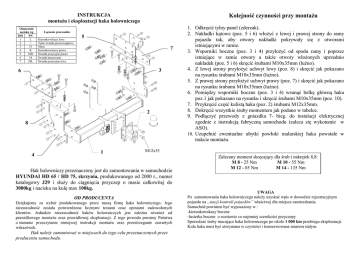 INSTRUKCJA montaŜu i eksploatacji haka holowniczego Oznaczenie zacisku wg ISO PN 1 L 2 + 3 31 4 R 5 58R 6 54 7 58L Kolejność czynności przy montaŜu Łączenie przewodów Kierunkowskazy lewe Tylne światła przeciwmgłowe Masa Kierunkowskazy prawe Światła pozycyjne prawe Światła hamowania Światła pozycyjne lewe 5 7 3 6 2 8 4 1 1. Odkręcić tylny panel (zderzak). 2. Nakładki kątowe (poz. 5 i 6) włoŜyć z lewej i prawej strony do ramy pojazdu tak, aby otwory nakładki pokrywały się z otworami istniejącymi w ramie. 3. Wsporniki boczne (poz. 3 i 4) przyłoŜyć od spodu ramy i poprzez istniejące w ramie otwory a takŜe otwory włoŜonych uprzednio nakładek (poz. 5 i 6) skręcić śrubami M10x35mm (luźno). 4. Z lewej strony przyłoŜyć uchwyt lewy (poz. 8) i skręcić jak pokazano na rysunku śrubami M10x35mm (luźno). 5. Z prawej strony przyłoŜyć uchwyt prawy (poz. 7) i skręcić jak pokazano na rysunku śrubami M10x35mm (luźno). 6. Pomiędzy wsporniki boczne (poz. 3 i 4) wsunąć belkę główną haka poz.1 jak pokazano na rysunku i skręcić śrubami M10x35mm (poz. 10). 7. Przykręcić część kulistą haka (poz. 2) śrubami M12x35mm. 8. Dokręcić wszystkie śruby momentem jak podano w tabelce. 9. Podłączyć przewody z gniazdka 7- bieg. do instalacji elektrycznej zgodnie z instrukcją fabryczną samochodu (zaleca się wykonanie w ASO). 10. Uzupełnić ewentualne ubytki powłoki malarskiej haka powstałe w trakcie montaŜu. M12x35 Hak holowniczy przeznaczony jest do zamontowania w samochodzie HYUNDAI HD 65 / HD 75, skrzynia, produkowanego od 2000 r., numer katalogowy J29 i słuŜy do ciągnięcia przyczep o masie całkowitej do 3000kg i nacisku na kulę max 100kg. OD PRODUCENTA Dziękujemy za wybór produkowanego przez naszą firmę haka holowniczego. Jego niezawodność została potwierdzona licznymi testami oraz opiniami zadowolonych klientów. JednakŜe niezawodność haków holowniczych jest zaleŜna równieŜ od prawidłowego montaŜu oraz prawidłowej eksploatacji. Z tego powodu prosimy Państwa o staranne przeczytanie niniejszej instrukcji montaŜu oraz przestrzeganie zawartych wskazówek. Hak naleŜy zamontować w miejscach do tego celu przeznaczonych przez producenta samochodu. Zalecany moment skręcający dla śrub i nakrętek 8,8: M 8 - 25 Nm M 10 - 55 Nm M 12 - 85 Nm M 14 - 135 Nm UWAGA Po zamontowaniu haka holowniczego naleŜy uzyskać wpis w dowodzie rejestracyjnym pojazdu na „stacji kontroli pojazdów” właściwej dla miejsca zamieszkania. Samochód powinien być wyposaŜony w : -kierunkowskazy boczne -lusterka boczne o rozstawie co najmniej szerokości przyczepy Sprawdzać śruby mocujące haka holowniczego po około 1 000 km przebiegu eksploatacji. Kula haka musi być utrzymana w czystości i konserwowana smarem stałym. PPUH AUTO-HAK S.J. WyposaŜenie haka: Produkcja Haków Holowniczych Henryk & Zbigniew Nejman 76-200 SŁUPSK ul. Słoneczna 16K tel/fax (059) 8-414-414; 8-414-413 E-mail: [email protected] www. autohak.com.pl Hak holowniczy bez wyposaŜenia elektrycznego Klasa: A50-X Nr kat. J29 Przeznaczony do zamontowania w samochodzie: Producent: HYUNDAI Model: HD 65 / HD 75 Typ: skrzynia produkowanego od 2000r. Dane techniczne: Wartość siły D : 14,30 kN maksymalna masa przyczepy: 3000 kg maksymalny nacisk na kulę: 100 kg Numer homologacji zgodnie z wytycznymi regulaminu EKG/ONZ 55.01: E20-55R-01 KARTA GWARANCYJNA Producent udziela gwarancji niniejszą kartą gwarancyjną na okres 24 miesięcy licząc od dnia zakupu haka holowniczego do samochodu: HYUNDAI HD 65 / HD 75 skrzynia produkowanego od 2000r. Data produkcji .............................. Data zakupu..................................... Zakres gwarancji obejmuje wyłącznie wady jakościowe wynikające z winy producenta. Gwarancja nie obejmuje natomiast uszkodzeń zawinionych przez nabywcę, wynikających z niewłaściwego montaŜu, uŜytkowania lub konserwacji, uszkodzeń mechanicznych, normalnego zuŜycia podczas eksploatacji itp. Gwarancja udzielona na zakupiony towar nie wyłącza, nie ogranicza ani nie zawiesza uprawnień kupującego wynikających z niezgodności towaru z umową. Reklamacje naleŜy zgłaszać w punkcie sprzedaŜy, składając jednocześnie kartę gwarancyjną. Usunięcie "wady" następuje po stwierdzeniu przez punkt sprzedaŜy wspólnie z producentem słuszności złoŜonej reklamacji. Reklamacja powinna być załatwiona w ciągu 14 dni od dnia uznania reklamacji. Karta gwarancyjna jest niewaŜna jeŜeli nie jest wypełniona i podpisana. Data zgłoszenia reklamacji: ................................................................... INFORMACJA WSTĘPNA Hak holowniczy jest skonstruowany zgodnie z zasadami bezpieczeństwa ruchu drogowego. Hak holowniczy jest elementem wpływającym na bezpieczeństwo jazdy i moŜe zostać zainstalowany wyłącznie przez personel wyspecjalizowany. Niedopuszczalne jest dokonywanie jakichkolwiek zmian w konstrukcji haka. Powoduje to wygaśniecie dopuszczenia do stosowania. W przypadku obecności masy izolacyjnej lub osłony podwozia w miejscu przylegania haka, naleŜy ją usunąć. Nieosłonięte miejsca karoserii oraz wywiercone otwory naleŜy pomalować farbą antykorozyjną. Informacjami wiąŜącymi odnośnie wartości obciąŜeń są dane podawane przez producenta samochodu, względnie wartości maksymalnej masy przyczepy oraz maksymalnego nacisku na kulę, przy czym wartości parametrów haka holowniczego nie mogą być przekroczone. Wzór do obliczania wartości siły D: Maks. masa przyczepy [kg] x Maks. masa samochodu [kg] Maks. masa przyczepy [kg] + Maks. masa samochodu [kg] X 9,81 = 1000 D [kN]