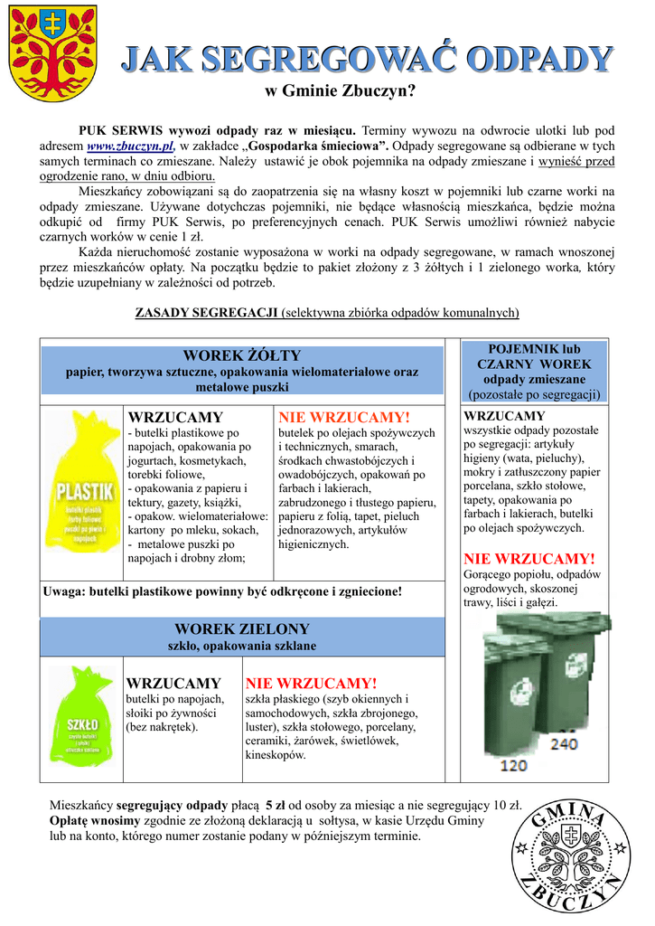 JAK SEGREGOWAĆ ODPADY w Gminie Zbuczyn? PUK SERWIS wywozi odpady raz w miesiącu. Terminy wywozu na odwrocie ulotki lub pod adresem www.zbuczyn.pl, w zakładce „Gospodarka śmieciowa”. Odpady segregowane są odbierane w tych samych terminach co zmieszane. Należy ustawić je obok pojemnika na odpady zmieszane i wynieść przed ogrodzenie rano, w dniu odbioru. Mieszkańcy zobowiązani są do zaopatrzenia się na własny koszt w pojemniki lub czarne worki na odpady zmieszane. Używane dotychczas pojemniki, nie będące własnością mieszkańca, będzie można odkupić od firmy PUK Serwis, po preferencyjnych cenach. PUK Serwis umożliwi również nabycie czarnych worków w cenie 1 zł. Każda nieruchomość zostanie wyposażona w worki na odpady segregowane, w ramach wnoszonej przez mieszkańców opłaty. Na początku będzie to pakiet złożony z 3 żółtych i 1 zielonego worka, który będzie uzupełniany w zależności od potrzeb. ZASADY SEGREGACJI (selektywna zbiórka odpadów komunalnych) WOREK ŻÓŁTY papier, tworzywa sztuczne, opakowania wielomateriałowe oraz metalowe puszki WRZUCAMY NIE WRZUCAMY! - butelki plastikowe po napojach, opakowania po jogurtach, kosmetykach, torebki foliowe, - opakowania z papieru i tektury, gazety, książki, - opakow. wielomateriałowe: kartony po mleku, sokach, - metalowe puszki po napojach i drobny złom; butelek po olejach spożywczych i technicznych, smarach, środkach chwastobójczych i owadobójczych, opakowań po farbach i lakierach, zabrudzonego i tłustego papieru, papieru z folią, tapet, pieluch jednorazowych, artykułów higienicznych. Uwaga: butelki plastikowe powinny być odkręcone i zgniecione! POJEMNIK lub CZARNY WOREK odpady zmieszane (pozostałe po segregacji) WRZUCAMY wszystkie odpady pozostałe po segregacji: artykuły higieny (wata, pieluchy), mokry i zatłuszczony papier porcelana, szkło stołowe, tapety, opakowania po farbach i lakierach, butelki po olejach spożywczych. NIE WRZUCAMY! Gorącego popiołu, odpadów ogrodowych, skoszonej trawy, liści i gałęzi. WOREK ZIELONY szkło, opakowania szklane WRZUCAMY NIE WRZUCAMY! butelki po napojach, słoiki po żywności (bez nakrętek). szkła płaskiego (szyb okiennych i samochodowych, szkła zbrojonego, luster), szkła stołowego, porcelany, ceramiki, żarówek, świetlówek, kineskopów. Mieszkańcy segregujący odpady płacą 5 zł od osoby za miesiąc a nie segregujący 10 zł. Opłatę wnosimy zgodnie ze złożoną deklaracją u sołtysa, w kasie Urzędu Gminy lub na konto, którego numer zostanie podany w późniejszym terminie. PUK SERWIS Sp. z o. o ul. Brzeska 110, 08-110 Siedlce tel. 25 632 46 26, 25 632 23 79; [email protected] HARMONOGRAM ODBIORU ODPADÓW KOMUNALNYCH SEGREGOWANYCH I NIESEGREGOWANYCH z nieruchomości zamieszkałych na terenie Gminy Zbuczyn na okres 01.07.2013 – 31.12.2013 roku Miejscowość Nr 8 Nr 7 Nr 6 Nr 5 Nr 4 Nr 3 Nr 2 Nr 1 Rejon VII DNI MIESIĄCA VIII IX X XI XII Zbuczyn ul: Błękitna, Boczna, Cmentarna, Jana Pawła II, Jasna, Lipowa, Mała, Młynarska, Pogodna, Południowa, Poręby, Polna, Siedlecka, Słoneczna, Spacerowa, Spokojna, Starowiejska, Świerkowa, Terespolska, Wesoła, Żytnia 8 7 9 7 12 9 9 8 10 8 13 10 10 9 11 9 14 11 11 10 12 10 15 12 12 12 13 11 16 13 15 13 16 14 18 16 16 14 17 15 19 17 17 16 18 16 20 18 1.Zbuczyn ul.: Cicha, Dębowa, Gliniana, Graniczna, Klonowa, Krótka, Leśna, Łąkowa, Ogrodowa, Piwna, Północna, Rynek, 2. Borki – Wyrki, 3. Chromna, 4. Zdany 1. Borki Kosy 4. Dziewule 2. Jasionka 5. Smolanka 3. Rówce 6. Januszówka 1. Grodzisk 5. Wólka Kamienna 2. Łęcznowola 6. Zawady 3. Pogonów 7. Maciejowice 4. Tchórzew – Plewki 1. Stary Krzesk 4. Sobicze 2. Tęczki 5. Grochówka 3. Wesółka 1. 2. 3. 1. 2. 3. 4. 1. 2. 3. 4. 5. Krzesk – Królowa Niwa 4. Izdebki - Kosny Krzesk - Majątek 5. Izdebki – Błażeje Izdebki - Kośmidry Izdebki –Wąsy 5. Karcze Modrzew 6. Rzążew Kwasy 7. Choja Tchórzew Bzów 6. Tarcze Lucynów 7. Ługi Wielkie Olędy 8. Lipiny Czuryły 9. Ługi Rętki Cielemęc Odbieranie mebli i innych odpadów wielkogabarytowych, zużytych opon i elektrośmieci, odbywać się będzie okresowo w terminach i miejscach podawanych na stronie internetowej Urzędu Gminy Zbuczyn oraz w sposób zwyczajowo przyjęty, co najmniej miesiąc przed planowanym terminem zbiórki. Ponadto, odpady wielkogabarytowe, zużyty sprzęt elektryczny i elektroniczny, opony, metale, tworzywa sztuczne, szkło, baterie i akumulatory, chemikalia i przeterminowane leki oraz opady ulegające biodegradacji, w tym odpady zielone, można przekazywać do stacjonarnych punktów selektywnej zbiórki odpadów komunalnych, których usytuowanie oraz godziny otwarcia podane zostaną do wiadomości mieszkańców w późniejszym terminie. W przypadku wątpliwości, proszę dzwonić do Urzędu Gminy pod tel. 25 641 63 90 w.13 lub 15.