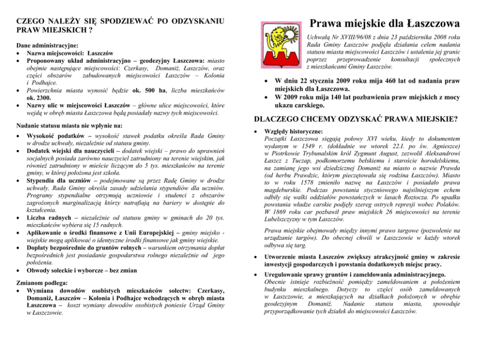 CZEGO NALEŻY SIĘ SPODZIEWAĆ PO ODZYSKANIU PRAW MIEJSKICH ? Prawa miejskie dla Łaszczowa Uchwałą Nr XVIII/96/08 z dnia 23 października 2008 roku Rada Gminy Łaszczów podjęła działania celem nadania statusu miasta miejscowości Łaszczów i ustalenia jej granic poprzez przeprowadzenie konsultacji społecznych z mieszkańcami Gminy Łaszczów. Dane administracyjne: • Nazwa miejscowości: Łaszczów • Proponowany układ administracyjno – geodezyjny Łaszczowa: miasto obejmie następujące miejscowości: Czerkasy, Domaniż, Łaszczów, oraz części obszarów zabudowanych miejscowości Łaszczów – Kolonia i Podhajce. • Powierzchnia miasta wynosić będzie ok. 500 ha, liczba mieszkańców ok. 2300. • Nazwy ulic w miejscowości Łaszczów – główne ulice miejscowości, które wejdą w obręb miasta Łaszczowa będą posiadały nazwy tych miejscowości. Nadanie statusu miasta nie wpłynie na: • • • • • • • Wysokość podatków – wysokość stawek podatku określa Rada Gminy w drodze uchwały, niezależnie od statusu gminy. Dodatek wiejski dla nauczycieli – dodatek wiejski – prawo do uprawnień socjalnych posiada zarówno nauczyciel zatrudniony na terenie wiejskim, jak również zatrudniony w mieście liczącym do 5 tys. mieszkańców na terenie gminy, w której położona jest szkoła. Stypendia dla uczniów – podejmowane są przez Radę Gminy w drodze uchwały. Rada Gminy określa zasady udzielania stypendiów dla uczniów. Programy stypendialne otrzymują uczniowie i studenci z obszarów zagrożonych marginalizacją którzy natrafiają na bariery w dostępie do kształcenia. Liczba radnych – niezależnie od statusu gminy w gminach do 20 tys. mieszkańców wybiera się 15 radnych. Aplikowanie o środki finansowe z Unii Europejskiej – gminy miejsko wiejskie mogą aplikować o identyczne środki finansowe jak gminy wiejskie. Dopłaty bezpośrednie do gruntów rolnych – warunkiem otrzymania dopłat bezpośrednich jest posiadanie gospodarstwa rolnego niezależnie od jego położenia. Obwody sołeckie i wyborcze – bez zmian Zmianom podlega: • Wymiana dowodów osobistych mieszkańców sołectw: Czerkasy, Domaniż, Łaszczów – Kolonia i Podhajce wchodzących w obręb miasta Łaszczowa – koszt wymiany dowodów osobistych poniesie Urząd Gminy w Łaszczowie. • • W dniu 22 stycznia 2009 roku mija 460 lat od nadania praw miejskich dla Łaszczowa. W 2009 roku mija 140 lat pozbawienia praw miejskich z mocy ukazu carskiego. DLACZEGO CHCEMY ODZYSKAĆ PRAWA MIEJSKIE? • Względy historyczne: Początki Łaszczowa sięgają połowy XVI wieku, kiedy to dokumentem wydanym w 1549 r. (dokładnie we wtorek 22.I. po św. Agnieszce) w Piotrkowie Trybunalskim król Zygmunt August, zezwolił Aleksandrowi Łaszcz z Tuczap, podkomorzemu bełskiemu i staroście horodelskiemu, na zamianę jego wsi dziedzicznej Domaniż na miasto o nazwie Prawda (od herbu Prawdzic, którym pieczętowała się rodzina Łaszczów). Miasto to w roku 1578 zmieniło nazwę na Łaszczów i posiadało prawa magdeburskie. Podczas powstania styczniowego najsilniejszym echem odbiły się walki oddziałów powstańczych w lasach Roztocza. Po upadku powstania władze carskie podjęły szereg ostrych represji wobec Polaków. W 1869 roku car pozbawił praw miejskich 26 miejscowości na terenie Lubelszczyzny w tym Łaszczów. Prawa miejskie obejmowały między innymi prawo targowe (pozwolenie na urządzanie targów). Do obecnej chwili w Łaszczowie w każdy wtorek odbywa się targ. • Utworzenie miasta Łaszczów zwiększy atrakcyjność gminy w zakresie inwestycji gospodarczych i powstania dodatkowych miejsc pracy. • Uregulowanie sprawy gruntów i zameldowania administracyjnego. Obecnie istnieje rozbieżność pomiędzy zameldowaniem a położeniem budynku mieszkalnego. Dotyczy to części osób zameldowanych w Łaszczowie, a mieszkających na działkach położonych w obrębie geodezyjnym Domaniż. Nadanie statusu miasta, spowoduje przyporządkowanie tych działek do miejscowości Łaszczów. W związku z faktem, iż w styczniu 2009 roku mija 460 lat od chwili nadania praw miejskich podjęliśmy działania, aby styczeń ze względu na swoją wymowę historyczną dla obszaru Łaszczowa był czasem do przeprowadzenia konsultacji społecznych, które odbędą się w II połowie stycznia 2009 roku. Zgodnie z uchwałą Rady Gminy zostaną przeprowadzone konsultacje społeczne we wszystkich sołectwach Gminy Łaszczów. Dla sołectw: Czerkasy Domaniż, Łaszczów, Łaszczów – Kolonia, Podhajce, ankiety konsultacyjne zostaną dostarczone i odebrane od mieszkańców uprawionych do głosowania. Dla mieszkańców z pozostałych sołectw konsultacje społeczne zostaną przeprowadzone podczas zebrań wiejskich. Mamy nadzieję, że niniejsza inicjatywa uzyska poparcie z Państwa strony i z zaangażowaniem wezmą Państwo udział w konsultacjach społecznych. O dokładnym terminie poinformujemy w późniejszym okresie. Starania o odzyskanie praw miejskich będą nie tylko działaniem administracyjnym, ale także lekcją historii. Historii, o której należy pamiętać, zaś obchodzenie rocznic odzyskania praw miejskich będzie do tego doskonałą okazją.