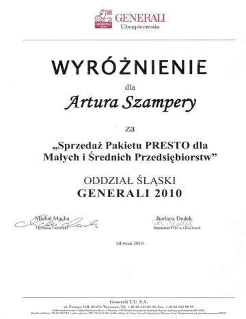 ~ ~ GENERAll lJbezpiecze~a WYRÓZNIENIE dla .Jlrtura Szampery . za "Sprzedaz Pakietu PRESTO dla , Malych i,Srednich Przedsiebiorstw" , ODDZIAL SLASKI GENERALI2010 Gliwice 2010 Generali T.U. S.A. ul. Postepu 15B, 02-676 Warszawa, Tel. +48 22 543 05 00, Fax. +48 22 543 08 99 Kapital zakladowy: Spólka zarejestrowana w Sadzie Rejonowym dla m. st. Warszawy, XIII Wydzial Gospodarczy Krajowego 190.310.000 PLN w pelni oplacony; NIP: 526-23-49-108. Spólka nalezaca do Grupy Genecali, figurujacej Rejestru Sadowego pod numerem KRS 10623. w Rejestrze Grup Ubezpieczeniowych prowadzonym przez ISVAP. ~.SAVEPOL .~ INFRASTRUKTURY ANTYKOROZYJNE I CHEMOODPORNE POWLOKI POLIURETANOWE POLIURETANY ul. Ptakowicka Sp.z 0.0. BYTOM [email protected] PRZEMYSLOWEJ I~. !II 4, 41-936 tel. +48322803337,2868507 fax: 032 280 33 37 wew. 28 POLIURETANY ZABEZPIECZENIA I~.!II SAVEPOL www.savepol.pl HYDROIZOLACYJNE NATRYSKOWE POWLOKI POLIURETANOWE I~. !II OKLADZINY TRUDNOSCIERALNE ELASTOMERY POLIURETANOWE Bytom 5.05.2009 ~. EN ISO 9001:2000 !ertyfikal: 75.100.614?, tGI DoradztwoFinansowo - Ubezpieczeniowe laIIrCWt Artur Szampera Referencje Pragniemy wyrazic swoje zadowolenie ze wspólpracy z Firma Doradztwo Finansowo - Ubezpieczeniowe Artur Szampera, swiadczaca uslugi doradcze z zakresu: . . ubezpieczen, . faktoringu, . . finansowania inwestycji, . windykacjii kupna wierzytelnosci. leasingu, pozyskiwaniasrodków z UE, Podstawa kontaktów z Firma Doradztwo Finansowo - Ubezpieczeniowe Artur Szampera sa rzetelnosc i fachowosc, polaczone z osobistym zaangazowaniem we wspólprace oraz wyczuleniem na indywidualnepotrzeby Klienta. Uslugi swiadczone sa zawsze terminowo i bez zastrzezen, z zachowaniem nalezytej zawodowej starannosci. Dzieki temu Firma zyskala u nas bardzo dobra opinie, pozwalajaca polecic ja, jako sprawdzonego Partnera. Do wyboru Firmy Doradztwo Finansowo - Ubezpieczeniowe Artur Szampera sposród tak szerokiego grona firm o podobnym charakterze dzialalnosci, sklonily nas nie tylko wzgledy praktyczne, jak oferowana przez Partnera szeroka gama uslug branzy finansowej, ale co wazniejsze, szerokie zrozumienie naszych potrzeb, jako Klienta,mila oraz kompetentna obsluga, profesjonalizm, rzetelnosc kadry pracowniczej. To wszystko stanowi doskonala wizytówkefirmy. Z ogromna przyjemnoscia mozemy polecic uslugi swiadczone przez Doradztwo Finansowo Ubezpieczeniowe Artur Szampera, szczególnie tym, którzy poszukuja solidnego Partnera do wspólpracy. Jestesmy przekonani, ze mozecie Panstwo polegac na tej Firmie. Z powazaniem NIP REGON 6262750538 278239464 KRS 0000209506 Kapital zakladowy Sad Rejonowy w Katowicach 170.000,00 PLN Raiffeisen Bank Polska S.A. 82175012370000000008360707 Bank Zachodni WBK S.A. 631090177900000001 02465625 ZAMOS SI'./.(UJ. Tarnowskie Góry, dnia 11.02.2010 r. LIST REFERENCYJNY Dla Firmy Doradztwo Finansowo-Ubezpieczeniowe Artur Szampera Rekomendujemy firme Doradztwo 'Finansowo-Ubezpieczeniowe Artur Szampera jako solidnego, wiarygodnego, w pelni przygotowanego Partnera do kompleksowej obslugi w tematach: ~ ~ ~ ~ ~ ubezpieczen, faktoringu, leasingu, finansowania inwestycji, windykacjii kupna wierzytelnosci. Doswiadczona kadra oraz potencjal gwarantuja wysoki poziom swiadczonych uslug. Powierzone zadania zostaly wykonane w oparciu o kompleksowe oraz indywidualne podejscie do sprawy, co w naszej ocenie pozwala z pelna odpowiedzialnoscia zarekomendowac Firme, jako solidnego partnera w biznesie. P.S.U. ZAMOS sp. z 0.0. 42-680 Tarnowskie Góry, ul.Zagórska 91 tel. (0-32)284-17-08, tel.lfax382-35-50,0-505-113-895,e -mail: [email protected] NIP645-000-01-38