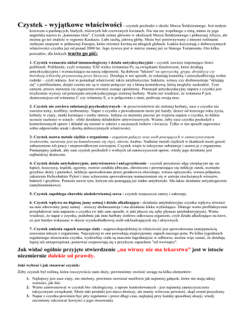 Czystek - wyjątkowe właściwości - czystek pochodzi z okolic Morza Śródziemnego. Jest małym krzewem o pachnących, białych, różowych lub czerwonych kwiatach. Nie ma nic wspólnego z różą, mimo że jego angielska nazwa to „kamienna róża”. Czystek rośnie głównie w okolicach Morza Śródziemnego i północnej Afryce, ale można go też znaleźć w regionie Kaukazu. Lubi suchą, jałową glebę. Może być porównywany z innymi roślinami zielnymi znanymi w północnej Europie, które również kwitną na ubogich glebach. Ludzie korzystają z dobroczynnych właściwości czystka już od ponad 2000 lat. Jego żywica jest w mirrze znanej już ze Starego Testamentu. Oto kilka powodów, dla których warto go pić: 1. Czystek wzmacnia układ immunologiczny i działa antyoksydacyjnie - czystek zawiera imponujące ilości polifenoli. Polifenole, czyli witaminy XXI wieku (witamina P), są związkami fenolowymi, które działają antyoksydacyjnie i wzmacniająco na naszą odporność. Są dobrym "lekiem" na opryszczkę, grypę, drożdżycę czy boreliozę (chorobę przenoszoną przez kleszcze). Działają w ten sposób, że osłaniają komórkę i unieszkodliwiają wolne rodniki – czyli intruza. Jest to poniekąd właściwość także antybiotyczna: bakterie, wirusy czy drobnoustroje "sklejają się" z polifenolami, dzięki czemu nie są w stanie połączyć się z błoną komórkową, którą mogłyby uszkodzić. Tym samym, proces starzenia się organizmu również zostaje opóźniony. Potencjał antyoksydacyjny naparu z czystka jest trzykrotnie wyższy od potencjału antyoksydacyjnego zielonej herbaty. Warto też wiedzieć, że witamina P jest skuteczniejsza od witaminy C czy witaminy E, a w połączeniu z nimi, podwaja swoją moc. 2. Czystek nie zawiera substancji psychoaktywnych - w przeciwieństwie do zielonej herbaty, susz z czystka nie zawiera teiny, teofiliny, teobrominy. Napar z czystka z powodzeniem może pić każdy: dzieci od trzeciego roku życia, kobiety w ciąży, matki karmiące i osoby starsze. Jedyne co możemy poczuć po wypiciu naparu z czystka, to lekkie uczucie suchości w ustach - efekt działania składników antywirusowych. Ważne, żeby susz czystka pochodził z kontrolowanych upraw i składał się niemal w całości z suszonych listków i kwiecia. Tylko w ten sposób zapewnisz sobie odpowiedni smak i dawkę dobroczynnych właściwości. 3. Czystek usuwa metale ciężkie z organizmu - organizm palaczy oraz osób pracujących w zanieczyszczonym środowisku, narażony jest na kumulowanie się rtęci, ołowiu, kadmu. Nadmiar metali ciężkich w tkankach może grozić zaburzeniem ich pracy i nieprawidłowym rozwojem. Czystek wiąże te toksyczne substancje i usuwa je z organizmu. Pamiętajmy jednak, aby sam czystek pochodził z wolnych od zanieczyszczeń upraw, wtedy jego działanie jest najbardziej skuteczne. 4. Czystek działa antybakteryjnie, antywirusowo i antygrzybicznie - czystek przyniesie ulgę cierpiącym np. na łupież, łuszczycę, trądzik, egzemy, rozrost candida albicans, chroniczne i powtarzające się infekcje zatok, rozmaite grzybice skóry i paznokci, infekcje spowodowane przez gronkowca złocistego, wirusa opryszczki, wirusa półpaśca, zakażenia Helicobakter Pylori i inne schorzenia spowodowane namnożeniem się w ustroju niechcianych wirusów, bakterii i grzybów. Pomoże nawet tym, którym nie pomagają już żadne antybiotyki. Ma także działanie antyalergicznie (antyhistaminowe). 5. Czystek zapobiega chorobie niedokrwiennej serca - czystek rozpuszcza zatory i zakrzepy. 6. Czystek wpływa na higienę jamy ustnej i działa alkalizująco - działanie antybakteryjne czystka wpływa również na stan zdrowotny jamy ustnej – niszczy drobnoustroje i ma działanie lekko wybielające. Dlatego warto profilaktycznie przepłukiwać usta naparem z czystka (w taki sam sposób, w jaki płucze się zęby płynem antybakteryjnym). Warto wiedzieć, że napar z czystka, podobnie jak inne herbaty ziołowe odkwasza organizm, czyli działa alkalizująco na krew, co jest bardzo wskazane w diecie wysokobiałkowej osób odchudzających się i aktywnych. 7. Czystek zmienia zapach naszego ciała - najprawdopodobniej ta właściwość jest spowodowana umiejętnością usuwania toksyn z organizmu. Najczęściej to one powodują nieprzyjemny zapach naszego potu. Po kilku tygodniach regularnego stosowania czystka, wydzieliny ciała są znacznie łagodniejsze w odbiorze, można więc uznać, że działają lepiej niż antyperspirant, ponieważ rozprawiają się z przykrym zapachem "od wewnątrz". Jak widać ogólnie przyjęte stwierdzenie „na wirusy nie ma lekarstwa” jest w istocie niezmiernie dalekie od prawdy. Jaki wybrać i jak stosować czystek: Żeby czystek był rośliną, która rzeczywiście nam służy, powinniśmy zwrócić uwagę na kilka elementów: 1. Najlepszy jest susz cięty, nie mielony, powinien zawierać możliwie jak najmniej gałązek, które nie mają takiej wartości, jak liść. 2. Warto zainwestować w czystek bio /ekologiczny, z upraw kontrolowanych - jest najmniej zanieczyszczony toksycznymi związkami. Może taki produkt jest nieco droższy, ale mamy wówczas pewność, skąd został pozyskany. 3. Napar z czystka powinien być pity regularnie i przez długi czas, najlepiej przy każdej sposobnej okazji, wtedy zaczniemy odczuwać korzyści z jego stosowania. Cistus Incanus – czystek Cistus Incanus: Mały, pachnący krzew, rośnie przede wszystkim na bogatych w magnez glebach południowej Europy, żywica z cystusa była cenionym towarem eksportowym używana od 1500 lat do zwalczania bakterii i grzybów, popularny w Afryce oraz na Bliskim Wschodzie – stosowany w formie herbatki • Roślina roku 1999 w Europie – coraz więcej badań poświęconych jej właściwościom - patenty • Jedno z najbogatszych źródeł polifenoli. Polifenole: To kilka tysięcy różnych związków, neutralizują wolne rodniki, w ten sposób zwi