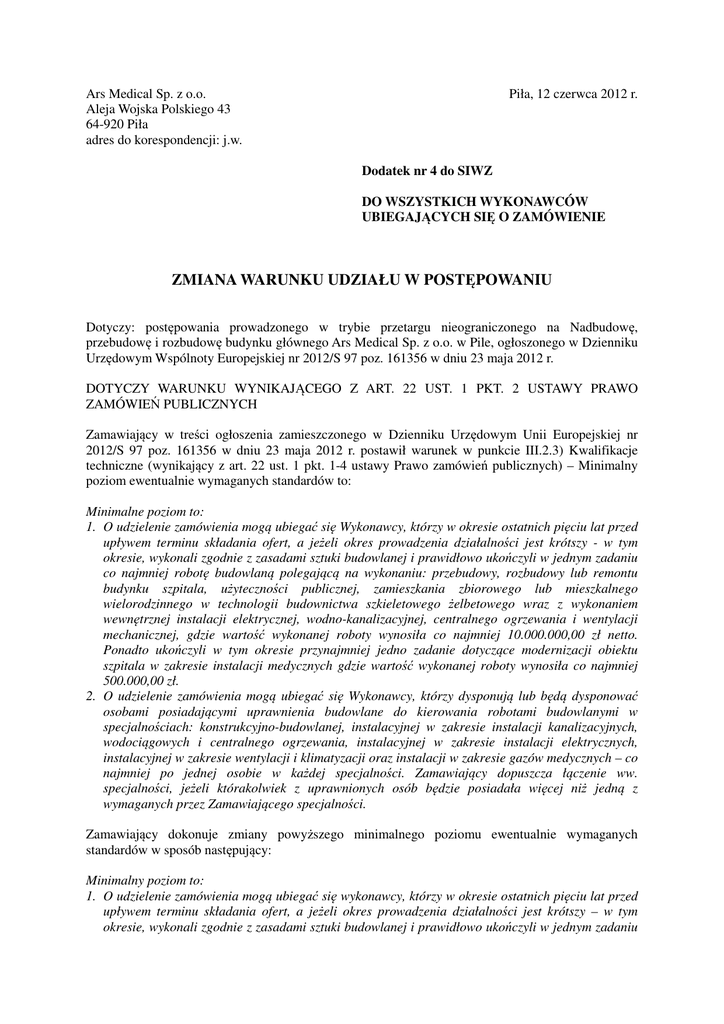 Ars Medical Sp. z o.o. Aleja Wojska Polskiego 43 64-920 Piła adres do korespondencji: j.w. Piła, 12 czerwca 2012 r. Dodatek nr 4 do SIWZ DO WSZYSTKICH WYKONAWCÓW UBIEGAJĄCYCH SIĘ O ZAMÓWIENIE ZMIANA WARUNKU UDZIAŁU W POSTĘPOWANIU Dotyczy: postępowania prowadzonego w trybie przetargu nieograniczonego na Nadbudowę, przebudowę i rozbudowę budynku głównego Ars Medical Sp. z o.o. w Pile, ogłoszonego w Dzienniku Urzędowym Wspólnoty Europejskiej nr 2012/S 97 poz. 161356 w dniu 23 maja 2012 r. DOTYCZY WARUNKU WYNIKAJĄCEGO Z ART. 22 UST. 1 PKT. 2 USTAWY PRAWO ZAMÓWIEŃ PUBLICZNYCH Zamawiający w treści ogłoszenia zamieszczonego w Dzienniku Urzędowym Unii Europejskiej nr 2012/S 97 poz. 161356 w dniu 23 maja 2012 r. postawił warunek w punkcie III.2.3) Kwalifikacje techniczne (wynikający z art. 22 ust. 1 pkt. 1-4 ustawy Prawo zamówień publicznych) – Minimalny poziom ewentualnie wymaganych standardów to: Minimalne poziom to: 1. O udzielenie zamówienia mogą ubiegać się Wykonawcy, którzy w okresie ostatnich pięciu lat przed upływem terminu składania ofert, a jeżeli okres prowadzenia działalności jest krótszy - w tym okresie, wykonali zgodnie z zasadami sztuki budowlanej i prawidłowo ukończyli w jednym zadaniu co najmniej robotę budowlaną polegającą na wykonaniu: przebudowy, rozbudowy lub remontu budynku szpitala, użyteczności publicznej, zamieszkania zbiorowego lub mieszkalnego wielorodzinnego w technologii budownictwa szkieletowego żelbetowego wraz z wykonaniem wewnętrznej instalacji elektrycznej, wodno-kanalizacyjnej, centralnego ogrzewania i wentylacji mechanicznej, gdzie wartość wykonanej roboty wynosiła co najmniej 10.000.000,00 zł netto. Ponadto ukończyli w tym okresie przynajmniej jedno zadanie dotyczące modernizacji obiektu szpitala w zakresie instalacji medycznych gdzie wartość wykonanej roboty wynosiła co najmniej 500.000,00 zł. 2. O udzielenie zamówienia mogą ubiegać się Wykonawcy, którzy dysponują lub będą dysponować osobami posiadającymi uprawnienia budowlane do kierowania robotami budowlanymi w specjalnościach: konstrukcyjno-budowlanej, instalacyjnej w zakresie instalacji kanalizacyjnych, wodociągowych i centralnego ogrzewania, instalacyjnej w zakresie instalacji elektrycznych, instalacyjnej w zakresie wentylacji i klimatyzacji oraz instalacji w zakresie gazów medycznych – co najmniej po jednej osobie w każdej specjalności. Zamawiający dopuszcza łączenie ww. specjalności, jeżeli którakolwiek z uprawnionych osób będzie posiadała więcej niż jedną z wymaganych przez Zamawiającego specjalności. Zamawiający dokonuje zmiany powyższego minimalnego poziomu ewentualnie wymaganych standardów w sposób następujący: Minimalny poziom to: 1. O udzielenie zamówienia mogą ubiegać się wykonawcy, którzy w okresie ostatnich pięciu lat przed upływem terminu składania ofert, a jeżeli okres prowadzenia działalności jest krótszy – w tym okresie, wykonali zgodnie z zasadami sztuki budowlanej i prawidłowo ukończyli w jednym zadaniu co najmniej robotę budowlaną polegającą na wykonaniu: przebudowy, rozbudowy lub remontu budynku szpitala, użyteczności publicznej, zamieszkania zbiorowego lub mieszkalnego wielorodzinnego w technologii budownictwa szkieletowego żelbetowego wraz z wykonaniem wewnętrznej instalacji elektrycznej, wodno-kanalizacyjnej, centralnego ogrzewania i wentylacji mechanicznej, gdzie wartość wykonanej roboty wynosiła co najmniej 10.000.000,00 zł netto lub jeżeli składający ofertę wykonał w okresie ostatnich 5 lat rozbudowę oraz budowę zakładów produkcyjnych na sumę przekraczającą 10 mln netto, a także budowę obiektów mieszkalnych na sumę również ponad 10 mln netto. Ponadto ukończyli w tym okresie przynajmniej jedno zadanie dotyczące modernizacji obiektu szpitala w zakresie instalacji medycznych gdzie wartość wykonanej roboty wynosiła co najmniej 500.000,00 zł netto. 2. O udzielenie zamówienia mogą ubiegać się Wykonawcy, którzy dysponują lub będą dysponować osobami posiadającymi uprawnienia budowlane do kierowania robotami budowlanymi w specjalnościach: konstrukcyjno-budowlanej, instalacyjnej w zakresie instalacji kanalizacyjnych, wodociągowych i centralnego ogrzewania, instalacyjnej w zakresie instalacji elektrycznych, instalacyjnej w zakresie wentylacji i klimatyzacji oraz instalacji w zakresie gazów medycznych – co najmniej po jednej osobie w każdej specjalności. Zamawiający dopuszcza łączenie ww. specjalności, jeżeli którakolwiek z uprawnionych osób będzie posiadała więcej niż jedną z wymaganych przez Zamawiającego specjalności. PRZEDŁUŻENIE TERMINU SKŁADANIA OFERT Zgodnie z treścią art. 12a ust. 1 oraz art. 12a ust. 2 pkt. 1 ustawy Prawo zamówień publicznych, Zamawiający przedłuża termin składania ofert do dnia 4 lipca 2012 roku godz. 1000 (poprzedni termin wyznaczony był na dzień 28 czerwca 2012 roku godz. 1000). W związku z przedłużeniem terminu składania ofert ulega zmianie czas trwania zamówienia lub termin realizacji – rozpoczęcie na 15 lipca 2012 r. (poprzednio 1 lipca 2012 r.). Każda wprowadzona przez Zamawiającego zmiana staje się częścią SIWZ i jest wiążąca dla wszystkich Wykonawców. Pismo zamieszczone na stronie internetowej w dniu 12 czerwca 2012 r.