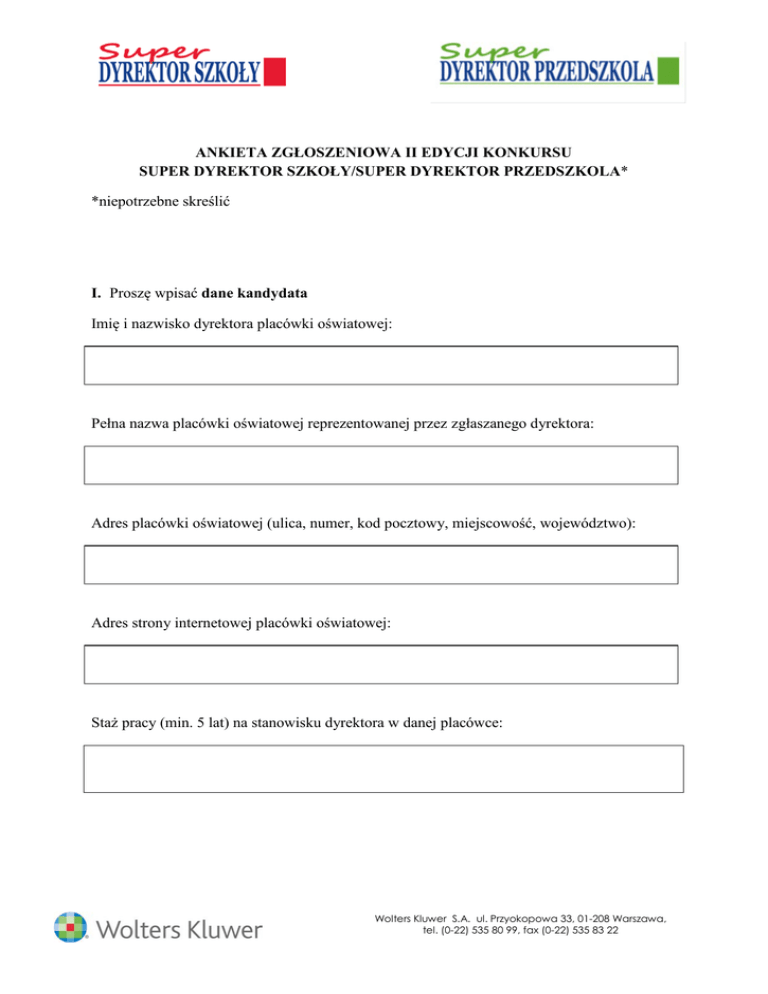 ANKIETA ZGŁOSZENIOWA II EDYCJI KONKURSU SUPER DYREKTOR SZKOŁY/SUPER DYREKTOR PRZEDSZKOLA* *niepotrzebne skreślić I. Proszę wpisać dane kandydata Imię i nazwisko dyrektora placówki oświatowej: Pełna nazwa placówki oświatowej reprezentowanej przez zgłaszanego dyrektora: Adres placówki oświatowej (ulica, numer, kod pocztowy, miejscowość, województwo): Adres strony internetowej placówki oświatowej: Staż pracy (min. 5 lat) na stanowisku dyrektora w danej placówce: Wolters Kluwer S.A. ul. Przyokopowa 33, 01-208 Warszawa, tel. (0-22) 535 80 99, fax (0-22) 535 83 22 II. Proszę odpowiedzieć na poniższe pytania, zachowując określoną dla każdej odpowiedzi liczbę znaków. 1. W jaki sposób wiedza i umiejętności dyrektora wpływają na rozwój szkoły? Konkretne przykłady (1000 znaków): 1) 2) 3) 2. W jakim zakresie dyrektor jest wzorem dla innych? Konkretne przykłady (1000 znaków): 1) 2) 3) 3. Co od czasu, gdy zgłaszany kandydat został powołany na stanowisko dyrektora zmieniło się w szkole na lepsze w zakresie: a) wspierania rozwoju uczniów Konkretne przykłady (1000 znaków): 1) 2) 3) b) wspierania rozwoju współpracowników i budowania zespołu Konkretne przykłady (1000 znaków): 1) 2) 3) c) współpracy z rodzicami Konkretne przykłady (1000 znaków): 1) 2) 3) Wolters Kluwer S.A. ul. Przyokopowa 33, 01-208 Warszawa, tel. (0-22) 535 80 99, fax (0-22) 535 83 22 d) warunków nauki i pracy Konkretne przykłady (1000 znaków): 1) 2) 3) e) integracji społeczności szkolnej wokół celów szkoły Konkretne przykłady (1000 znaków): 1) 2) 3) 4. Jakie projekty placówka, której kandydat jest dyrektorem zainicjowała i prowadzi? Konkretne przykłady (1000 znaków): 1) 2) 3) 5. Inne projekty, w których placówka bierze udział w roku szkolnym 2014/2015: Konkretne przykłady (1000 znaków): • regionalne • ogólnokrajowe • międzynarodowe 6. W jaki sposób (proszę podać przykłady) dyrektor uczestniczy w życiu środowiska lokalnego, regionalnego, krajowego, międzynarodowego i jaki to ma wpływ na rozwój szkoły? Konkretne przykłady (1000 znaków): 1) 2) 3) Wolters Kluwer S.A. ul. Przyokopowa 33, 01-208 Warszawa, tel. (0-22) 535 80 99, fax (0-22) 535 83 22 7. Jakie działania (proszę podać przykłady) dyrektor podejmuje na rzecz rozwoju środowiska zawodowego, np. publikacje, wystąpienia na konferencjach, prowadzenie projektów? Konkretne przykłady (1000 znaków): 1) 2) 3) 8. Inne ważne osiągnięcia dyrektora wpływające na rozwój szkoły. Konkretne przykłady (500 znaków): 1) 2) 3) III. Tu można wpisać uwagi i opinie osób innych niż zgłaszające, np. współpracowników placówki, byłych pracowników, związków zawodowych, uczniów, absolwentów. 1000 znaków IV. Proszę zaznaczyć krzyżykiem załączniki wysłane razem z ankietą: film (maksymalnie 7 minut) prezentacja wywiad fotoblog inne – proszę dopisać jakie………………………. Wolters Kluwer S.A. ul. Przyokopowa 33, 01-208 Warszawa, tel. (0-22) 535 80 99, fax (0-22) 535 83 22 V. Proszę zaznaczyć krzyżykiem, kto zgłasza kandydata: wspólny wniosek społeczności szkolnej (pracownicy, rodzice, uczniowie) pracownicy szkoły rodzice uczniowie inny podmiot, np. instytucja, organizacja, proszę dopisać jaki………………… VI. Proszę wpisać dane jednej osoby do kontaktu: Imię i nazwisko: Adres e-mail: Telefon kontaktowy: Data: Miejscowość: Podpisy osoby/osób zgłaszających: Wolters Kluwer S.A. ul. Przyokopowa 33, 01-208 Warszawa, tel. (0-22) 535 80 99, fax (0-22) 535 83 22