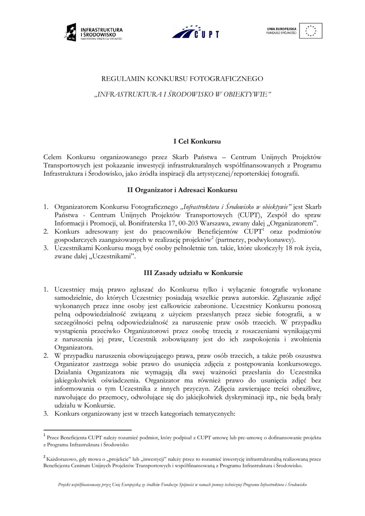 REGULAMIN KONKURSU FOTOGRAFICZNEGO „INFRASTRUKTURA I ŚRODOWISKO W OBIEKTYWIE” I Cel Konkursu Celem Konkursu organizowanego przez Skarb Państwa – Centrum Unijnych Projektów Transportowych jest pokazanie inwestycji infrastrukturalnych współfinansowanych z Programu Infrastruktura i Środowisko, jako źródła inspiracji dla artystycznej/reporterskiej fotografii. II Organizator i Adresaci Konkursu 1. Organizatorem Konkursu Fotograficznego „Infrastruktura i Środowisko w obiektywie” jest Skarb Państwa - Centrum Unijnych Projektów Transportowych (CUPT), Zespół do spraw Informacji i Promocji, ul. Bonifraterska 17, 00-203 Warszawa, zwany dalej „Organizatorem”. 2. Konkurs adresowany jest do pracowników Beneficjentów CUPT1 oraz podmiotów gospodarczych zaangażowanych w realizację projektów2 (partnerzy, podwykonawcy). 3. Uczestnikami Konkursu mogą być osoby pełnoletnie tzn. takie, które ukończyły 18 rok życia, zwane dalej „Uczestnikami”. III Zasady udziału w Konkursie 1. Uczestnicy mają prawo zgłaszać do Konkursu tylko i wyłącznie fotografie wykonane samodzielnie, do których Uczestnicy posiadają wszelkie prawa autorskie. Zgłaszanie zdjęć wykonanych przez inne osoby jest całkowicie zabronione. Uczestnicy Konkursu ponoszą pełną odpowiedzialność związaną z użyciem przesłanych przez siebie fotografii, a w szczególności pełną odpowiedzialność za naruszenie praw osób trzecich. W przypadku wystąpienia przeciwko Organizatorowi przez osobę trzecią z roszczeniami wynikającymi z naruszenia jej praw, Uczestnik zobowiązany jest do ich zaspokojenia i zwolnienia Organizatora. 2. W przypadku naruszenia obowiązującego prawa, praw osób trzecich, a także prób oszustwa Organizator zastrzega sobie prawo do usunięcia zdjęcia z postępowania konkursowego. Działania Organizatora nie wymagają dla swej ważności przesłania do Uczestnika jakiegokolwiek oświadczenia. Organizator ma również prawo do usunięcia zdjęć bez informowania o tym Uczestnika z innych przyczyn. Zdjęcia zawierające treści obraźliwe, nawołujące do przemocy, odwołujące się do jakiejkolwiek dyskryminacji itp., nie będą brały udziału w Konkursie. 3. Konkurs organizowany jest w trzech kategoriach tematycznych: 1 Przez Beneficjenta CUPT należy rozumieć podmiot, który podpisał z CUPT umowę lub pre-umowę o dofinansowanie projektu z Programu Infrastruktura i Środowisko 2 Każdorazowo, gdy mowa o „projekcie” lub „inwestycji” należy przez to rozumieć inwestycję infrastrukturalną realizowaną przez Beneficjenta Centrum Unijnych Projektów Transportowych i współfinansowaną z Programu Infrastruktura i Środowisko. Projekt współfinansowany przez Unię Europejską ze środków Funduszu Spójności w ramach pomocy technicznej Programu Infrastruktura i Środowisko 4. 5. 6. 7. 8. 9. 10. I - Człowiek II – Natura III - Projekt W kategorii „Człowiek” przyjmowane będą prace portretujące ludzi, którzy pracują przy projektach (wykonawcy, inżynierowie i in.), mogą to być portrety lub zdjęcia sytuacyjne. W kategorii „Natura” zgłoszone zdjęcia powinny przedstawiać aspekt środowiskowy obecności inwestycji na tle przyrody (fauny i flory). Zdjęcia w kategorii „Projekt” to ilustracje samej inwestycji, jako efektu sztuki architektonicznej, konstruktorskiej. Nie może to być fotografia makiety, czy wizualizacji inwestycji. W każdej kategorii Uczestnik Konkursu może zgłosić od 3 do 6 zdjęć. Dozwolony jest udział w więcej niż jednej kategorii konkursowej. Organizator dopuszcza prace w formacie nie mniejszym niż A4 wykonane wyłącznie na papierze fotograficznym. Do zdjęć należy dołączyć ich wersje elektroniczne zapisane w formie plików JPG na płycie CD-DVD. Zdjęcia powinny mieć rozdzielczość nie mniejszą niż 300 dpi. Organizatorzy Konkursu pozostawiają decyzji Uczestników wybór techniki fotograficznej. Organizatorzy dopuszczają obróbkę komputerową zdjęć, fotomontaże, zgodne z wizją artystyczną autora fotografii. Zgłoszone do Konkursu zdjęcia mogą być czarno-białe lub kolorowe. Każde ze zdjęć na odwrocie powinno być opisane (w sposób, który nie zniszczy fotografii) jak poniżej: - imię i nazwisko autora, - adres e-mail, - numer telefonu, - nazwa Beneficjenta lub podmiotu zaangażowanego w realizację projektów, adres - kategoria konkursowa, - tytuł zdjęcia i krótka informacja, co ono przedstawia. Do zdjęć i płyty CD-DVD należy dołączyć własnoręcznie podpisane Oświadczenie (wzór Oświadczenia stanowi załącznik do Regulaminu) o nieodpłatnym przeniesieniu autorskich praw majątkowych, zezwoleniu na wykonywanie zależnych prawa autorskich, o wyrażeniu zgody na zachowanie i przetwarzanie danych osobowych, a także uzyskaniu zgody osób, których wizerunki utrwalono na fotografiach na ich wykonanie oraz zgodę na wykorzystanie tych wizerunków w zakresie zachowania i przetwarzanie danych osobowych. Prace należy przesłać na adres: Centrum Unijnych Projektów Transportowych Zespół do spraw Informacji i Promocji ul. Bonifraterska 17 00-203 Warszawa 11. 12. 13. 14. 15. z dopiskiem: Konkurs fotograficzny „Infrastruktura i środowisko w obiektywie”. Termin nadsyłania lub składania prac upływa z dniem 30 września 2010 r. Organizator nie ponosi odpowiedzialności za uszkodzenie i zaginięcie prac w transporcie pocztowym i kurierskim. Organizator nie odsyła prac. Wszystkie fotografie i nośniki CD przechodzą na własność CUPT, jako dokumentacja konkursu. Złożenie Oświadczenia jest warunkiem wzięcia udziału w Konkursie. Organizator zastrzega sobie prawo do wyłączenia z udziału prac, które naruszają Regulamin Konkursu. 2 16. W Konkursie nie mogą brać udziału pracownicy i przedstawiciele Organizatora oraz innych podmiotów biorących bezpośredni udział w przygotowaniu i prowadzeniu Konkursu, a także członkowie ich rodzin i osoby im najbliższe. IV Ocena p