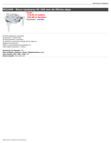 Informacje o produkcie M31049 - Klucz nastawny 91-165 mm do filtrów oleju Cena : 278,05 zł (netto) 342,00 zł (brutto) Producent : Condor do filtrów olejowych i powietrza. zacisk prawo- i lewostronny. do obluzowywania i zaciskania. do obudów w wymiarach od około 105 do 160 mm. długość ramion 60 mm. wejście na grzechotkę lub przedłużkę 1/2'. extra ciężkie wykonanie = 1325 g Gwarancja 12 miesięcy: Tak Stan produktu: Używany / Nowy / Regenerowany: Nowy Czas wysyłki: 24h | 48h | 3 dni: 24h Koszty wysyłki: 21zł | 26zł | 0zł Wygenerowano w programie www.oscGold.com