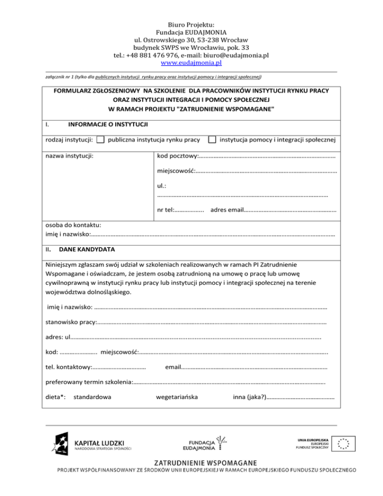 Biuro Projektu: Fundacja EUDAJMONIA ul. Ostrowskiego 30, 53-238 Wrocław budynek SWPS we Wrocławiu, pok. 33 tel.: +48 881 476 976, e-mail: [email protected] www.eudajmonia.pl załącznik nr 1 (tylko dla publicznych instytucji rynku pracy oraz instytucji pomocy i integracji społecznej) FORMULARZ ZGŁOSZENIOWY NA SZKOLENIE DLA PRACOWNIKÓW INSTYTUCJI RYNKU PRACY ORAZ INSTYTUCJI INTEGRACJI I POMOCY SPOŁECZNEJ W RAMACH PROJEKTU "ZATRUDNIENIE WSPOMAGANE" I. INFORMACJE O INSTYTUCJI rodzaj instytucji: publiczna instytucja rynku pracy nazwa instytucji: instytucja pomocy i integracji społecznej kod pocztowy:………………………………………………………………………… miejscowość:…………………………………………………………………………… ul.: …………………………………………………………………………………………… nr tel:……………... adres email………………………………………………… osoba do kontaktu: imię i nazwisko:…………………………………………………………………………………………………………………………………… II. DANE KANDYDATA Niniejszym zgłaszam swój udział w szkoleniach realizowanych w ramach PI Zatrudnienie Wspomagane i oświadczam, że jestem osobą zatrudnioną na umowę o pracę lub umowę cywilnoprawną w instytucji rynku pracy lub instytucji pomocy i integracji społecznej na terenie województwa dolnośląskiego. imię i nazwisko: …………………………………………………………………………………………………………..………………… stanowisko pracy:…………………………………………………………………………………………………………………………… adres: ul…………………………………………................................................................................................. kod: ………………….. miejscowość:…………………………………………………………………………………………………….. tel. kontaktowy:…………………………… email……………………………………………………………………………… preferowany termin szkolenia:………………………………………………………………………………………………………. dieta*: standardowa wegetariańska inna (jaka?)…………………………………… Biuro Projektu: Fundacja EUDAJMONIA ul. Ostrowskiego 30, 53-238 Wrocław budynek SWPS we Wrocławiu, pok. 33 tel.: +48 881 476 976, e-mail: [email protected] www.eudajmonia.pl Oświadczam, że zapoznałem/łam się z regulaminem i w pełni go akceptuję. ……………………………………………………….. (data i czytelny podpis kandydata) Zgodnie z ustawą z dnia 29 sierpnia 1997r. o ochronie danych osobowych (Dz.U. 2002, nr 101, poz. 926 z póź.zm.) wyrażam zgodę na przetwarzanie moich danych do celów rekrutacyjnych w PI Zatrudnienie wspomagane. ……………..……………………………………. (data i czytelny podpis kandydata) ………..……………………………………. (miejscowość, data) ……………………………………………………. (podpis i pieczęć pracodawcy) * właściwe podkreślić Dokumenty prosimy przesłać emailem : [email protected] (podpisany skan; w temacie „Szkolenia dla instytucji”) lub pocztą na adres: Małgorzata Franczak, Fundacja Eudajmonia, ul. Ostrowskiego 30b, pok. 33, 53-238 Wrocław