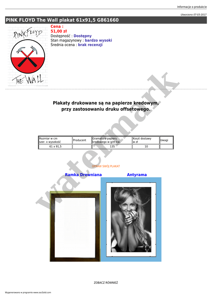 Informacje o produkcie Utworzono 07-03-2017 PINK FLOYD The Wall plakat 61x91,5 G861660 Cena : 51,00 zł er m ar k Dostępność : Dostępny Stan magazynowy : bardzo wysoki Średnia ocena : brak recenzji Plakaty drukowane są na papierze kredowym, przy zastosowaniu druku offsetowego. Rozmiar w cm szer. x wysokość Producent Gramatura papieru kredowego w g/m kw. 61 x 91,5 135 Koszt dostawy w zł 10 OPRAW SWÓJ PLAKAT w at Ramka Drewniana ZOBACZ RÓWNIEŻ Wygenerowano w programie www.oscGold.com Antyrama Uwagi RAMY DREWNIANE er m ar k ANTYRAMY w at TABLICE KORKOWE PLAKATY