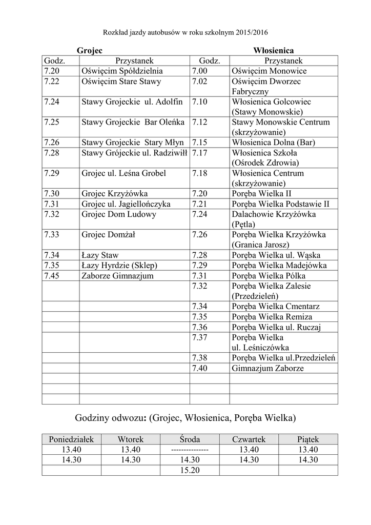Rozkład jazdy autobusów w roku szkolnym 2015/2016 Grojec Godz. 7.20 7.22 Przystanek Oświęcim Spółdzielnia Oświęcim Stare Stawy Godz. 7.00 7.02 7.24 Stawy Grojeckie ul. Adolfin 7.10 7.25 Stawy Grojeckie Bar Oleńka 7.12 7.26 7.28 Stawy Grojeckie Stary Młyn 7.15 Stawy Grójeckie ul. Radziwiłł 7.17 7.29 Grojec ul. Leśna Grobel 7.18 7.30 7.31 7.32 Grojec Krzyżówka Grojec ul. Jagiellończyka Grojec Dom Ludowy 7.20 7.21 7.24 7.33 Grojec Domżał 7.26 7.34 7.35 7.45 Łazy Staw Łazy Hyrdzie (Sklep) Zaborze Gimnazjum 7.28 7.29 7.31 7.32 7.34 7.35 7.36 7.37 7.38 7.40 Włosienica Przystanek Oświęcim Monowice Oświęcim Dworzec Fabryczny Włosienica Golcowiec (Stawy Monowskie) Stawy Monowskie Centrum (skrzyżowanie) Włosienica Dolna (Bar) Włosienica Szkoła (Ośrodek Zdrowia) Włosienica Centrum (skrzyżowanie) Poręba Wielka II Poręba Wielka Podstawie II Dalachowie Krzyżówka (Pętla) Poręba Wielka Krzyżówka (Granica Jarosz) Poręba Wielka ul. Wąska Poręba Wielka Madejówka Poręba Wielka Pólka Poręba Wielka Zalesie (Przedzieleń) Poręba Wielka Cmentarz Poręba Wielka Remiza Poręba Wielka ul. Ruczaj Poręba Wielka ul. Leśniczówka Poręba Wielka ul.Przedzieleń Gimnazjum Zaborze Godziny odwozu: (Grojec, Włosienica, Poręba Wielka) Poniedziałek 13.40 14.30 Wtorek 13.40 14.30 Środa --------------- 14.30 15.20 Czwartek 13.40 14.30 Piątek 13.40 14.30