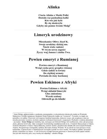 Alinka Ciocia Alinka z Matki Polki Dostała raz paskudnej kolki Kto wie jak było By się skończyło Gdyby nie pomoc Irenki Molgi1 Limeryk urodzinowy Mieszkaniec Oliwy Józef K. Swoje urodziny dzisiaj ma. Niech wiele radości W twym sercu zagości Życzy wuj Janusz i ciotka Twa. Pewien emeryt z Rumianej Pewien emeryt z Rumianej Wciąż czeka przy grządce różanej Gdzie sadzić te kwiaty Do ciężkiej armaty Powiada do żony kochanej Pewien Eskimos z Afryki Pewien Eskimos z Afryki Wciąż układał limeryki Głos zmieniony Wzrok szalony Odwieźli go do kliniki 1 Anna Molga, gdańszczanka z urodzenia, poznanianka z wykształcenia (skończyła studia na Wydziale Malarstwa i Grafiki tamtejszej Akademii Sztuk Pięknych) rzadko się "wystawia". Twierdzi, że nigdy nie potrafiła o to zadbać. Poza tym woli imprezy bardziej kameralne, domowe wręcz, jak urządzane u niej na strychu prywatne wystawy, na które zaprasza wybranych krewnych i znajomych. Pochodzi z rodziny plastyków - jej mama - Irena Molga jest malarką, tata, nieżyjący już Edward Molga, był rzeźbiarzem, choć, jak przyznaje Anna, głównie łowił ryby. Jako scenograf i kostiumolog współpracowała m.in. z Teatrem Muzycznym w Gdyni, Teatrem Miejskim w Gdyni, Operą Bałtycką, teatrem Atelier, projektowała okładki dla serii książek Rolanda Topora. Przygotowuje scenografię i plakaty dla teatru Zielony Wiatrak. W tej chwili na razie porzuca swoje kameralne, wypracowane w najmniejszym szczególe rysunki na rzecz rzeźby. Nie będą to jednak "poważne" dzieła z kamienia czy brązu - w roli tworzywa wystąpi bowiem gotowane w domowym kotle papier mâché. Jest już taki śmieszny pies, uszy trochę mu odpadają - zdradza Molga. Pewien mąż stanu z Azerbejdżanu Pewien mąż stanu z Azerbejdżanu Nie mógł wieczorem przełykać tranu Synek mu rzecze: „Głupi człowiecze Tranu zażywać należy rano” Wysoki Komisarz z Cordoby Wysoki Komisarz z Cordoby Na twarzy paskudne miał dzioby Raz był on w burdelu (Jak czyni to wielu) Nabawił się gorszej choroby