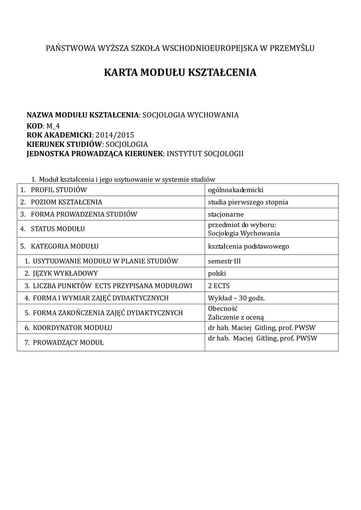 PAŃSTWOWA WYŻSZA SZKOŁA WSCHODNIOEUROPEJSKA W PRZEMYŚLU KARTA MODUŁU KSZTAŁCENIA NAZWA MODUŁU KSZTAŁCENIA: SOCJOLOGIA WYCHOWANIA KOD: M_4 ROK AKADEMICKI: 2014/2015 KIERUNEK STUDIÓW: SOCJOLOGIA JEDNOSTKA PROWADZĄCA KIERUNEK: INSTYTUT SOCJOLOGII I. Moduł kształcenia i jego usytuowanie w systemie studiów 1. PROFIL STUDIÓW ogólnoakademicki 2. POZIOM KSZTAŁCENIA studia pierwszego stopnia 3. FORMA PROWADZENIA STUDIÓW stacjonarne przedmiot do wyboru: Socjologia Wychowania 4. STATUS MODUŁU 5. KATEGORIA MODUŁU kształcenia podstawowego 1. USYTUOWANIE MODUŁU W PLANIE STUDIÓW semestr III 2. JĘZYK WYKŁADOWY polski 3. LICZBA PUNKTÓW ECTS PRZYPISANA MODUŁOWI 2 ECTS 4. FORMA I WYMIAR ZAJĘĆ DYDAKTYCZNYCH Wykład – 30 godz. Obecność Zaliczenie z oceną dr hab. Maciej Gitling, prof. PWSW dr hab. Maciej Gitling, prof. PWSW 5. FORMA ZAKOŃCZENIA ZAJĘĆ DYDAKTYCZNYCH 6. KOORDYNATOR MODUŁU 7. PROWADZĄCY MODUŁ II. Modułowe efekty kształcenia z odniesieniem do kierunku i obszaru efektów kształcenia Kod modułowe efekty kształcenia 1 W_01 W_02 W_03 U_01 U_02 K_01 K_02 Opis efektów kształcenia dla modułu Odniesienie do kierunkowych efektów kształcenia Odniesienie do obszarowych efektów kształcenia 2 3 4 K_W01 S1A_W01 K_W04 S1A_W04 K_W08 S1A_W08 K_U01 S1A_U01 K_U6 S1A_U6 K_K01 S1A_K07 K_K06 S1A_K04 ma podstawową wiedzę w zakresie nauk społecznych i rozumie istotę socjologii jako o nauki społecznej oraz jej miejsce w systemie nauk oraz relacje z innymi naukami ma podstawową wiedzę o rodzajach więzi społecznych i rządzących nimi prawidłowościach, rozumie naturę relacji łączących jednostki, grupy i instytucje społeczne w przedstawionych teoriach socjologicznych Posiada wiedzę dotyczącą dynamiki i statyki zjawisk społecznych w oparciu o omówione teorie socjologiczne Na podstawie poznanych teorii socjologicznych rejestruje i interpretuje zjawiska społeczne tworząc zrozumiałą i sensowną rzeczywistość społeczną W oparciu o znane teorie socjologiczne potrafi formułować sądy dotyczące ludzkiego postępowania, zarówno indywidualnego jak i grupowego Mając świadomość rozległości wiedzy socjologicznej przejawia chęć ciągłego doskonalenia się Doskonali swoją wiedzę w oparciu o nowe teorie socjologiczne a także samodzielne obserwacje i wnioskowania III. Treści kształcenia – oddzielnie dla każdej formy zajęć dydaktycznych (W – wykład; C - ćwiczenia; K – konwersatorium; L - laboratorium; PR – projekt, PKZ - praktyka zawodowa; WT – Warsztat) LICZBA Kod GODZIN TREŚCI MERYTORYCZNE form zajęć dydaktyczny ch W1 W2 W3 W4 W5 Wychowanie jako proces społeczny Pojęcie socjalizacji i jego elementy. Teorie socjalizacji Rola rodziny w procesie socjalizacji Socjologiczne wizje wychowania Rola religii w wychowaniu dzieci i młodzieży 2 2 2 2 2 W6 W7 W8 W9 W10 W11 W12 W13 W14 W15 Grupy rówieśnicze i ich wpływ na wychowanie Rola komunikacji w procesie wychowania Proces wychowawczy i stosunek wychowawczy Wychowanie psychologiczne jako urabianie typów psychicznych Wychowanie a refleksja pedagogiczna Rola instytucji edukacyjnych w wychowaniu Społeczność lokalna i jej wpływ na wychowanie Drama jako forma wychowywania przez sztukę Dzieci i młodzież niepełnosprawna – bariery wychowawcze i edukacyjne Procesy globalizacji a problematyka wychowania 2 2 2 2 2 2 2 2 2 2 RAZEM 30 IV. Literatura podstawowa i uzupełniająca obowiązująca do zaliczenia modułu Literatura podstawowa: 1. F. Znaniecki, Socjologia wychowania, tom 1 i 2, PWN, Warszawa 2001 2. H. Mielicka, Socjologia wychowania. Wybór tekstów, Wyd. ,,Stachurski”, Kielce 2000 3. Sz. Skrzypiec, Wychowanie a biologiczne dziedzictwo człowieka, Wyd. UG, Gdańsk 1999 4. T. Szlendak, Socjologia rodziny, PWN, Warszawa 2010 A. Radziewicz-Winnicki (red.), Współcześni socjologowie o wychowaniu, Wyd. UŚ, Katowice 1993 5. P. Sztompka, Socjologia. Analiza społeczeństwa, Wyd. ,,Znak”, Kraków Literatura uzupełniająca: 1. 2. 3. 4. Z. Kwieciński ( red.), Socjologia Wychowania, Wyd. UMK, Toruń 2000 St. Kawula, J. Brągiel, A. Janke. Pedagogika rodziny, Wyd. ,,Adam Marszałek”, Toruń 2005 H. Domański (red). Zmiany stratyfikacji społecznej w Polsce, PWN, Warszawa 2008 M. Krakowska, Socjologia wychowania. Wybrane elementy. Mechanizmy socjalizacji i edukacja szkolna, Wyd. WSH-E w Łodzi, Łódź 2009 5. Giddens, Socjologia, PWN, Warszawa 2006 6. K.J Tillmann, Teorie socjalizacji. Społeczność, instytucja, upodmiotowienie, Wyd. PWN, Warszawa 2013