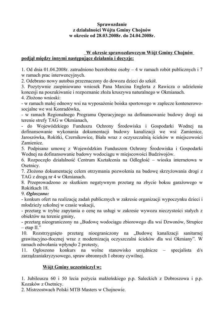 Sprawozdanie z działalności Wójta Gminy Chojnów w okresie od 28.03.2008r. do 24.04.2008r. W okresie sprawozdawczym Wójt Gminy Chojnów podjął między innymi następujące działania i decyzje: 1. Od dnia 01.04.2008r. zatrudniono bezrobotne osoby – 4 w ramach robót publicznych i 7 w ramach prac interwencyjnych. 2. Odebrano nowy autobus przeznaczony do dowozu dzieci do szkół. 3. Pozytywnie zaopiniowano wniosek Pana Marcina Englerta z Rawicza o udzielenie koncesji na poszukiwanie i rozpoznanie złoża kruszywa naturalnego w Okmianach. 4. Złożono wnioski: - w ramach małej odnowy wsi na wyposażenie boiska sportowego w zaplecze kontenerowosocjalne we wsi Konradówka, - w ramach Regionalnego Programu Operacyjnego na dofinansowanie budowy drogi na terenie strefy TAG w Okmianach, - do Wojewódzkiego Funduszu Ochrony Środowiska i Gospodarki Wodnej na dofinansowanie wykonania dokumentacji budowy kanalizacji we wsi Zamienice, Jaroszówka, Rokitki, Czernikowice, Biała wraz z oczyszczalnią ścieków w miejscowości Zamienice. 5. Podpisano umowę z Wojewódzkim Funduszem Ochrony Środowiska i Gospodarki Wodnej na dofinansowanie budowy wodociągu w miejscowości Budziwojów. 6. Rozpoczęło działalność Centrum Kształcenia na Odległość – wioska internetowa w Osetnicy. 7. Złożono dokumentację celem otrzymania pozwolenia na budowę skrzyżowania drogi z TAG z drogą nr 4 w Okmianach. 8. Przeprowadzono ze skutkiem negatywnym przetarg na zbycie boksu garażowego w Rokitkach 18. 9. Ogłoszono: - konkurs ofert na realizację zadań publicznych w zakresie organizacji wypoczynku dzieci i młodzieży szkolnej w czasie wakacji, - przetarg w trybie zapytania o cenę na usługi w zakresie wywozu nieczystości stałych z obiektów na terenie gminy, - przetarg nieograniczony na „Budowę wodociągu zbiorowego dla wsi Dzwonów, Strupice – etap II.” 10. Rozstrzygnięto przetarg nioegraniczony na „Budowę kanalizacji sanitarnej grawitacyjno-tłocznej wraz z modernizacją oczyszczalni ścieków dla wsi Okmiany”. W ramach odwołania wpłynęło 2 protesty, 11. Ogłoszono konkurs na wolne stanowisko urzędnicze – specjalista d/s zarządzaniakryzysowego, spraw obronnych I obrony cywilnej. Wójt Gminy uczestniczył w: 1. Jubileuszu 60 i 50 lecia pożycia małżeńskiego p.p. Saleckich z Dobroszowa i p.p. Kozaków z Osetnicy. 2. Mistrzostwach Polski MTB Masters w Chojnowie. 3. W „Wiosennych Spotkaniach” w Środowiskowym Domu Samopomocy w Piotrowicach. 4. Dolnośląskiej debacie o edukacji z udziałem p. Minister Katarzyny Hall we Wrocławiu. 5. Konferencji dotyczącej programu Leader + zorganizowanej przez Fundację „Wrzosowa Kraina” w Piotrowicach k/ Przemkowa. 6. Otwarciu Gminnego Centrum Edukacji na Odległość w Osetnicy. Wydano: a) Zarządzenia nr: - 84 w sprawie zmiany Zarządzenia nr 64/2007 Wójta Gminy Chojnów dotyczące ogłoszenia wykazu nieruchomości przeznaczonych do sprzedaży (lokale mieszkalne Rokitki 15), - 85 w sprawie ogłoszenia wykazu nieruchomości przeznaczonych do sprzadaży (działki TAG Okmiany), - 86 w sprawie zmian budżetu gminy na rok 2008, - 87 i 88 w sprawie ogłoszenia wykazu nieruchomości przeznaczonych do sprzedaży (działki TAG Okmiany, lokal mieszkalny Konradówka 44/7). b) Postanowienia nr: - 84 w sprawie przeznaczenia nieruchomości stanowiących własność Gminy Chojnów do sprzedaży (lokal mieszkalny Osetnica 43/1), - 85 w sprawie ustalenia dodatkowych dni wolnych od pracy w 2008 roku, - 86 w sprawie przeznaczenia nieruchomości stanowiących własność Gminy Chojnów do sprzedaży (lokal mieszkalny w Goliszowie).