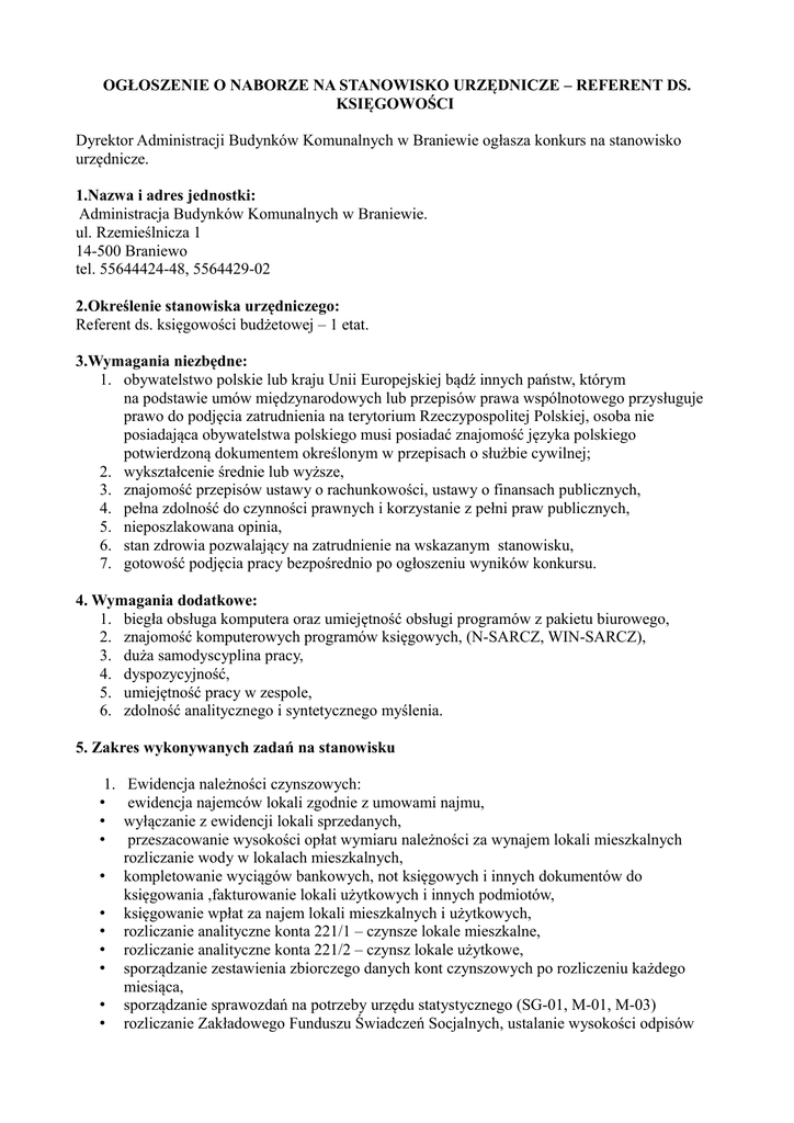 OGŁOSZENIE O NABORZE NA STANOWISKO URZĘDNICZE – REFERENT DS. KSIĘGOWOŚCI Dyrektor Administracji Budynków Komunalnych w Braniewie ogłasza konkurs na stanowisko urzędnicze. 1.Nazwa i adres jednostki: Administracja Budynków Komunalnych w Braniewie. ul. Rzemieślnicza 1 14-500 Braniewo tel. 55644424-48, 5564429-02 2.Określenie stanowiska urzędniczego: Referent ds. księgowości budżetowej – 1 etat. 3.Wymagania niezbędne: 1. obywatelstwo polskie lub kraju Unii Europejskiej bądź innych państw, którym na podstawie umów międzynarodowych lub przepisów prawa wspólnotowego przysługuje prawo do podjęcia zatrudnienia na terytorium Rzeczypospolitej Polskiej, osoba nie posiadająca obywatelstwa polskiego musi posiadać znajomość języka polskiego potwierdzoną dokumentem określonym w przepisach o służbie cywilnej; 2. wykształcenie średnie lub wyższe, 3. znajomość przepisów ustawy o rachunkowości, ustawy o finansach publicznych, 4. pełna zdolność do czynności prawnych i korzystanie z pełni praw publicznych, 5. nieposzlakowana opinia, 6. stan zdrowia pozwalający na zatrudnienie na wskazanym stanowisku, 7. gotowość podjęcia pracy bezpośrednio po ogłoszeniu wyników konkursu. 4. Wymagania dodatkowe: 1. biegła obsługa komputera oraz umiejętność obsługi programów z pakietu biurowego, 2. znajomość komputerowych programów księgowych, (N-SARCZ, WIN-SARCZ), 3. duża samodyscyplina pracy, 4. dyspozycyjność, 5. umiejętność pracy w zespole, 6. zdolność analitycznego i syntetycznego myślenia. 5. Zakres wykonywanych zadań na stanowisku 1. • • • • • • • • • • Ewidencja należności czynszowych: ewidencja najemców lokali zgodnie z umowami najmu, wyłączanie z ewidencji lokali sprzedanych, przeszacowanie wysokości opłat wymiaru należności za wynajem lokali mieszkalnych rozliczanie wody w lokalach mieszkalnych, kompletowanie wyciągów bankowych, not księgowych i innych dokumentów do księgowania ,fakturowanie lokali użytkowych i innych podmiotów, księgowanie wpłat za najem lokali mieszkalnych i użytkowych, rozliczanie analityczne konta 221/1 – czynsze lokale mieszkalne, rozliczanie analityczne konta 221/2 – czynsz lokale użytkowe, sporządzanie zestawienia zbiorczego danych kont czynszowych po rozliczeniu każdego miesiąca, sporządzanie sprawozdań na potrzeby urzędu statystycznego (SG-01, M-01, M-03) rozliczanie Zakładowego Funduszu Świadczeń Socjalnych, ustalanie wysokości odpisów środków ZFŚS na dany rok, • sporządzanie listy pracowników uprawnionych do korzystania z pomocy socjalnej, • realizowanie postanowień Komisji Socjalno -Bytowej. 6. Informacja o warunkach pracy na danym stanowisku: Stanowisko w biurze wieloosobowym, usytuowanym w budynku Administracji Budynków Komunalnych w Braniewie. Praca w wymiarze 8 godzin dziennie, w tym przy komputerze w dni robocze od poniedziałku do piątku. 7. Informacja o wskaźniku zatrudnienia osób niepełnosprawnych: W miesiącu poprzedzającym datę upublicznienia ogłoszenia wskaźnik zatrudnienia osób niepełnosprawnych w jednostce, w rozumieniu przepisów o rehabilitacji zawodowej i społecznej oraz zatrudnianiu osób niepełnosprawnych wynosi 0% . 8. Wymagane dokumenty: 1. 2. 3. 4. 5. 6. list motywacyjny, życiorys (CV), kserokopie dokumentów potwierdzających wykształcenie, kserokopie świadectw pracy, oświadczenie o niekaralności, oświadczenie o braku przeciwwskazań zdrowotnych do pracy na tym stanowisku. 9. Termin i miejsce składania dokumentów: 1. Dokumenty w sprawie naboru na stanowisko referenta ds. księgowości można składać do dnia 29 lipca 2016 r. do godziny 15 w biurze Administracji Budynków Komunalnych w Braniewie, ul. Rzemieślnicza 1 lub przesłać pocztą na adres: Administracja Budynków Komunalnych w Braniewie, ul. Rzemieślnicza 1, 14-500 Braniewo z dopiskiem: dotyczy naboru na stanowisko Referent ds. księgowości . 2. Oferty, które wpłyną do Zakładu po wyznaczonym terminie nie będą rozpatrywane i zostaną zwrócone zainteresowanym. O zachowaniu terminu decyduje data i godzina wpływu do ABK. 10. Pozostałe informacje: 1.Aplikacje, które wpłyną po określonym terminie nie będą rozpatrywane, a te, które nie będą spełniały wymagań formalnych zostaną odrzucone. 2.Osoby spełniające wymagania formalne określone w ogłoszeniu zostaną powiadomieni indywidualnie o terminie kolejnego etapu naboru- rozmowie kwalifikacyjnej- telefonicznie. 3.Informacja o wynikach naboru będzie umieszczona na stronie internetowej BIP Urzędu Miasta Braniewa oraz na tablicy ogłoszeń w siedzibie Administracji Budynków Komunalnych w Braniewie. Zastrzega się wolę zatrudnienia wybranego kandydata na czas określony – okres próbny nie przekraczający trzech miesięcy w celu praktycznego sprawdzenia umiejętności i doświadczenia zawodowego pracownika. Dyrektor Administracji Budynków Komunalnych w Braniewie /Andrzej Piróg/