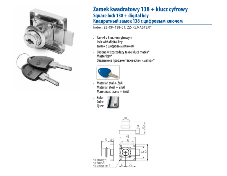 Zamek kwadratowy 138 + klucz cyfrowy Square lock 138 + digital key Квадратный замок 138 с цифровым ключом Index: ZZ-CF-138-01, ZZ-KLMASTER* Zamek z kluczem cyfrowym lock with digital key замок с цифровым ключом • Osobno w szprzedaży także klucz matka* Master key* Отдельно в продаже также ключ «матка»* • • Materiał: stal + ZnAl Material: steel + ZnAl Материал: сталь + ZnAl • Kolor: Color: Цвет: 9 30.5 18 42 32 32 42 22 8.5 4 x otwory 4 4 x holes 4 4 x отверстия 4 17 25
