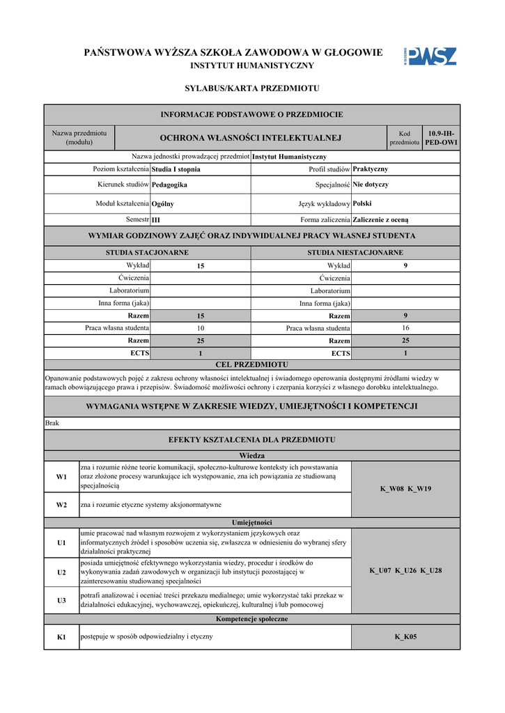 PAŃSTWOWA WYŻSZA SZKOŁA ZAWODOWA W GŁOGOWIE INSTYTUT HUMANISTYCZNY SYLABUS/KARTA PRZEDMIOTU INFORMACJE PODSTAWOWE O PRZEDMIOCIE Nazwa przedmiotu (modułu) Kod 10.9-IHprzedmiotu PED-OWI OCHRONA WŁASNOŚCI INTELEKTUALNEJ Nazwa jednostki prowadzącej przedmiot Instytut Humanistyczny Poziom kształcenia Studia I stopnia Profil studiów Praktyczny Kierunek studiów Pedagogika Specjalność Nie dotyczy Moduł kształcenia Ogólny Język wykładowy Polski Forma zaliczenia Zaliczenie z oceną Semestr III WYMIAR GODZINOWY ZAJĘĆ ORAZ INDYWIDUALNEJ PRACY WŁASNEJ STUDENTA STUDIA STACJONARNE Wykład STUDIA NIESTACJONARNE Wykład 15 Ćwiczenia Ćwiczenia Laboratorium Laboratorium Inna forma (jaka) Inna forma (jaka) 9 Razem 15 Razem 9 Praca własna studenta 10 Praca własna studenta 16 Razem 25 Razem 25 ECTS 1 ECTS 1 CEL PRZEDMIOTU Opanowanie podstawowych pojęć z zakresu ochrony własności intelektualnej i świadomego operowania dostępnymi źródłami wiedzy w ramach obowiązującego prawa i przepisów. Świadomość możliwości ochrony i czerpania korzyści z własnego dorobku intelektualnego. WYMAGANIA WSTĘPNE W ZAKRESIE WIEDZY, UMIEJĘTNOŚCI I KOMPETENCJI Brak EFEKTY KSZTAŁCENIA DLA PRZEDMIOTU Wiedza W1 W2 U1 zna i rozumie różne teorie komunikacji, społeczno-kulturowe konteksty ich powstawania oraz złożone procesy warunkujące ich występowanie, zna ich powiązania ze studiowaną specjalnością K_W08 K_W19 zna i rozumie etyczne systemy aksjonormatywne Umiejętności umie pracować nad własnym rozwojem z wykorzystaniem językowych oraz informatycznych źródeł i sposobów uczenia się, zwłaszcza w odniesieniu do wybranej sfery działalności praktycznej U2 posiada umiejętność efektywnego wykorzystania wiedzy, procedur i środków do wykonywania zadań zawodowych w organizacji lub instytucji pozostającej w zainteresowaniu studiowanej specjalności U3 potrafi analizować i oceniać treści przekazu medialnego; umie wykorzystać taki przekaz w działalności edukacyjnej, wychowawczej, opiekuńczej, kulturalnej i/lub pomocowej K_U07 K_U26 K_U28 Kompetencje społeczne K1 postępuje w sposób odpowiedzialny i etyczny K_K05 TREŚCI KSZTAŁCENIA (PROGRAMOWE) STUDIA STACJONARNE Temat Liczba godzin W Pojęcie prawa autorskiego,praw osobistych i majątkowych 3 Geneza prawa autorskiego, czas ochrony praw, przykłady wykorzystania prawa autorskiego 3 Pojęcie-dozwolony użytek własny, prawo cytatu, zasady korzystania ze źródeł w pracach dyplomowych 3 Ochrona wizerunku, umowy w zakresie prawa autorskiego 3 Prawo prasowe, prawa i zobowiązania dziennikarza 3 RAZEM 15 C L /P 0 0 STUDIA NIESTACJONARNE Temat Liczba godzin W C L /P 9 0 0 Egzamin/ Prace kontrolne Projekty Aktywność na zajęciach 70% 20% 10% pojęcie prawa autorskiego,praw osobistych i majątkowych 2 geneza prawa autorskiego, czas ochrony praw, przykłady wykorzystania prawa autorskiego 2 Pojęcie-dozwolony użytek własny, prawo cytatu, zasady korzystania ze źródeł w pracach dyplomowych 2 ochrona wizerunku, umowy w zakresie prawa autorskiego 2 prawo prasowe, prawa i zobowiązania dziennikarza 1 RAZEM WERYFIKACJA EFEKTÓW KSZTAŁCENIA Kod Opis W1 zna i rozumie różne teorie komunikacji, społeczno-kulturowe konteksty ich powstawania oraz złożone procesy warunkujące ich występowanie, zna ich powiązania ze studiowaną specjalnością W2 zna i rozumie etyczne systemy aksjonormatywne U1 umie pracować nad własnym rozwojem z wykorzystaniem językowych oraz informatycznych źródeł i sposobów uczenia się, zwłaszcza w odniesieniu do wybranej sfery działalności praktycznej U2 posiada umiejętność efektywnego wykorzystania wiedzy, procedur i środków do wykonywania zadań zawodowych w organizacji lub instytucji pozostającej w zainteresowaniu studiowanej specjalności U3 potrafi analizować i oceniać treści przekazu medialnego; umie wykorzystać taki przekaz w działalności edukacyjnej, wychowawczej, opiekuńczej, kulturalnej i/lub pomocowej K1 postępuje w sposób odpowiedzialny i etyczny Waga w werfikacji efektów kształcenia OBCIĄŻENIE PRACĄ STUDENTA 1 2 Godziny zajęć dydaktycznych zgodnie z planem studiów Praca własna studenta Suma ECTS Stacjonarne Niestacjonarne 15 10 25 1 9 16 25 1 LITERATURA Podstawowa 1 Rafał Golat - Prawo autorskie i prawa pokrewne -,Warszawa : C. H. Beck , 2008 2 Janusz Barta, Ryszard Markiewicz: Prawo autorskie i prawa pokrewne. Warszawa: Wolters Kluwer Polska, 2008 Uzupełniajaca 1 Mariusz Załucki - Ochrona własności intelektualnej w polsce- podstawowe mechanizmy i konstrukcje. Wyd. IUS at TAX PAŃSTWOWA WYŻSZA SZKOŁA ZAWODOWA W GŁOGOWIE INSTYTUT HUMANISTYCZNY SYLABUS/KARTA PRZEDMIOTU INFORMACJE PODSTAWOWE O PRZEDMIOCIE Nazwa przedmiotu (modułu) Kod przedmiotu PODSTAWY ERGONOMII i BHP z elementami pedagogiki pracy 16.0-IHPEDPPEBHP Nazwa jednostki prowadzącej przedmiot Instytut Humanistyczny Poziom kształcenia Studia I stopnia Profil studiów Praktyczny Kierunek studiów Pedagogika Specjalność Nie dotyczy Moduł kształcenia Ogólny Język wykładowy Polski Forma zaliczenia Zaliczenie z oceną Semestr VI WYMIAR GODZINOWY ZAJĘĆ ORAZ INDYWIDUALNEJ PRACY WŁASNEJ STUDENTA STUDIA STACJONARNE Wykład STUDIA NIESTACJONARNE Wykład 15 Ćwiczenia Ćwiczenia Laboratorium Laboratorium Inna forma (jaka) Inna forma (jaka) 9 Razem 15 Razem 9 Praca własna studenta 10 Praca własna studenta 16 Razem 25 Razem 25 ECTS 1 ECTS 1 CEL PRZEDMIOTU Uzyskanie wiedzy dotyczącej funkcjonowania bezpieczeństwa i higieny pracy na poziomie zakładu pracy, obowiązków i odpowiedzialności pracodawcy i pracownika. WYMAGANIA WSTĘPNE W ZAKRESIE WIEDZY, UMIEJĘTNOŚCI I KOMPETENCJI Podstawowa wiedza na temat funkcjonowania prawa w Polsce. EFEKTY KSZTAŁCENIA DLA PRZEDMIOTU Wiedza W1 zna podstawy systemu bezpieczeństwa i zasady higieny pracy w instytucjach edukacyjnych i wychowawczych, ich praktyczne uwarunkowania oraz realizacje K_W17 Umiejętności U1 U2 K1 dostrzega związki przyczynow