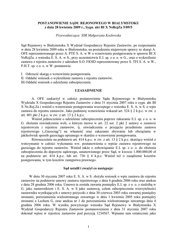 POSTANOWIENIE SĄDU REJONOWEGO W BIAŁYMSTOKU z dnia 28 kwietnia 2009 r., Sygn. akt BI X NsRejZa 5/09/5 Przewodnicząca: SSR Małgorzata Kozłowska Sąd Rejonowy w Białymstoku X Wydział Gospodarczy Rejestru Zastawów, po rozpoznaniu w dniu 28 kwietnia 2009 roku w Białymstoku, na posiedzeniu niejawnym sprawy ze skargi A. OFE reprezentowanego przez A. PTE S. A. w W o wznowienie postępowania w sprawie BI X NsRejZa. z wniosku E. S. A. w S., przy uczestnictwie E.I. sp. z o. o. w G., oraz o wykreślenie zastawu z rejestru zastawów z udziałem S.O. FIOID reprezentowany przez S. TFI S. A. w W., P.H.T. sp. z o. o. w W. postanawia I. Odrzucić skargę o wznowienie postępowania. II. Oddalić wniosek o wykreślenie zastawu z rejestru zastawów. III. Oddalić wniosek o udzielenie zabezpieczenia. UZASADNIENIE A. OFE zaskarżył w całości postanowienie Sądu Rejonowego w Białymstoku Wydziału X Gospodarczego Rejestru Zastawów z dnia 31 stycznia 2007 roku o sygn. akt BI X Ns.Rej.Za i wniósł o wznowienie postępowania wszczętego z wniosku E. S. A. w S. o wpis zastawu do rejestru zastawów. Jako podstawę wznowienia wskazał art. 524 § 2 k.p.c. w zw. z art. 401 pkt 2 k.p.c. w zw. z art. 13 § 2 k.p.c. Wniósł jednocześnie o udzielenie zabezpieczenia poprzez zakazanie E.I. sp. z o. o. w G. złożenia oświadczenia woli, o którym mowa w art. 22 ust. 2 pkt 2 ustawy o zastawie rejestrowym i rejestrze zastawów, tj. oświadczenia o przejęciu przedmiotu zastawu rejestrowego („Gazociąg”) na własność oraz zakazanie zbywania lub obciążania w jakikolwiek sposób gazociągu opisanego w skardze o wznowienie postępowania. Równocześnie na podstawie art. 414 k.p.c. w zw. z art. 13 § 2 k.p.c. skarżący wniósł o wstrzymanie w całości wykonania ww. postanowienia o wpisie zastawu rejestrowego na gazociągu do rejestru zastawów. Wniósł także o zobowiązanie E.I. sp. z o. o. do złożenia zabezpieczenia do depozytu sądowego, ustanowionego przez Sąd, w kwocie 1.000.000,00 zł na podstawie art. 414 k.p.c. lub art. 736 § 4 k.p.c. Wniósł też o zasądzenie kosztów postępowania, w tym kosztów zastępstwa prawnego. Sąd ustalił i zważył co następuje: W dniu 30 stycznia 2007 roku E. S. A. w S. złożyła wniosek o wpis zastawu do rejestru zastawów na podstawie umowy zastawu rejestrowego z dnia 4 grudnia 2006 roku oraz aneksu z dnia 28 grudnia 2006 roku. Umowa ta została zawarta pomiędzy E.I. sp. z o. o. z siedzibą w G. jako zastawnikiem i E. S. A. w S jako zastawcą, celem zabezpieczenia wierzytelności zastawnika wynikających z umowy pożyczki z dnia 30 czerwca 2003 roku zawartej pomiędzy stronami, porozumienia wielostronnego zawartego w dniu 1 kwietnia 2005 roku pomiędzy stronami a Lechem G. oraz aneksu nr 1 do porozumienia wielostronnego zawartego dnia 4 grudnia 2006 roku. W wyniku powyższego wniosku Sąd Rejonowy w Białymstoku X Wydział Gospodarczy Rejestru Zastawów postanowieniem z dnia 31 stycznia 2007 roku dokonał wpisu w rejestrze zastawów pod pozycją 1234567. Wpisano tam ostatecznie jako 1 zastawnika E.I. sp. z o. o., zaś jako zastawcę E. S. A.. Przedmiot zastawu to mienie ruchome przedsiębiorstwa Spółki Akcyjnej. Postanowienie to jest prawomocne. Zgodnie z art. 524 §1 k.p.c. „Uczestnik postępowania może żądać wznowienia postępowania zakończonego prawomocnym postanowieniem orzekającym co do istoty sprawy, jednakże wznowienie postępowania nie jest dopuszczalne, jeżeli postanowienie kończące postępowanie może być zmienione lub uchylone”. Oznacza to, że skarga o wznowienie postępowania w sprawach nieprocesowych, a takim jest postępowanie rejestrowe, jest dopuszczalna jedynie wówczas, gdy nie ma możliwości zmiany lub wykreślenia prawomocnego orzeczenia w innym trybie. Przechodząc na grunt postępowania z zakresu rejestru zastawów należy stwierdzić, że takim trybem jest wniosek o wykreślenie bądź zmianę wpisu w rejestrze zastawów. Dlatego należy uznać, iż w takim przypadku nie jest dopuszczalna skarga o wznowienie postępowania. Skarżący posiada możliwość wytoczenia powództwa o stwierdzenie nieistnienia zastawu rejestrowego. Abstrahując od powyższego, nawet gdyby uznać, że w tej sprawie przysługuje skarga o wznowienie postępowania, to i tak podlegałaby ona odrzuceniu. Stroną bowiem postępowania o wpis zastawu do rejestru zastawów są jedynie podmioty zawierające umowę zastawniczą. Kognicja sądu zastawowego jest bowiem ograniczona do badania umowy zastawniczej. Artykuł 40 ust. 3 ustawy o zastawie rejestrowym i rejestrze zastawów określa zakres sądowego badania merytorycznego wniosku o wpis zastawu do rejestru zastawów i dołączonej do niego umowy. Z tych względów skarżący nie byłby stroną postępowania w sprawie o wpis zastawu do rejestru zastawów, o ile nie byłby stroną umowy o ustanowienie zastawu rejestrowego. Krąg podmiotów będących zainteresowanymi jest ograniczony w tym postępowaniu do tych właśnie podmiotów. Z uwagi na powyższe, inne podmioty nie mogą brać udziału w sprawie, a swoich ewentualnych roszczeń mogą dochodzić w trybie powództwa o ustalenie. Odnośnie punktu II postanowienia, w ocenie Sądu wniosek o wykreślenie zastawu z rejestru zastawów nie jest zasadny. Zgodnie z dyspozycją art. 19 ustawy o zastawie rejestrowym i rejestrze zastawów, w przypadku wygaśnięcia zastawu rejestrowego podlega on wykreśleniu z rejestru zastawów. Wykreślenie zastawu rejestrowego z rejestru powoduje wygaśnięcie zastawu rejestrowego, o ile zastaw nie wygasł wcześniej. W ust. 3 tego artykułu wskazane zostały osoby posiadające legitymację do złożenia wniosku o wykreślenie zastawu z rejestru. Do kręgu osób legitymowanych do złożenia wniosku zalicza się zastawnika, zastawcę oraz osobę, która nabyła przedmiot zastawu rejestrowego. Należy przyjąć również możliwość wykreślenia zastawu na wniosek osoby, która nie była stroną w sprawie o wpis za