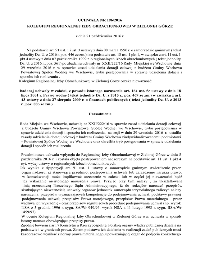 UCHWAŁA NR 196/2016 KOLEGIUM REGIONALNEJ IZBY OBRACHUNKOWEJ W ZIELONEJ GÓRZE z dnia 21 października 2016 r. Na podstawie art. 91 ust. 1 i ust. 3 ustawy z dnia 08 marca 1990 r. o samorządzie gminnym ( tekst jednolity Dz. U. z 2016 r. poz. 446 ze zm.) i na podstawie art. 18 ust. 1 pkt 1, w związku z art. 11 ust. 1 pkt 4 ustawy z dnia 07 października 1992 r. o regionalnych izbach obrachunkowych ( tekst jednolity Dz. U. z 2016 r., poz. 561) po zbadaniu uchwały nr XXII/222/16 Rady Miejskiej we Wschowie dnia 29 września 2016 r. w sprawie: zasad udzielania dotacji celowej z budżetu Gminy Wschowa Powiatowej Spółce Wodnej we Wschowie, trybu postępowania w sprawie udzielenia dotacji i sposobu ich rozliczania , Kolegium Regionalnej Izby Obrachunkowej w Zielonej Górze orzeka nieważność: badanej uchwały w całości, z powodu istotnego naruszenia art. 164 ust. 5c ustawy z dnia 18 lipca 2001 r. Prawo wodne ( tekst jednolity Dz. U. z 2015 r., poz. 469 ze zm.) w związku z art. 43 ustawy z dnia 27 sierpnia 2009 r. o finansach publicznych ( tekst jednolity Dz. U. z 2013 r., poz. 885 ze zm.) Uzasadnienie Rada Miejska we Wschowie, uchwałą nr XXII/222/16 w sprawie zasad udzielania dotacji celowej z budżetu Gminy Wschowa Powiatowej Spółce Wodnej we Wschowie, trybu postępowania w sprawie udzielenia dotacji i sposobu ich rozliczenia, na sesji w dniu 29 września 2016 r. ustaliła zasady udzielania dotacji celowej z budżetu Gminy Wschowa zindywidualizowanemu podmiotowi – Powiatowej Spółce Wodnej we Wschowie oraz określiła tryb postępowania w sprawie udzielania dotacji i sposób ich rozliczenia. Przedmiotowa uchwała wpłynęła do Regionalnej Izby Obrachunkowej w Zielonej Górze w dniu 5 października 2016 r. i została objęta postępowaniem nadzorczym na podstawie art. 11 ust. 1 pkt 4 cyt. wyżej ustawy o regionalnych izbach obrachunkowych. Jak wynika z dyspozycji art. 91 ust. 1 ustawy o samorządzie gminnym stwierdzenie przez organ nadzoru, iż stanowiąca przedmiot postępowania uchwała lub zarządzenie narusza prawo, w konsekwencji może implikować orzeczenie w całości lub w części jej nieważności bądź też wskazanie nieistotnego naruszenia prawa. Przyjąć przy tym należy , za ukształtowaną linią orzeczniczą Naczelnego Sądu Administracyjnego, iż do rodzajów naruszeń przepisów skutkujących nieważnością uchwały organów jednostek samorządu terytorialnego zaliczyć należy naruszenia: przepisów wyznaczających kompetencje do podejmowania uchwał, podstawy prawnej podejmowania uchwał, przepisów Prawa ustrojowego, przepisów Prawa materialnego - przez wadliwą ich wykładnię - oraz przepisów regulujących procedurę podejmowania uchwał (np. wyrok NSA z 3 grudnia 1996 r. sygn. SA/Wr 949/96; wyrok NSA z 11 lutego 1998 r. sygn. IISA/Wr 1459/97). W ocenie Kolegium Regionalnej Izby Obrachunkowej w Zielonej Górze ww. uchwała w sposób istotny narusza obowiązujące przepisy prawa. Zgodnie bowiem z art. 7 Konstytucji Rzeczypospolitej Polskiej organy władzy publicznej działają na podstawie i w granicach prawa. Zatem podstawa ich działania w realizacji zadań publicznych musi każdorazowo wynikać z normy prawa materialnego, upoważniającej organ do podjęcia konkretnego działania. Zakres kompetencji organów jednostki samorządu terytorialnego w zakresie udzielania z budżetu jednostki samorządu terytorialnego pomocy finansowej spółkom wodnym, w formie szczególnego rodzaju wydatku publicznego, tj. dotacji celowej, wyznaczony jest normami ogólnymi wyrażonymi w art. 126, art. 250, art. 251 i art. 252 ustawy z dnia 27 sierpnia 2009 r. o finansach publicznych oraz normami wyrażonymi w art. 164 ust. 5a-5d cyt. wyżej ustawy Prawo wodne. Stosownie do art. 164 ust. 5a cyt. wyżej ustawy Prawo wodne spółki wodne mogą korzystać z pomocy finansowej z budżetów jednostek samorządu terytorialnego na bieżące utrzymanie wód i urządzeń wodnych oraz na finansowanie lub dofinansowanie inwestycji. Pomoc finansowa, polega na udzielaniu dotacji celowej w rozumieniu przepisów ustawy z dnia 27 sierpnia 2009 r. o finansach publicznych z budżetów jednostek samorządu terytorialnego (art. 164 ust. 5b ustawy Prawo wodne). Zgodnie z art. 164 ust. 5c ustawy Prawo wodne, do wyłącznej kompetencji organu stanowiącego należy podjęcie uchwały określającej zasady udzielania dotacji celowej, o której mowa w art. 164 ust. 5b tej ustawy, trybu postępowania w sprawie udzielania dotacji i sposobu jej rozliczania. Analiza norm prawnych zawartych w badanej uchwale nr XXII/222/16 Rady Miejskiej we Wschowie z dnia 29 września 2016 r., opartych o art. 164 ust. 5c ustawy Prawo wodne, uzasadnia zakwalifikowanie tej uchwały do aktów prawa miejscowego. Powyższe w konsekwencji powoduje, iż wszelkie postanowienia wskazanego aktu o charakterze normatywnym, muszą posiadać cechy ogólności i abstrakcyjności. Nie mogą zatem w szczególności odnosić się do konkretnego zindywidualizowanego podmiotu (por. wyrok Wojewódzkiego Sądu Administracyjnego w Krakowie, sygn. II SA/Kr 1688/11 z 23 stycznia 2012 r.). Charakter generalny mają te normy, które określają adresata poprzez wskazanie cech, nie zaś poprzez ich wymienienie. Abstrakcyjność normy wyraża się natomiast w tym, że nakazywane, zakazywane albo dozwolone postępowanie ma mieć miejsce w pewnych, z reguły powtarzalnych, okolicznościach, nie zaś w jednej konkretnej sytuacji. O tym, czy w danym przypadku dojdzie do zawężenia grupy adresatów poprzez wskazanie kryterium ich wyodrębnienia, decyduje każdorazowo zarówno rodzaj aktu prawa miejscowego, jak i rodzaj regulowanej materii. Generalnemu charakterowi norm, zdaniem Kolegium, nie przeczą odniesienia do nazw podmiotów będących odbiorcami ewentualnych postanowień uchwał podjętych na podstawie art. 164 ustawy Prawo wodne, tj. spółek wodnych. Zgodnie z art. 164 ust. 1 ustawy spółki wodne są formami organizacyjnymi, które nie dzia