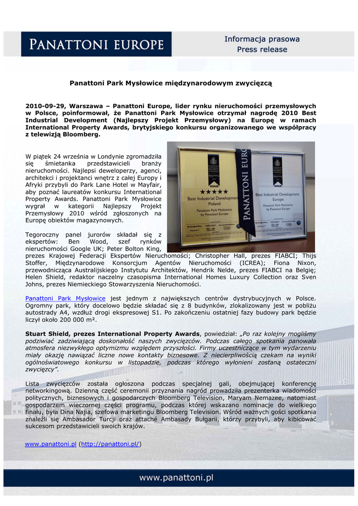Panattoni Park Mysłowice międzynarodowym zwycięzcą 2010-09-29, Warszawa – Panattoni Europe, lider rynku nieruchomości przemysłowych w Polsce, poinformował, że Panattoni Park Mysłowice otrzymał nagrodę 2010 Best Industrial Development (Najlepszy Projekt Przemysłowy) na Europę w ramach International Property Awards, brytyjskiego konkursu organizowanego we współpracy z telewizją Bloomberg. W piątek 24 września w Londynie zgromadziła się śmietanka przedstawicieli branży nieruchomości. Najlepsi deweloperzy, agenci, architekci i projektanci wnętrz z całej Europy i Afryki przybyli do Park Lane Hotel w Mayfair, aby poznać laureatów konkursu International Property Awards. Panattoni Park Mysłowice wygrał w kategorii Najlepszy Projekt Przemysłowy 2010 wśród zgłoszonych na Europę obiektów magazynowych. Tegoroczny panel jurorów składał się z ekspertów: Ben Wood, szef rynków nieruchomości Google UK; Peter Bolton King, prezes Krajowej Federacji Ekspertów Nieruchomości; Christopher Hall, prezes FIABCI; Thijs Stoffer, Międzynarodowe Konsorcjum Agentów Nieruchomości (ICREA); Fiona Nixon, przewodnicząca Australijskiego Instytutu Architektów, Hendrik Nelde, prezes FIABCI na Belgię; Helen Shield, redaktor naczelny czasopisma International Homes Luxury Collection oraz Sven Johns, prezes Niemieckiego Stowarzyszenia Nieruchomości. Panattoni Park Mysłowice jest jednym z największych centrów dystrybucyjnych w Polsce. Ogromny park, który docelowo będzie składać się z 8 budynków, zlokalizowany jest w pobliżu autostrady A4, wzdłuż drogi ekspresowej S1. Po zakończeniu ostatniej fazy budowy park będzie liczył około 200 000 m². Stuart Shield, prezes International Property Awards, powiedział: „Po raz kolejny mogliśmy podziwiać zadziwiającą doskonałość naszych zwycięzców. Podczas całego spotkania panowała atmosfera niezwykłego optymizmu względem przyszłości. Firmy uczestniczące w tym wydarzeniu miały okazję nawiązać liczne nowe kontakty biznesowe. Z niecierpliwością czekam na wyniki ogólnoświatowego konkursu w listopadzie, podczas którego wyłonieni zostaną ostateczni zwycięzcy”. Lista zwycięzców została ogłoszona podczas specjalnej gali, obejmującej konferencję networkingową. Dzienną część ceremonii przyznania nagród prowadziła prezenterka wiadomości politycznych, biznesowych i gospodarczych Bloomberg Television, Maryam Nemazee, natomiast gospodarzem wieczornej części programu, podczas której wskazano nominacje do wielkiego finału, była Dina Najia, szefowa marketingu Bloomberg Television. Wśród ważnych gości spotkania znaleźli się Ambasador Turcji oraz attaché Ambasady Bułgarii, którzy przybyli, aby kibicować sukcesom przedstawicieli swoich krajów. www.panattoni.pl (http://panattoni.pl/) Dodatkowe informacje: Anita Pietrykowska, Panattoni Europe, tel. 022 540 73 02, [email protected] Ewelina Ciuchta, KONKRET PR tel. 508 338 267, [email protected] O Panattoni Europe Panattoni Europe jest częścią Panattoni Development Company, jednego z największych deweloperów powierzchni przemysłowych na świecie, prowadzącego działalność w 40 oddziałach w Ameryce Północnej i Europie. Panattoni obecny jest w Europie Środkowej od 2005 roku i przez ten czas zrealizował 36 projekty o łącznej wartości 648 mln EUR. Deweloper wybudował dotychczas w Polsce i Czechach ok. 1,2 miliona m2 nowoczesnej powierzchni przemysłowej. W ramach Panattoni Europe działa struktura, dedykowana projektom dopasowanym do indywidualnych potrzeb najemców, typu build-to-suit. Wśród kluczowych klientów są takie firmy jak arvato services Polska, Coty Cosmetics, DSV, H&M, Intermarché, Leroy Merlin, ND Logistics, Still, Schenker i Tesco. Oprócz Polski Panattoni Europe ma swoje przedstawicielstwa w Wielkiej Brytanii, Czechach, Francji, Włoszech, Hiszpanii, Luksemburgu i Niemczech. O konkursie International Property Awards Europe & Africa Property Awards przyznawane we współpracy z Bloomberg Television zaliczają się do grona nagród International Property Awards, które przyznaje się od 16 lat w kategoriach obejmujących nieruchomości mieszkaniowe oraz komercyjne. W tym roku reprezentowanych było ponad 40 krajów, w tym po raz pierwszy Norwegia, Namibia, Mozambik oraz Łotwa. Jeszcze w tym roku najlepsi uczestnicy konkursu Europe & Africa Property Awards wezmą udział w rywalizacji z firmami z Wielkiej Brytanii, regionu Azji i Pacyfiku, Ameryk oraz Półwyspu Arabskiego i będą ubiegać się o tytuł World’s Best w swojej kategorii.