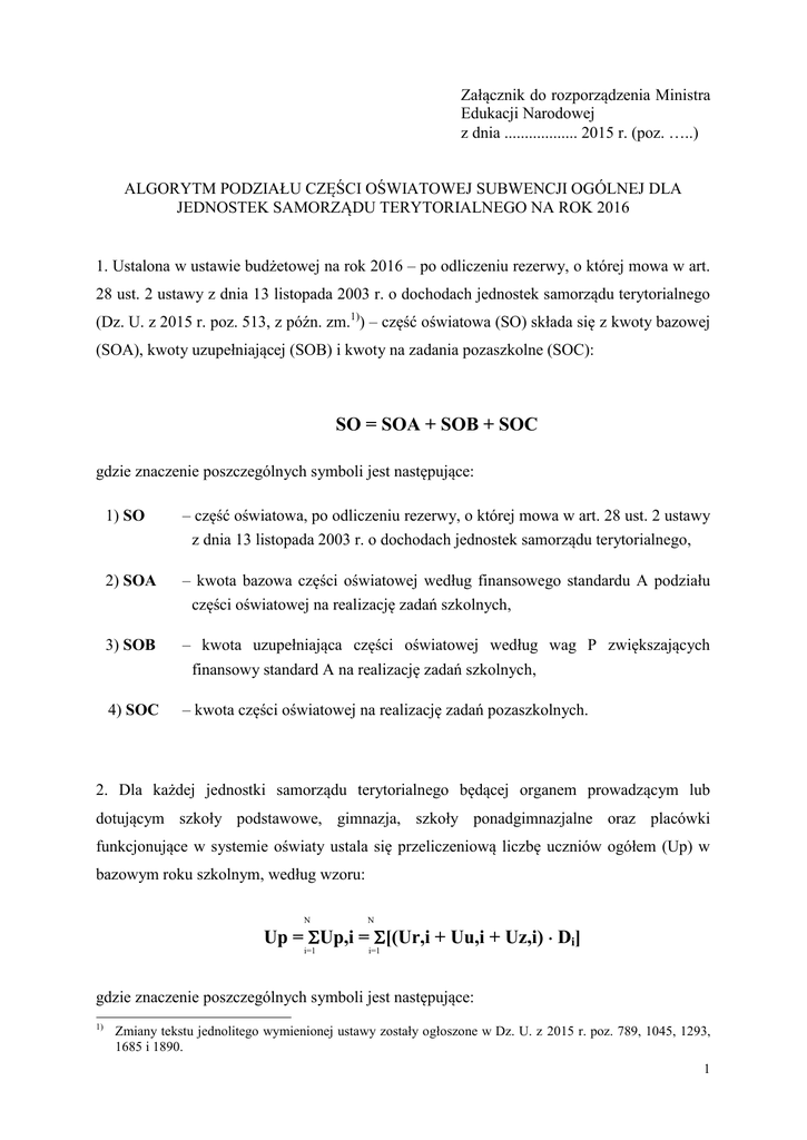 Załącznik do rozporządzenia Ministra Edukacji Narodowej z dnia .................. 2015 r. (poz. …..) ALGORYTM PODZIAŁU CZĘŚCI OŚWIATOWEJ SUBWENCJI OGÓLNEJ DLA JEDNOSTEK SAMORZĄDU TERYTORIALNEGO NA ROK 2016 1. Ustalona w ustawie budżetowej na rok 2016 – po odliczeniu rezerwy, o której mowa w art. 28 ust. 2 ustawy z dnia 13 listopada 2003 r. o dochodach jednostek samorządu terytorialnego (Dz. U. z 2015 r. poz. 513, z późn. zm.1)) – część oświatowa (SO) składa się z kwoty bazowej (SOA), kwoty uzupełniającej (SOB) i kwoty na zadania pozaszkolne (SOC): SO = SOA + SOB + SOC gdzie znaczenie poszczególnych symboli jest następujące: 1) SO – część oświatowa, po odliczeniu rezerwy, o której mowa w art. 28 ust. 2 ustawy z dnia 13 listopada 2003 r. o dochodach jednostek samorządu terytorialnego, 2) SOA – kwota bazowa części oświatowej według finansowego standardu A podziału części oświatowej na realizację zadań szkolnych, 3) SOB – kwota uzupełniająca części oświatowej według wag P zwiększających finansowy standard A na realizację zadań szkolnych, 4) SOC – kwota części oświatowej na realizację zadań pozaszkolnych. 2. Dla każdej jednostki samorządu terytorialnego będącej organem prowadzącym lub dotującym szkoły podstawowe, gimnazja, szkoły ponadgimnazjalne oraz placówki funkcjonujące w systemie oświaty ustala się przeliczeniową liczbę uczniów ogółem (Up) w bazowym roku szkolnym, według wzoru: N N i=1 i=1 Up = Up,i = [(Ur,i + Uu,i + Uz,i) Di] gdzie znaczenie poszczególnych symboli jest następujące: 1) Zmiany tekstu jednolitego wymienionej ustawy zostały ogłoszone w Dz. U. z 2015 r. poz. 789, 1045, 1293, 1685 i 1890. 1 2 1) Up – przeliczeniowa liczba uczniów ogółem; 2) Up,i – przeliczeniowa liczba uczniów w i-tej jednostce samorządu terytorialnego, z uwzględnieniem indeksu i: od 1 do Lg dla gmin (w tym dla miast na prawach powiatu w zakresie wykonywanych zadań gminy), od Lg +1 do Lm dla miast na prawach powiatu, od Lm+1 do Lp dla pozostałych powiatów, od Lp+1 do Ls dla samorządów województw, w bazowym roku szkolnym gdzie: Lg – oznacza liczbę gmin (w tym dla miast na prawach powiatu w zakresie wykonywanych zadań gminy) według stanu na dzień 1 stycznia 2016 r., Lm – oznacza sumę liczby gmin Lg i liczby miast na prawach powiatu według stanu na dzień 1 stycznia 2016 r., Lp – oznacza sumę liczby gmin Lg i liczby powiatów wraz z miastami na prawach powiatu według stanu na dzień 1 stycznia 2016 r., Ls – oznacza liczbę wszystkich jednostek samorządu terytorialnego powiększoną o liczbę miast na prawach powiatu według stanu na dzień 1 stycznia 2016 r.; 3) Ur,i – statystyczna liczba uczniów w i-tej jednostce samorządu terytorialnego, ustalona na podstawie danych systemu informacji oświatowej dla bazowego roku szkolnego według stanu na dzień 30 września 2015 r. i dzień 10 października 2015 r., obliczana według wzoru: Ur,i = Sa,i +0,7Sb,i+ 0,35Sc,i+0,5Sd,i+0,25Se,i+0,6Sf,i gdzie: Sa,i – oznacza liczbę uczniów szkół publicznych i niepublicznych dla dzieci i młodzieży, a także słuchaczy zakładów kształcenia nauczycieli oraz kolegiów pracowników służb społecznych, które prowadzą kształcenie w systemie dziennym, w i-tej jednostce samorządu terytorialnego, z wyłączeniem liczby uczniów spełniających obowiązek szkolny lub obowiązek nauki poza szkołą zgodnie z art. 16 ust. 8 ustawy wymienionej w § 1 ust. 1 rozporządzenia, 3 Sb,i – oznacza liczbę uczniów szkół publicznych dla dorosłych kształcących w formie stacjonarnej, a także słuchaczy zakładów kształcenia nauczycieli oraz kolegiów pracowników służb społecznych, które prowadzą kształcenie w systemie wieczorowym lub zaocznym, w i-tej jednostce samorządu terytorialnego, Sc,i – oznacza liczbę uczniów szkół niepublicznych dla dorosłych, kształcących w formie stacjonarnej, w i-tej jednostce samorządu terytorialnego, Sd,i – oznacza liczbę uczniów szkół publicznych dla dorosłych kształcących w formie zaocznej, w i-tej jednostce samorządu terytorialnego, Se,i – oznacza liczbę uczniów szkół niepublicznych dla dorosłych, kształcących w formie zaocznej, w i-tej jednostce samorządu terytorialnego, Sf,i – oznacza liczbę uczniów spełniających obowiązek szkolny lub obowiązek nauki poza szkołą zgodnie z art. 16 ust. 8 ustawy wymienionej w § 1 ust. 1 rozporządzenia; indeks i: od 1 do Ls; 4) Uu,i – uzupełniająca liczba uczniów w bazowym roku szkolnym w zakresie zadań szkolnych, obliczana według wzoru: Uu,i = P1 N1,i + P2 N2,i + ... + P36 N 36,i gdzie: – P1 do P36 oznaczają wagi, – N1 do N36 oznaczają przypisane wagom liczebności uczniów w jednostce samorządu terytorialnego z indeksem i od 1 do Ls, określone następująco: P1 = 0,40 dla uczniów szkół podstawowych dla dzieci i młodzieży zlokalizowanych na terenach wiejskich lub w miastach do 5000 mieszkańców – N1,i, P2 = 0,27 dla uczniów gimnazjów dla dzieci i młodzieży zlokalizowanych na terenach wiejskich lub w miastach do 5000 mieszkańców – N2,i, 4 P3 = 0,18 dodatkowo dla uczniów szkół podstawowych dla dzieci i młodzieży, w których różnica pomiędzy liczbą uczniów szkoły przyjętą do podziału części oświatowej a liczbą uczniów przeliczoną wagami P13, P14, P15 nie przekracza 70 (waga nie obejmuje uczniów przeliczanych wagami P13, P14, P15 oraz uczniów szkół podstawowych specjalnych) – N3,i, P4 = 1,40 dla uczniów z niepełnosprawnością intelektualną w stopniu lekkim, niedostosowanych społecznym (na społecznie, podstawie zagrożonych orzeczeń o niedostosowaniem potrzebie kształcenia specjalnego, o których mowa w art. 71b ust. 3 ustawy wymienionej w § 1 ust. 1 rozporządzenia), dla uczniów z zaburzeniami zachowania, zagrożonych uzależnieniem, z chorobami przewlekłymi (na podstawie orzeczeń o potrzebie kształcenia specjalnego, o kt