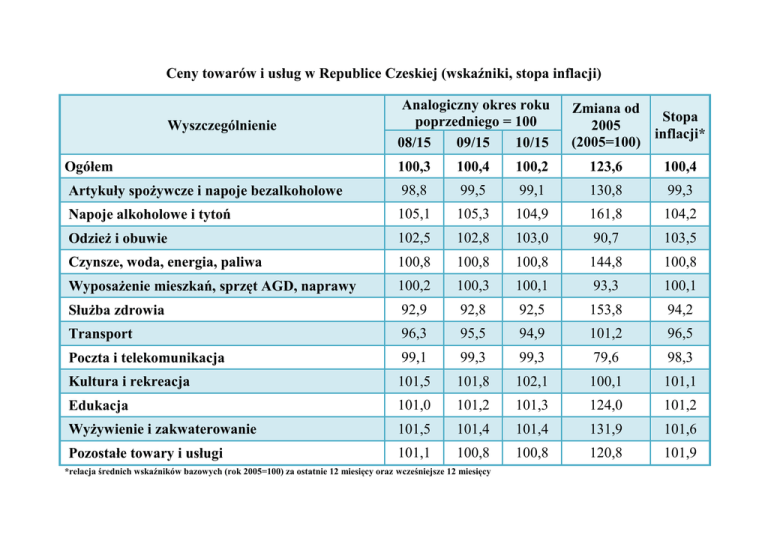 Ceny towarów i usług w Republice Czeskiej (wskaźniki, stopa inflacji) Wyszczególnienie Analogiczny okres roku poprzedniego = 100 08/15 09/15 10/15 Zmiana od Stopa 2005 inflacji* (2005=100) Ogółem 100,3 100,4 100,2 123,6 100,4 Artykuły spożywcze i napoje bezalkoholowe 98,8 99,5 99,1 130,8 99,3 Napoje alkoholowe i tytoń 105,1 105,3 104,9 161,8 104,2 Odzież i obuwie 102,5 102,8 103,0 90,7 103,5 Czynsze, woda, energia, paliwa 100,8 100,8 100,8 144,8 100,8 Wyposażenie mieszkań, sprzęt AGD, naprawy 100,2 100,3 100,1 93,3 100,1 Służba zdrowia 92,9 92,8 92,5 153,8 94,2 Transport 96,3 95,5 94,9 101,2 96,5 Poczta i telekomunikacja 99,1 99,3 99,3 79,6 98,3 Kultura i rekreacja 101,5 101,8 102,1 100,1 101,1 Edukacja 101,0 101,2 101,3 124,0 101,2 Wyżywienie i zakwaterowanie 101,5 101,4 101,4 131,9 101,6 Pozostałe towary i usługi 101,1 100,8 100,8 120,8 101,9 *relacja średnich wskaźników bazowych (rok 2005=100) za ostatnie 12 miesięcy oraz wcześniejsze 12 miesięcy