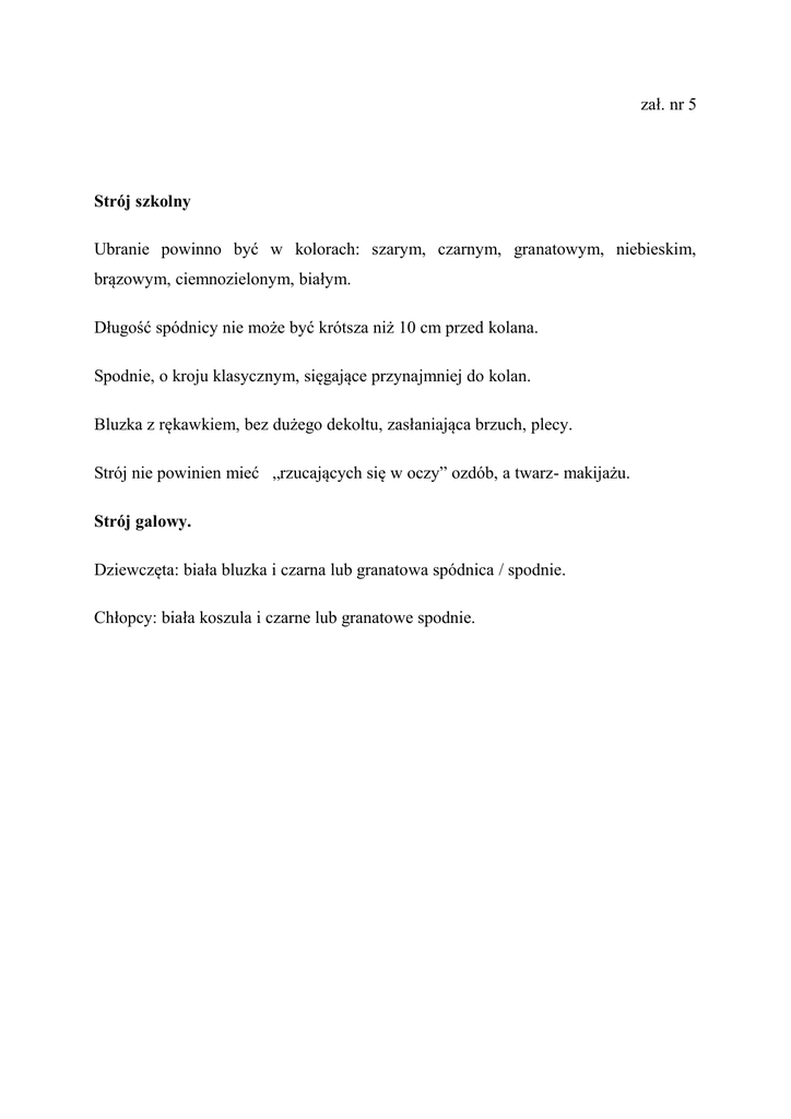 zał. nr 5 Strój szkolny Ubranie powinno być w kolorach: szarym, czarnym, granatowym, niebieskim, brązowym, ciemnozielonym, białym. Długość spódnicy nie może być krótsza niż 10 cm przed kolana. Spodnie, o kroju klasycznym, sięgające przynajmniej do kolan. Bluzka z rękawkiem, bez dużego dekoltu, zasłaniająca brzuch, plecy. Strój nie powinien mieć „rzucających się w oczy” ozdób, a twarz- makijażu. Strój galowy. Dziewczęta: biała bluzka i czarna lub granatowa spódnica / spodnie. Chłopcy: biała koszula i czarne lub granatowe spodnie.