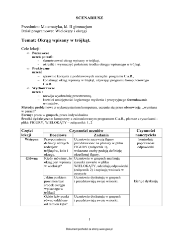 SCENARIUSZ Przedmiot: Matematyka, kl. II gimnazjum Dział programowy: Wielokąty i okręgi Temat: Okrąg wpisany w trójkąt. Cele lekcji: • Poznawcze uczeń potrafi: - skonstruować okrąg wpisany w trójkąt, - określić i wyznaczyć położenie środka okręgu wpisanego w trójkąt. • Praktyczne uczeń: − sprawnie korzysta z podstawowych narzędzi programu C.a.R., − konstruuje okrąg wpisany w trójkąt, używając programu komputerowego C.a.R. • Wychowawcze uczeń : − rozwija wyobraźnię przestrzenną, − kształci umiejętności logicznego myślenia i precyzyjnego formułowania wniosków. Metody: problemowa z wykorzystaniem komputera, uczenie się przez obserwację, „wymiana w parach” Formy: praca w grupach, praca indywidualna Środki dydaktyczne: komputery z zainstalowanym programem C.a.R., plansze z rysunkami pliki: FIGURY, WIELOKĄTY – załączniki: 1, 2 Części lekcji Wstępna Główna Czynności uczniów Docelowe Zadania Przypomnienie definicji różnych rodzajów trójkątów, koła i okręgu. Kiedy mówimy, że okrąg jest wpisany w wielokąt? Jakim punktem powinien być środek okręgu wpisanego w trójkąt? Gdzie leży punkt równo oddalony od ramion kąta? Uczniowie nazywają figury przedstawione na planszy w pliku FIGURY (załącznik 1), wskazane osoby podają definicję określonej figury. Uczniowie w grupach analizują rysunki zawarte w pliku WIELOKĄTY, udzielają odpowiedzi (załącznik 2) i zapisują wniosek w zeszycie Uczniowie dyskutują w grupach i przedstawiają swoje wnioski. Uczniowie dyskutują w grupach i przedstawiają swoje wnioski. 1 Dokument pochodzi ze strony www.gwo.pl Czynności nauczyciela kontroluje poprawność odpowiedzi kieruje dyskusją W jaki sposób można wyznaczyć punkty jednakowo oddalone od ramion kąta? Zadanie 1 W aplikacji C.a.R uczniowie rysują kąt i konstruują dwusieczną. Przykładowa konstrukcja kontroluje poprawność konstrukcji Konstrukcja Zadanie 2 okręgu wpisanego W programie C.a.R. rysują trójkąt w trójkąt. ostrokątny, wyznaczają dwusieczne kątów, konstruują i wyznaczają promień, konstruują okrąg wpisany w trójkąt. Czy trzeba rysować wszystkie dwusieczne? Wnioski zapisują w zeszycie. kontroluje poprawność konstrukcji i wskazuje grupę przedstawiającą wnioski Przykładowa konstrukcja Czy w każdy trójkąt można wpisać okrąg? Zadanie 3 Wykorzystując narzędzia programu C.a.R. i konstrukcję wykonaną w zadaniu 2 uczniowie przesuwają jeden z wierzchołków trójkąta tak, aby uzyskać: • trójkąt prostokątny, • trójkąt rozwartokątny. Czy w każdy trójkąt można wpisać okrąg? kontroluje poprawność konstrukcji i wskazuje grupę przedstawiającą wnioski Przykładowa konstrukcja Rozwiązanie zadania. Wnioski zapisują w zeszycie. Uczniowie rozwiązują w grupach zadania 1, 2 str.168 – Podręcznik. 2 Dokument pochodzi ze strony www.gwo.pl wskazuje grupę przedstawiającą wnioski Końcowa Podsumowanie lekcji. Co zapamiętałaś/zapamiętałeś z dzisiejszej lekcji? – „wymiana w parach”. Zadanie domowe: Podręcznik, str.168 zadanie 3. Opracowała: Sławomira Pawlak – Zespół Szkół Nr 3 w Kościanie ZAŁĄCZNIK1 - Figury 1. 2. 3. 4. 5. ZAŁĄCZNIK 2 - Wielokąty Który okrąg jest wpisany w wielokąt? 1 2. 3. 3 Dokument pochodzi ze strony www.gwo.pl