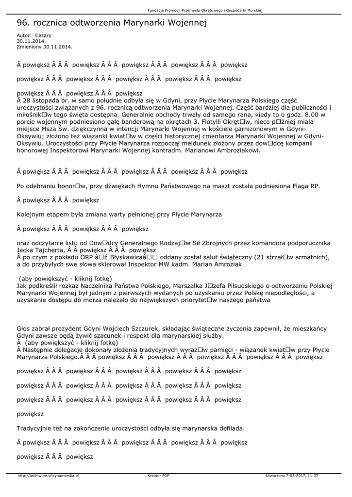 Fundacja Promocji Przemysłu Okrętowego i Gospodarki Morskiej 96. rocznica odtworzenia Marynarki Wojennej Autor: Cezary 30.11.2014. Zmieniony 30.11.2014.  powiększ    powiększ    powiększ    powiększ    powiększ powiększ    powiększ    powiększ    powiększ    powiększ powiększ    powiększ    powiększ  28 listopada br. w samo południe odbyła się w Gdyni, przy Płycie Marynarza Polskiego część uroczystości związanych z 96. rocznicą odtworzenia Marynarki Wojennej. Część bardziej dla publiczności i miłośnikÃłw tego święta dostępna. Generalnie obchody trwały od samego rana, kiedy to o godz. 8.00 w porcie wojennym podniesiono galę banderową na okrętach 3. Flotylli OkrętÃłw, nieco pÃłźniej miała miejsce Msza Św. dziękczynna w intencji Marynarki Wojennej w kościele garnizonowym w GdyniOksywiu; złożono też wiązanki kwiatÃłw w części historycznej cmentarza Marynarki Wojennej w GdyniOksywiu. Uroczystości przy Płycie Marynarza rozpoczął meldunek złożony przez dowÃłdcę kompanii honorowej Inspektorowi Marynarki Wojennej kontradm. Marianowi Ambroziakowi.  powiększ    powiększ    powiększ    powiększ    powiększ Po odebraniu honorÃłw, przy dźwiękach Hymnu Państwowego na maszt została podniesiona Flaga RP.  powiększ    powiększ Kolejnym etapem była zmiana warty pełnionej przy Płycie Marynarza  powiększ    powiększ    powiększ oraz odczytanie listu od DowÃłdcy Generalnego RodzajÃłw Sił Zbrojnych przez komandora podporucznika Jacka Tajcherta,   powiększ    powiększ  po czym z pokładu ORP „Błyskawica― oddany został salut świąteczny (21 strzałÃłw armatnich), a do przybyłych swe słowa skierował Inspektor MW kadm. Marian Amroziak (aby powiększyć - kliknij fotkę) Jak podkreślił rozkaz Naczelnika Państwa Polskiego, Marszałka JÃłzefa Piłsudskiego o odtworzeniu Polskiej Marynarki Wojennej był jednym z pierwszych wydanych po uzyskaniu przez Polskę niepodległości, a uzyskanie dostępu do morza należało do największych priorytetÃłw naszego państwa Głos zabrał prezydent Gdyni Wojciech Szczurek, składając świąteczne życzenia zapewnił, że mieszkańcy Gdyni zawsze będą żywić szacunek i respekt dla marynarskiej służby.  (aby powiększyć - kliknij fotkę)  Następnie delegacje dokonały złożenia tradycyjnych wyrazÃłw pamięci - wiązanek kwiatÃłw przy Płycie Marynarza Polskiego.   powiększ    powiększ    powiększ    powiększ    powiększ powiększ    powiększ    powiększ    powiększ    powiększ powiększ    powiększ    powiększ    powiększ    powiększ powiększ    powiększ    powiększ    powiększ    powiększ powiększ Tradycyjnie też na zakończenie uroczystości odbyła się marynarska defilada.  powiększ    powiększ    powiększ    powiększ    powiększ powiększ    powiększ http://archiwum.oficynamorska.pl Kreator PDF Utworzono 7-03-2017, 11:37 Fundacja Promocji Przemysłu Okrętowego i Gospodarki Morskiej Tekst i zdjęcia: Cezary Spigarski (więcej fotek - galeria) Zobacz też foto-relację na stronie 3.FO - kliknij *** HISTORIA MARYNARKI WOJENNEJ Po raz pierwszy polskie siły morskie odegrały ważną rolę w XV wieku. Polska flota kaperska, podczas Wojny Trzynastoletniej z Zakonem Krzyżackim zablokowała wÃłwczas Bałtyk i uniemożliwiła dostawy do KrÃłlewca, pokonując flotę krzyżacką w bitwie na Zalewie Wiślanym (1463). Około 100 lat pÃłźniej, w 1568 roku Sejm powołał do życia Komisję Morską - pierwszy w Polsce i jeden z pierwszych w Europie organÃłw władzy państwa na morzu. Następnie, z początkiem XVII wieku Zygmunt III Waza zarządził tworzenie krÃłlewskiej floty wojennej. Okręty były budowane w Gdańsku i Pucku. Decyzja ta była pierwszym programem budowy okrętÃłw wojennych. W 1625 roku krÃłl powołał do życia Komisję OkrętÃłw KrÃłlewskich. Dwa lata pÃłźniej, 28 listopada 1627 roku nasza flota odniosła zwycięstwo pod Oliwą nad blokującą Gdańsk eskadrą szwedzką. Niestety kolejne lata przyniosły regres w polityce morskiej. Brak decyzji Sejmu o dalszym finansowaniu floty wymusił sprzedaż okrętÃłw, a niedługo potem doszło do rozbiorÃłw Polski. PrÃłby odrodzenia floty podejmowano podczas powstań narodowych. Niestety, upadek powstań zamknął okres nadziei na utworzenie sił morskich, chociażby na obczyźnie. Marynarka Wojenna została odtworzona 28 listopada 1918 roku przez marszałka JÃłzefa Piłsudskiego, już 17 dni po odzyskaniu przez Polskę niepodległości. Polska czekała jeszcze prawie pÃłłtora roku na uzyskanie formalnego dostępu do morza. RozwÃłj floty przerwał na krÃłtko wybuch II wojny światowej. Polska MW uczestniczyła w wojnie obronnej, a następnie przeniosła i odbudowała swoje struktury w Wielkiej Brytanii i uczestniczyła w działaniach bojowych od chwili wypowiedzenia przez AliantÃłw wojny hitlerowskim Niemcom. Podczas działań wojennych polskie okręty walczyły nieprzerwanie od pierwszego do ostatniego dnia wojny, wnosząc znaczny wkład w ostateczne zwycięstwo. Były jedynym niepodległym terytorium Polski i stanowiły o ciągłości istnienia państwa i jego oręża na morzu. Na morskim teatrze II wojny światowej polskie okręty przepłynęły łącznie milion dwieście tysięcy mil morskich, eskortowały 787 konwojÃłw, przeprowadziły 1162 patrole i operacje bojowe, zniszczyły 45 jednostek nieprzyjaciela i 20 samolotÃłw. Podczas działań bojowych zginęło 450 marynarzy. Po wojnie Marynarka Wojenna, chociaż w znacznym stopniu oparta o sprzęt i wyposażenie produkcji b. ZSRR lub pochodzący z kontyngentu aliantÃłw, rozbudowywała flotę w oparciu o krajowy przemysł stoczniowy. Po przemianach przełomu lat 80-tych i 90-tych i zmianie polityki obronnej kraju Marynarka Wojenna zintensyfikowała wspÃłł
