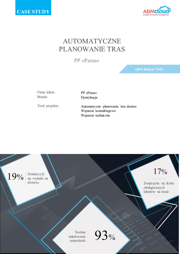 CASE STUDY AUTOMATYCZNE PLANOWANIE TRAS DOSTAW PP «Parus» ABM Rinkai TMS 19% Firma klient: Branża: PP «Parus» Dystrybucja Treść projektu: Automatyczne planowanie tras dostaw Wsparcie konsultingowe Wsparcie techniczne 17% Zmniejszyły się wydatki na dostawę Zwiększyła się liczba obsługiwanych klientów na trasie Średnie załadowanie samochodó w 93% PP «PARUS» Wyłączny dystrybutor TM «Obolon» we wschodnim regionie Ukrainy. O firmie Ponad 40 samochodów Przesłanki projektu Wysokie wydatki na dostawę. Złożoność zarządzania zasobami z uwzględnieniem sezonowości. Brak listu trasy z kolejnością odwiedzania punktów handlowych i czasem przybycia do klienta. Brak zautomatyzowanego systemu planowania i kontroli tras. Negatywny wpływ czynnika ludzkiego na planowanie tras. Obsługuje 2 magazyny 160 Pracowników ABM RINKAI Przebieg projektu Wdrożenie systemu odbywało się od razu w 2 magazynach. Po 3 tygodniach od rozpoczęcia prac, samochody pojechali po trasom zaplanowanym w ABM Rinkai TMS. Zostały wystawione dokładne współrzędne geograficzne punktów dostaw. 2 Zostały uzgodnione aktualne okna czasowe klientów. 4 Zrealizowano wymianę danych z operatorem GPS monitoringu transportu Sp. z o.o. «Donbas partner grup», co zapewniło jakościowe narzędzie kontroli kierowcy i analizę planowo-faktyczną. 6 Przeprowadzono szkolenie pracowników PP «PARUS» na temat pracy w systemie ABM Rinkai TMS. 3 Skonfigurowano automatyczną wymianę danych z systemem ewidencyjnym za pomocą web-service, co zapewniło operatywne ładowanie zamówień do ABM Rinkai TMS i wyładowanie planów tras do systemu ewidencyjnego. 5 Zaproponowano mechanizm planowania tras z uwzględnieniem wizyt na stacjach benzynowych. 7 Wprowadzono niezbędne ustawienia do systemu ABM Rinkai TMS zgodnie z biznesprocesem firmy i skonfigurowano analitykę. Wyniki i efekty projektu ABM Rinkai TMS Zautomatyzowano proces planowania tras, kontrolę ich wykonania i ocenę efektywności. Znacząco skrócił się czas planowania: maksymalny czas z uwzględnieniem wszystkich ograniczeń wynosi nie więcej niż 30 minut. System pozwala szybko i łatwo przygotować sprawozdania, które służą podstawą do podejmowania decyzji zarządczych. Za pomocą bloku analityki stało się wygodniej oceniać efektywność wykorzystania transportu, analizować rentowność punktów dostaw oraz oceniać jakość obsługi klientów. Sformowano kolejność załadowania samochodów na podstawie sporządzonych tras, a także w liście trasy zaznacza się dokładna kolejność wizyt u klientów. Efekty wdrożenia ABM Rinkai TMS 93% Zwiększono liczbę obsługiwanych klientów za trasę o 17% Zmniejszono wydatki na dostawę 1 kg produktów o 19% Zwiększono liczbę wywożonych produktów na 1 km o 17% Zmniejszono liczbą opóźnień do klienta (nie więcej niż 1%) Średnie załadowanie samochodów według masy wynosi RU +7 (495) 204-15-09 UA +380 (44) 207-39-55 PL +48 (22) 206-21-05 www.abmcloud.com [email protected]