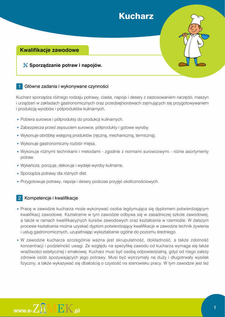Kucharz Kwalifikacje zawodowe Sporządzanie potraw i napojów. 1 Główne zadania i wykonywane czynności Kucharz sporządza różnego rodzaju potrawy, ciasta, napoje i desery z zastosowaniem narzędzi, maszyn i urządzeń w zakładach gastronomicznych oraz przedsiębiorstwach zajmujących się przygotowywaniem i produkcją wyrobów i półproduktów kulinarnych. Pobiera surowce i półprodukty do produkcji kulinarnych. Zabezpiecza przed zepsuciem surowce, półprodukty i gotowe wyroby. Wykonuje obróbkę wstępną produktów (ręczną, mechaniczną, termiczną). Wykonuje gastronomiczny rozbiór mięsa. Wykonuje różnymi technikami i metodami - zgodnie z normami surowcowymi - różne asortymenty potraw. Wykańcza, porcjuje, dekoruje i wydaje wyroby kulinarne. Sporządza potrawy dla różnych diet. Przygotowuje potrawy, napoje i desery podczas przyjęć okolicznościowych. 2 Kompetencje i kwalifikacje Pracę w zawodzie kucharza może wykonywać osoba legitymująca się dyplomem potwierdzającym kwalifikacj zawodowe. Kształcenie w tym zawodzie odbywa się w zasadniczej szkole zawodowej, a także w ramach kwalifikacyjnych kursów zawodowych oraz kształcenia w rzemiośle. W dalszym procesie kształcenia można uzyskać dyplom potwierdzający kwalifikacje w zawodzie technik żywienia i usług gastronomicznych, uzupełniając wykształcenie ogólne do poziomu średniego. W zawodzie kucharza szczególnie ważna jest skrupulatność, dokładność, a także zdolność koncentracji i podzielność uwagi. Ze względu na specyfikę zawodu od kucharza wymaga się także wrażliwości estetycznej i smakowej. Kucharz musi być osobą odpowiedzialną, gdyż od niego zależy zdrowie osób spożywających jego potrawy. Musi być wytrzymały na duży i długotrwały wysiłek fizyczny, a także wykazywać się dbałością o czystość na stanowisku pracy. W tym zawodzie jest też 1 przydatna odporność na stres związany z kontaktem z klientami. Kucharz powinien mieć wiedzę o surowcach, dodatkach do żywności i materiałach pomocniczych stosowanych w produkcji gastronomicznej, zasadach racjonalnego wykorzystania surowców, zasadach gospodarki odpadami, zasadach racjonalnego żywienia, instalacjach technicznych w zakładach gastronomicznych. Powinien także umieć posługiwać się instrukcjami obsługi maszyn i urządzeń stosowanych w produkcji gastronomicznej, rozróżniać maszyny, urządzenia i sprzęt stosowane w produkcji gastronomicznej. Aby wykonywać zawód kucharza, trzeba mieć doświadczenie w sporządzaniu potraw, przechowywaniu żywności, wykonywaniu czynności związanych z ekspedycją potraw i napojów. Konieczna jest znajomość i przestrzeganie przepisów bhp i ppoż. obowiązujących w zakładach żywienia zbiorowego. 3 Środowisko i charakter pracy Kucharz najczęściej pracuje w zespole. Jego zadania są rutynowe. Pracuje w systemie zmianowym, ok. 8-9 godzin dziennie, w przypadku większych zleceń może się zdarzyć, że dłużej. Pracuje także w dni ustawowo wolne. Praca ta wiąże się z długim przebywaniem w pozycji stojącej, w zamkniętych pomieszczeniach o dużej temperaturze, wilgotności i hałasie, a także przenoszeniem ciężkich przedmiotów. 2