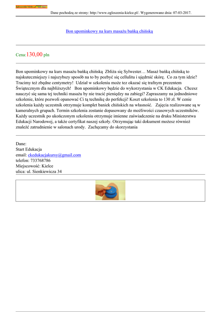 Dane pochodzą ze strony: http://www.ogloszenia-kielce.pl/. Wygenerowano dnia: 07-03-2017. Bon upominkowy na kurs masażu bańką chińską Cena:130,00 pln Bon upominkowy na kurs masażu bańką chińską Zbliża się Sylwester… Masaż bańką chińską to najskuteczniejszy i najszybszy sposób na to by pozbyć się cellulitu i ujędrnić skórę. Co za tym idzie? Tracimy też zbędne centymetry! Udział w szkoleniu może tez okazać się trafnym prezentem Świątecznym dla najbliższych! Bon upominkowy będzie do wykorzystania w CK Edukacja. Chcesz nauczyć się sama tej techniki masażu by nie tracić pieniędzy na zabiegi? Zapraszamy na jednodniowe szkolenie, które pozwoli opanować Ci tą technikę do perfekcji! Koszt szkolenia to 130 zł. W cenie szkolenia każdy uczestnik otrzymuje komplet baniek chińskich na własność. Zajęcia realizowane są w kameralnych grupach. Termin szkolenia zostanie dopasowany do możliwości czasowych uczestników. Każdy uczestnik po ukończonym szkoleniu otrzymuje imienne zaświadczenie na druku Ministerstwa Edukacji Narodowej, a także certyfikat naszej szkoły. Otrzymując taki dokument możesz również znaleźć zatrudnienie w salonach urody. Zachęcamy do skorzystania Dane: Start Edukacja email: [email protected] telefon: 733768786 Miejscowość: Kielce ulica: ul. Sienkiewicza 34