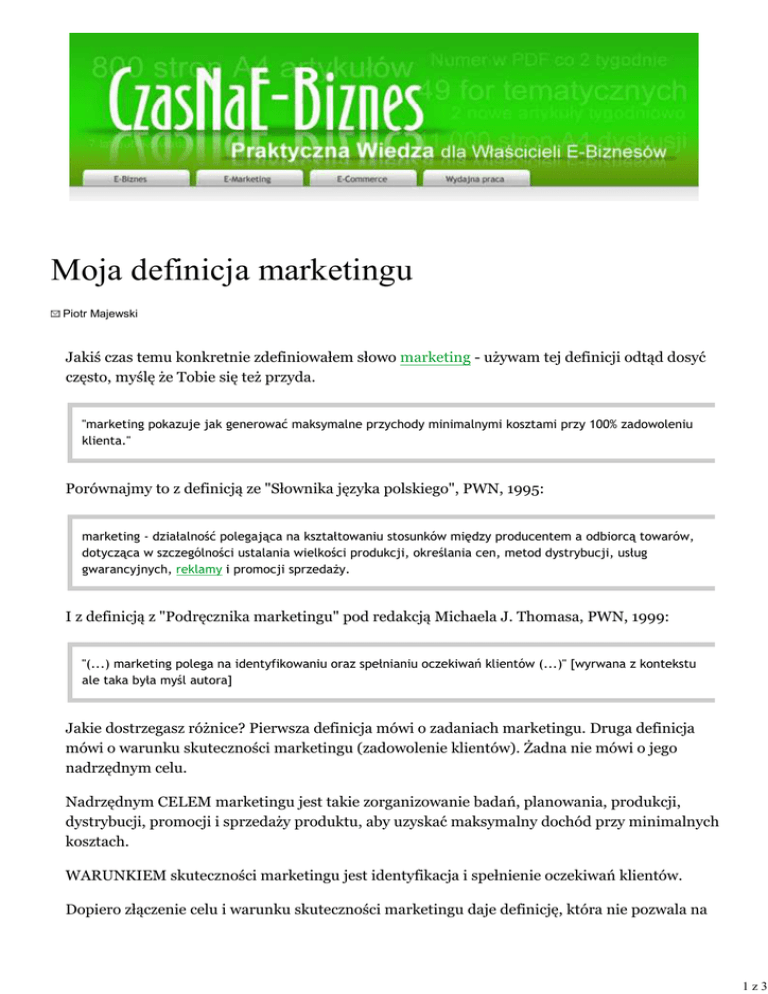 Moja definicja marketingu Piotr Majewski Jakiś czas temu konkretnie zdefiniowałem słowo marketing - używam tej definicji odtąd dosyć często, myślę że Tobie się też przyda. "marketing pokazuje jak generować maksymalne przychody minimalnymi kosztami przy 100% zadowoleniu klienta." Porównajmy to z definicją ze "Słownika języka polskiego", PWN, 1995: marketing - działalność polegająca na kształtowaniu stosunków między producentem a odbiorcą towarów, dotycząca w szczególności ustalania wielkości produkcji, określania cen, metod dystrybucji, usług gwarancyjnych, reklamy i promocji sprzedaŜy. I z definicją z "Podręcznika marketingu" pod redakcją Michaela J. Thomasa, PWN, 1999: "(...) marketing polega na identyfikowaniu oraz spełnianiu oczekiwań klientów (...)" [wyrwana z kontekstu ale taka była myśl autora] Jakie dostrzegasz różnice? Pierwsza definicja mówi o zadaniach marketingu. Druga definicja mówi o warunku skuteczności marketingu (zadowolenie klientów). Żadna nie mówi o jego nadrzędnym celu. Nadrzędnym CELEM marketingu jest takie zorganizowanie badań, planowania, produkcji, dystrybucji, promocji i sprzedaży produktu, aby uzyskać maksymalny dochód przy minimalnych kosztach. WARUNKIEM skuteczności marketingu jest identyfikacja i spełnienie oczekiwań klientów. Dopiero złączenie celu i warunku skuteczności marketingu daje definicję, która nie pozwala na 1z3 marnowanie pieniędzy przez artystów w tej branży. Gdy mówię o artystach branży marketingowej, mam na myśli "geniuszy", którzy doradzali zakup świetnych domen za milion dolarów, którzy ładowali i ładują miliony dolarów w "branding bannerowy" i zalecają inne nieracjonalne ruchy w imię idei spełniania oczekiwań klientów. Gdybym ja chciał spełniać oczekiwania klientów, to bym nie wprowadzał odpłatności. Z drugiej strony wprowadzenie odpłatności sprawiło, że wielu moich czytelników zaczęło po prostu czytać to, co dotąd przeglądali - zwykle bardziej cenimy to, za co płacimy. I co się okazało? Że nagle CNEB stał się dla nich bardziej wartościowy. To nazwijmy robieniem biznesu przy 100% zadowoleniu klienta. Rynkowy marketing jest narzędziem kapitalistów. A nadrzędnym celem kapitalistów jest maksymalny zysk, a nie spełnianie oczekiwań klientów - taki cel może mieć altruista czy ideologiczny komunista (każdemu według potrzeb). Zupełnie serio proponuję Ci powiesić nad miejscem pracy tabliczkę z moją definicją marketingu gwarantuję większe opamiętanie w nieracjonalnych wyborach i rzadsze odrzucanie racjonalnie dobrych decyzji. Od dzisiaj pamiętaj, że: "marketing pokazuje jak generować maksymalne przychody minimalnymi kosztami przy 100% zadowoleniu klienta." Moja, nie moja To co postuluję w definicji jest oczywiste dla wszystkich, którzy zajmują się marketingiem ale warto mieć jakąś spójną definicję na to co robimy, za co biorę pieniądze. Piotr Majewski | opublikowane 20-02-2003 | wersja do druku Lista komentarzy Zobacz wszystkie komentarze | Dodaj swój komentarz 2z3 Piotr Majewski. Specjalizuje się w e-biznesie i marketingu internetowym od 1998 roku. Jest redaktorem CzasNaE-Biznes. Pod takim samym tytułem została wydana jego ksiąŜka o e-biznesie. Zaprojektował od strony merytorycznej największy program szkoleniowy z zakresu e-biznesu w Polsce FIRMA XXI WIEKU - z którego skorzystało 1900 osób. NaleŜą do niego równieŜ system mailingowy impleBOT.pl, oraz platformy sprzedające szkolenia e-learningowe (Ekademia.pl) i szablony stron www (WebHandel.pl). © Majewski Business Consulting. Wszystkie prawa zastrzeŜone. Rozpowszechnianie zabronione. Oryginalna strona: http://www.cneb.pl/a/def_marketing.html 3z3