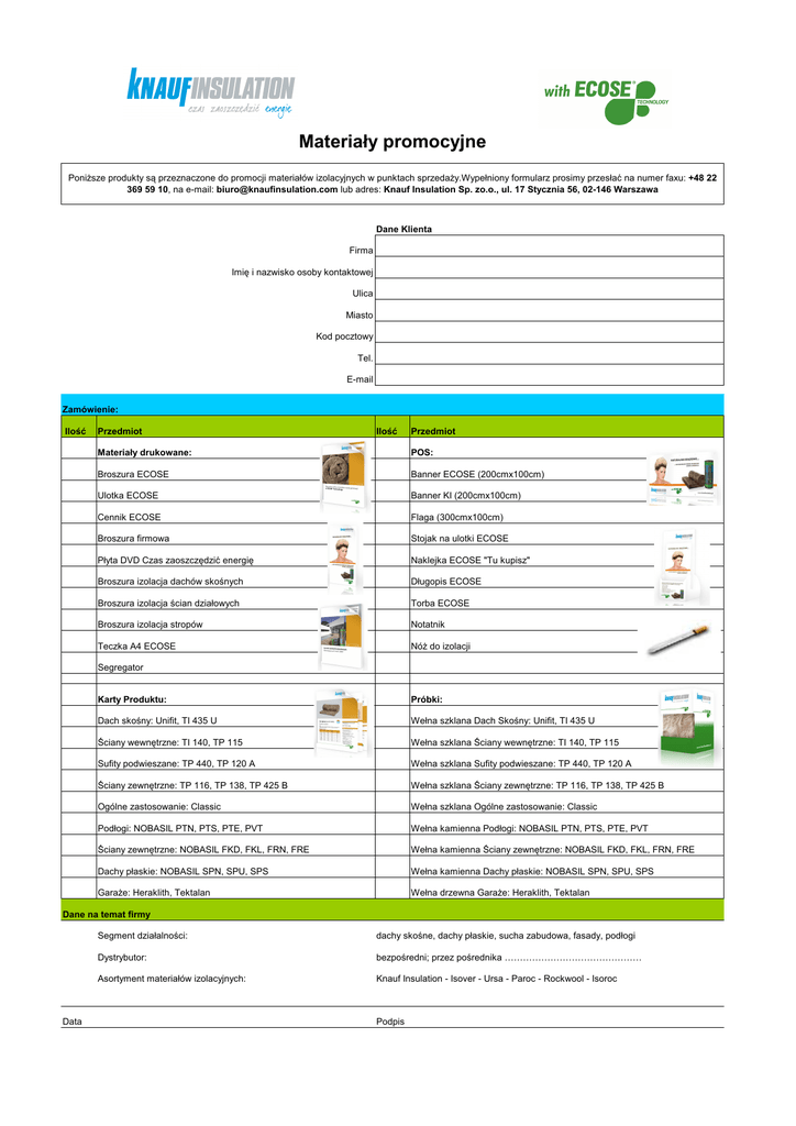 Materiały promocyjne PoniŜsze produkty są przeznaczone do promocji materiałów izolacyjnych w punktach sprzedaŜy.Wypełniony formularz prosimy przesłać na numer faxu: +48 22 369 59 10, na e-mail: [email protected] lub adres: Knauf Insulation Sp. zo.o., ul. 17 Stycznia 56, 02-146 Warszawa Dane Klienta Firma Imię i nazwisko osoby kontaktowej Ulica Miasto Kod pocztowy Tel. E-mail Zamówienie: Ilość Przedmiot Ilość Przedmiot Materiały drukowane: POS: Broszura ECOSE Banner ECOSE (200cmx100cm) Ulotka ECOSE Banner KI (200cmx100cm) Cennik ECOSE Flaga (300cmx100cm) Broszura firmowa Stojak na ulotki ECOSE Płyta DVD Czas zaoszczędzić energię Naklejka ECOSE "Tu kupisz" Broszura izolacja dachów skośnych Długopis ECOSE Broszura izolacja ścian działowych Torba ECOSE Broszura izolacja stropów Notatnik Teczka A4 ECOSE NóŜ do izolacji Segregator Karty Produktu: Próbki: Dach skośny: Unifit, TI 435 U Wełna szklana Dach Skośny: Unifit, TI 435 U Ściany wewnętrzne: TI 140, TP 115 Wełna szklana Ściany wewnętrzne: TI 140, TP 115 Sufity podwieszane: TP 440, TP 120 A Wełna szklana Sufity podwieszane: TP 440, TP 120 A Ściany zewnętrzne: TP 116, TP 138, TP 425 B Wełna szklana Ściany zewnętrzne: TP 116, TP 138, TP 425 B Ogólne zastosowanie: Classic Wełna szklana Ogólne zastosowanie: Classic Podłogi: NOBASIL PTN, PTS, PTE, PVT Wełna kamienna Podłogi: NOBASIL PTN, PTS, PTE, PVT Ściany zewnętrzne: NOBASIL FKD, FKL, FRN, FRE Wełna kamienna Ściany zewnętrzne: NOBASIL FKD, FKL, FRN, FRE Dachy płaskie: NOBASIL SPN, SPU, SPS Wełna kamienna Dachy płaskie: NOBASIL SPN, SPU, SPS GaraŜe: Heraklith, Tektalan Wełna drzewna GaraŜe: Heraklith, Tektalan Dane na temat firmy Data Segment działalności: dachy skośne, dachy płaskie, sucha zabudowa, fasady, podłogi Dystrybutor: bezpośredni; przez pośrednika ……………………………………… Asortyment materiałów izolacyjnych: Knauf Insulation - Isover - Ursa - Paroc - Rockwool - Isoroc Podpis