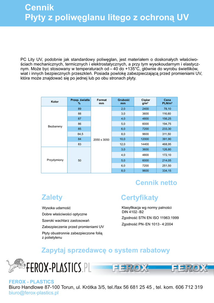 Cennik P³yty z poliwêglanu litego z ochron¹ UV PC Lity UV, podobnie jak standardowy poliwêglan, jest materia³em o doskona³ych w³aœciwoœciach mechanicznych, termicznych i elektrostatycznych, a przy tym wysokoudarnym i elastycznym. Mo¿e byc stosowany w temperaturach od – 40 do +135°C, g³ównie do wyrobu œwietlików, wiat i innych bezpiecznych przeszkleñ. Posiada powlokê zabezpieczaj¹c¹ przed promieniami UV, która mo¿e znajdowaæ siê po jednej lub po obu stronach p³yty. Kolor Bezbarwny Przep. œwiat³a % Gruboœæ mm Ciê¿ar g/m² 89 2,0 2400 78,10 88 3,0 3600 116,60 87 4,0 4800 156,25 86 5,0 6000 194,75 85 6,0 7200 233,30 84,5 8,0 9600 311,50 10,0 12000 391,90 12,0 14400 468,95 3,0 3600 126,80 4,0 4800 172,10 5,0 6000 214,05 6,0 7200 251,50 8,0 9600 334,15 84 Format mm 2050 x 3050 83 Przydymiony 50 Cena PLN/m² Cennik netto Zalety Certyfikaty Wysoka udarnoœæ Klasyfikacja wg normy palnoœci DIN 4102 - B2 Dobre w³aœciwoœci optyczne Szeroki wachlarz zastosowañ Zabezpieczenie przed promieniami UV Zgodnoœæ STN EN ISO 11963:1999 Zgodnoœæ PN- EN 1013 - 4:2004 P³yty obustronnie zabezpieczone foli¹ z polietylenu Zapytaj sprzedawcæ o system rabatowy FEROX - PLASTICS Biuro Handlowe 87-100 Torun, ul. Krótka 3/5, tel./fax 56 681 25 45 , tel. kom. 606 712 319 [email protected]