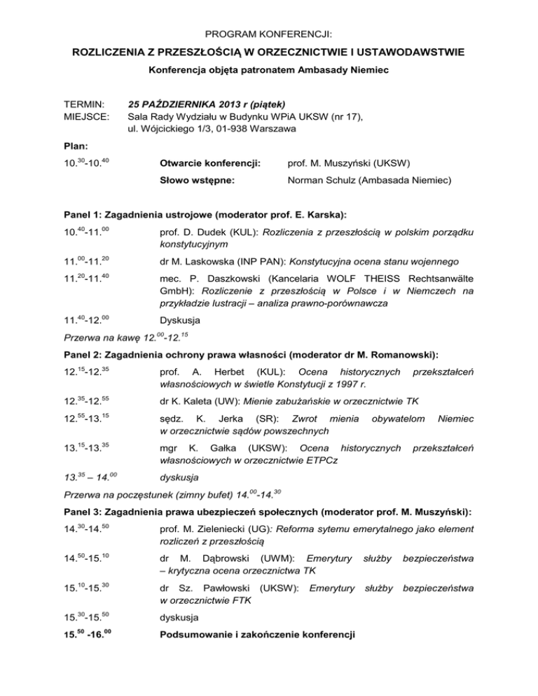 PROGRAM KONFERENCJI: ROZLICZENIA Z PRZESZŁOŚCIĄ W ORZECZNICTWIE I USTAWODAWSTWIE Konferencja objęta patronatem Ambasady Niemiec TERMIN: MIEJSCE: 25 PAŹDZIERNIKA 2013 r (piątek) Sala Rady Wydziału w Budynku WPiA UKSW (nr 17), ul. Wójcickiego 1/3, 01-938 Warszawa Plan: 10.30-10.40 Otwarcie konferencji: prof. M. Muszyński (UKSW) Słowo wstępne: Norman Schulz (Ambasada Niemiec) Panel 1: Zagadnienia ustrojowe (moderator prof. E. Karska): 10.40-11.00 prof. D. Dudek (KUL): Rozliczenia z przeszłością w polskim porządku konstytucyjnym 11.00-11.20 dr M. Laskowska (INP PAN): Konstytucyjna ocena stanu wojennego 11.20-11.40 mec. P. Daszkowski (Kancelaria WOLF THEISS Rechtsanwälte GmbH): Rozliczenie z przeszłością w Polsce i w Niemczech na przykładzie lustracji – analiza prawno-porównawcza 11.40-12.00 Dyskusja Przerwa na kawę 12.00-12.15 Panel 2: Zagadnienia ochrony prawa własności (moderator dr M. Romanowski): 12.15-12.35 prof. A. Herbet (KUL): Ocena historycznych własnościowych w świetle Konstytucji z 1997 r. 12.35-12.55 dr K. Kaleta (UW): Mienie zabużańskie w orzecznictwie TK 12.55-13.15 sędz. K. Jerka (SR): Zwrot mienia w orzecznictwie sądów powszechnych 13.15-13.35 mgr K. Gałka (UKSW): Ocena historycznych własnościowych w orzecznictwie ETPCz 13.35 – 14.00 dyskusja przekształceń obywatelom Niemiec przekształceń Przerwa na poczęstunek (zimny bufet) 14.00-14.30 Panel 3: Zagadnienia prawa ubezpieczeń społecznych (moderator prof. M. Muszyński): 14.30-14.50 prof. M. Zieleniecki (UG): Reforma sytemu emerytalnego jako element rozliczeń z przeszłością 14.50-15.10 dr M. Dąbrowski (UWM): Emerytury – krytyczna ocena orzecznictwa TK służby bezpieczeństwa 15.10-15.30 dr Sz. Pawłowski (UKSW): w orzecznictwie FTK służby bezpieczeństwa 15.30-15.50 dyskusja 15. 50 -16.00 Emerytury Podsumowanie i zakończenie konferencji