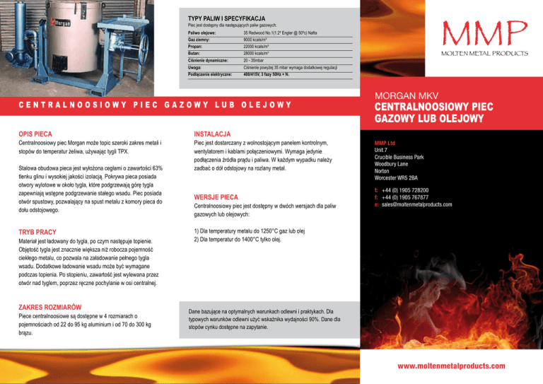MMP TYPY PALIW I SPECYFIKACJA Piec jest dostępny dla następujących paliw gazowych: Paliwo olejowe: Gaz ziemny: Propan: Butan: 35 Redwood No.1(1.2º Engler @ 50ºc) Nafta 9000 kcals/m³ 22000 kcals/m³ 28000 kcals/m³ Ciśnienie dynamiczne: 20 - 35mbar Uwaga: Ciśnienie powyżej 35 mbar wymaga dodatkowej regulacji Podłączenie elektryczne: 400/415V, 3 fazy 50Hz + N. CENTRALNOOSIOWY PIEC GAZOWY LUB OLEJOWY OPIS PIECA Centralnoosiowy piec Morgan może topic szeroki zakres metali i stopów do temperatur żeliwa, używając tygli TPX. Stalowa obudowa pieca jest wyłożona cegłami o zawartości 63% tlenku glinu i wysokiej jakości izolacją. Pokrywa pieca posiada otwory wylotowe w około tygla, które podgrzewają górę tygla zapewniają wstępne podgrzewanie stałego wsadu. Piec posiada otwór spustowy, pozwalający na spust metalu z komory pieca do dołu odstojowego. TRYB PRACY Materiał jest ładowany do tygla, po czym następuje topienie. Objętość tygla jest znacznie większa niż robocza pojemność ciekłego metalu, co pozwala na załadowanie pełnego tygla wsadu. Dodatkowe ładowanie wsadu może być wymagane podczas topienia. Po stopieniu, zawartość jest wylewana przez otwór nad tyglem, poprzez ręczne pochylanie w osi centralnej. ZAKRES ROZMIARÓW Piece centralnoosiowe są dostępne w 4 rozmiarach o pojemnościach od 22 do 95 kg aluminium i od 70 do 300 kg brązu. molten metal products MORGAN MKV CENTRALNOOSIOWY PIEC GAZOWY LUB OLEJOWY INSTALACJA Piec jest dostarczany z wolnostojącym panelem kontrolnym, wentylatorem i kablami połączeniowymi. Wymaga jedynie podłączenia źródła prądu i paliwa. W każdym wypadku należy zadbać o dół odstojowy na rozlany metal. WERSJE PIECA Centralnoosiowy piec jest dostępny w dwóch wersjach dla paliw gazowych lub olejowych: MMP Ltd Unit 7 Crucible Business Park Woodbury Lane Norton Worcester WR5 2BA t: +44 (0) 1905 728200 f: +44 (0) 1905 767877 e: [email protected] 1) Dla temperatury metalu do 1250°C gaz lub olej 2) Dla temperatur do 1400°C tylko olej. Dane bazujące na optymalnych warunkach odlewni i praktykach. Dla typowych warunków odlewni użyć wskaźnika wydajności 90%. Dane dla stopów cynku dostępne na zapytanie. www.moltenmetalproducts.com MMP WERSJE WYSOKOTEMPERATUROWE Dla temperatur metalu powyżej 1250°C oferowane są tylko wersje molten metal products olejowe, pozwalające na otrzymanie temperatur do 1400°C odpowiednich dla topienia żeliwa szarego. Są dostarczane z wolnostojącymi Typowa wydajność wysokociśnieniowymi wentylatorami i ALUMINIUM 720C BRĄZ DO 1150C ŻELIWO DO 1400C Wielkość pieca Pojemność Kg Olej Pierwszy wytop(min) Kolejne wytopy(min) Zużycie paliwa kolejne wytopy, l Gaz Pierwszy wytop(min) Kolejne wytopy (min) Zużycie paliwa kolejne wytopy, kWh Zapotrzebowanie gazu m3/h N.G. Zapotrzebowanie oleju l/h 2 35 3 60 4 95 2 120 3 200 4 300 2 80 3 160 4 240 40 45 55 70 75 95 150 160 180 30 35 40 45 55 70 115 125 130 7 12 19 16 27 38 77 95 100 50 55 65 75 80 100 35 40 45 50 60 75 87 135 195 170 290 410 15 21 27 20 29 34 15 21 29 22 30 33 mają automatyczną regulację paliwo/ powietrze. Wersja olejowa wykorzystuje palnik atomizujący średniego lub wysokiego ciśnienia z wolnostojącym wentylatorem. Mały dostęp gazu jest wymagany w celu zapłonu. W piecach gazowych do temperatury 1250°C jest zastosowany palnik średniociśnieniowy, z dyszą mieszającą i wolnostojącym wentylatorem. Wszystkie palniki są automatyczne, z regulacją temperatury, start, stop i czujnikiem UV zaniku płomienia. CENTRALNOOSIOWY PIEC GAZOWY LUB OLEJOWY NIE STOSOWANE 40 46 47 Wymiary pieca (mm) Platform Platform CA2 CA3 CA4 Pojemno Pojemno Pojemno ść Kg Br ść Kg Br ść Kg Br Wzór Kg Wzór Kg Wzór TPX901 120 TPX904 200 TPX14 A B C D E F 1700 940 800 1170 - - 2000 955 850 1385 1475 1190 2000 990 930 1385 1560 1255 Dane do wysyłki(około) Waga netto Kg 1120 1470 1680 Waga brutto Kg 1470 1780 1980 Objętość m 3 3.17 4.93 5.7 Kg 300 F SPECYFIKACJA E B A t: +44 (0) 1905 728200 • f: +44 (0) 1905 767877 • e: [email protected] CA 01/12. MMP zastrzega prawo do zmiany specyfikacji w każdym momencie i nie odpowiada za błędy drukarskie Metal PALNIK www.moltenmetalproducts.com