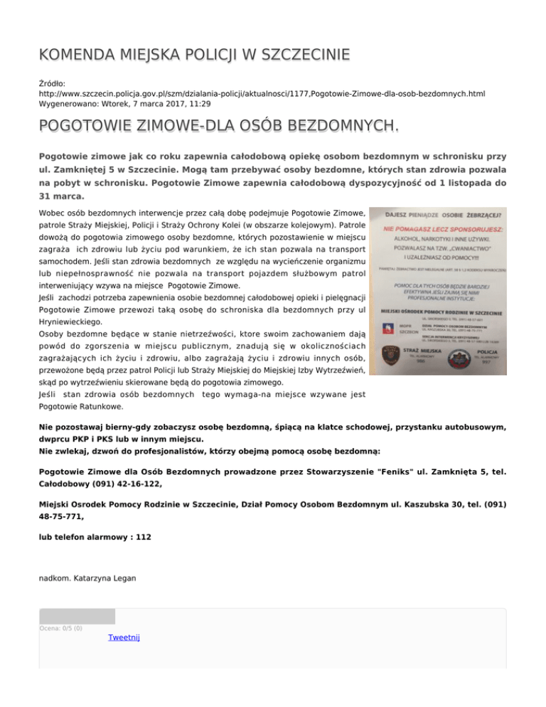KOMENDA MIEJSKA POLICJI W SZCZECINIE Źródło: http://www.szczecin.policja.gov.pl/szm/dzialania-policji/aktualnosci/1177,Pogotowie-Zimowe-dla-osob-bezdomnych.html Wygenerowano: Wtorek, 7 marca 2017, 11:29 POGOTOWIE ZIMOWE-DLA OSÓB BEZDOMNYCH. Pogotowie zimowe jak co roku zapewnia całodobową opiekę osobom bezdomnym w schronisku przy ul. Zamkniętej 5 w Szczecinie. Mogą tam przebywać osoby bezdomne, których stan zdrowia pozwala na pobyt w schronisku. Pogotowie Zimowe zapewnia całodobową dyspozycyjność od 1 listopada do 31 marca. Wobec osób bezdomnych interwencje przez całą dobę podejmuje Pogotowie Zimowe, patrole Straży Miejskiej, Policji i Straży Ochrony Kolei (w obszarze kolejowym). Patrole dowożą do pogotowia zimowego osoby bezdomne, których pozostawienie w miejscu zagraża ich zdrowiu lub życiu pod warunkiem, że ich stan pozwala na transport samochodem. Jeśli stan zdrowia bezdomnych ze względu na wycieńczenie organizmu lub niepełnosprawność nie pozwala na transport pojazdem służbowym patrol interweniujący wzywa na miejsce Pogotowie Zimowe. Jeśli zachodzi potrzeba zapewnienia osobie bezdomnej całodobowej opieki i pielęgnacji Pogotowie Zimowe przewozi taką osobę do schroniska dla bezdomnych przy ul Hryniewieckiego. Osoby bezdomne będące w stanie nietrzeźwości, ktore swoim zachowaniem dają powód do zgorszenia w miejscu publicznym, znadują się w okolicznościach zagrażających ich życiu i zdrowiu, albo zagrażają życiu i zdrowiu innych osób, przewożone będą przez patrol Policji lub Straży Miejskiej do Miejskiej Izby Wytrzeźwień, skąd po wytrzeźwieniu skierowane będą do pogotowia zimowego. Jeśli stan zdrowia osób bezdomnych tego wymaga-na miejsce wzywane jest Pogotowie Ratunkowe. Nie pozostawaj bierny-gdy zobaczysz osobę bezdomną, śpiącą na klatce schodowej, przystanku autobusowym, dwprcu PKP i PKS lub w innym miejscu. Nie zwlekaj, dzwoń do profesjonalistów, którzy obejmą pomocą osobę bezdomną: Pogotowie Zimowe dla Osób Bezdomnych prowadzone przez Stowarzyszenie "Feniks" ul. Zamknięta 5, tel. Całodobowy (091) 42-16-122, Miejski Osrodek Pomocy Rodzinie w Szczecinie, Dział Pomocy Osobom Bezdomnym ul. Kaszubska 30, tel. (091) 48-75-771, lub telefon alarmowy : 112 nadkom. Katarzyna Legan Ocena: 0/5 (0) Tweetnij