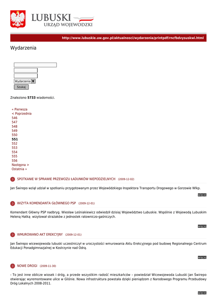 http://www.lubuskie.uw.gov.pl/aktualnosci/wydarzenia/printpdf/rncfbdvysuskwi.html Wydarzenia Wydarzenia ▼ Szukaj Znaleziono 5733 wiadomości. « Pierwsza < Poprzednia 546 547 548 549 550 551 552 553 554 555 556 Następna > Ostatnia » SPOTKANIE W SPRAWIE PRZEWOZU ŁADUNKÓW NIEPODZIELNYCH (2009-12-02) Jan Świrepo wziął udział w spotkaniu przygotowanym przez Wojewódzkiego Inspektora Transportu Drogowego w Gorzowie Wlkp. więcej WIZYTA KOMENDANTA GŁÓWNEGO PSP (2009-12-01) Komendant Główny PSP nadbryg. Wiesław Leśniakiewicz odwiedził dzisiaj Województwo Lubuskie. Wspólnie z Wojewodą Lubuskim Heleną Hatką wizytował strażaków z jednostek ratowniczo-gaśniczych. więcej WMUROWANO AKT EREKCYJNY (2009-12-01) Jan Świrepo wicewojewoda lubuski uczestniczył w uroczystości wmurowania Aktu Erekcyjnego pod budowę Regionalnego Centrum Edukacji Ponadgimnazjalnej w Kostrzynie nad Odrą. więcej NOWE DROGI (2009-11-30) - To jest inne oblicze wiosek i dróg, a przede wszystkim radość mieszkańców – powiedział Wicewojewoda Lubuski Jan Świrepo otwierając wyremontowane ulice w Gliśnie. Nowa infrastruktura powstała dzięki pieniądzom z Narodowego Programu Przebudowy Dróg Lokalnych 2008-2011. więcej WARSZTATY W BUKOWYM DWORKU (2009-11-30) Dziś rozpoczęły się warsztaty dla dyrektorów Powiatowych Urzędów Pracy województwa lubuskiego oraz pracowników Odziału ds. Rynku Pracy w Wydziale Polityki Społecznej LUW z udziałem wicewojewody lubuskiego. więcej WARSZTATY W BUKOWYM DWORKU (2009-11-30) Dziś rozpoczęły się warsztaty dla dyrektorów Powiatowych Urzędów Pracy województwa lubuskiego oraz pracowników Odziału ds. Rynku Pracy w Wydziale Polityki Społecznej LUW z udziałem wicewojewody lubuskiego. więcej SPOTKANIE W KARPACZU (2009-11-30) W niedzielę 29 listopada br. w Karpaczu uroczystą kolacją rozpoczęło się spotkanie Zrzeszenia Prezydentów, Burmistrzów i Wójtów Województwa Lubuskiego z udziałem Heleny Hatki. więcej 1 GRUDNIA - ŚWIATOWY DZIEŃ AIDS (2009-11-30) 1 grudnia to Światowy Dzień AIDS. Podczas tego dnia nie tylko promuje się walkę z AIDS, ale przede wszystkim jest to dzień, w którym szczególnie myślimy o bliskich, przyjaciołach oraz znajomych dotkniętych tym problemem. więcej DNI HONOROWEGO KRWIODAWSTWA (2009-11-27) Wojewoda Lubuski Helena Hatka uczestniczyła w Dniach Honorowego Krwiodwstwa, które w tym roku zbiegły się z 90 leciem istnienia Polskiego Czerwonego Krzyża, utworzonego wkrótce po pierwszej wojnie światowej. więcej W TROSCE O MATKĘ I DZIECKO (2009-11-26) - Dzisiejsza konferencja doskonale wpisuje się w rządowe programy. Dobrze by było, żeby wnioski wyciągnięte z tego spotkania były przydatne dla nas wszystkich - powiedział Wicewojewoda Lubuski Jan Świrepo otwierając konferencję poświęconą poprawie skuteczności opieki zdrowotnej nad matką i dzieckiem. więcej « Pierwsza < Poprzednia 546 547 548 549 550 551 552 553 554 555 556 Następna > Ostatnia »