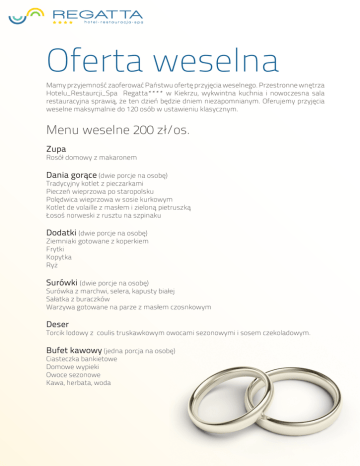Oferta weselna Mamy przyjemność zaoferować Państwu ofertę przyjęcia weselnego. Przestronne wnętrza Hotelu_Restaurcji_Spa Regatta**** w Kiekrzu, wykwintna kuchnia i nowoczesna sala restauracyjna sprawią, że ten dzień będzie dniem niezapomnianym. Oferujemy przyjęcia weselne maksymalnie do 120 osób w ustawieniu klasycznym. Menu weselne 200 zł/os. Zupa Rosół domowy z makaronem Dania gorące (dwie porcje na osobę) Tradycyjny kotlet z pieczarkami Pieczeń wieprzowa po staropolsku Polędwica wieprzowa w sosie kurkowym Kotlet de volaille z masłem i zieloną pietruszką Łosoś norweski z rusztu na szpinaku Dodatki (dwie porcje na osobę) Ziemniaki gotowane z koperkiem Frytki Kopytka Ryż Surówki (dwie porcje na osobę) Surówka z marchwi, selera, kapusty białej Sałatka z buraczków Warzywa gotowane na parze z masłem czosnkowym Deser Torcik lodowy z coulis truskawkowym owocami sezonowymi i sosem czekoladowym. Bufet kawowy (jedna porcja na osobę) Ciasteczka bankietowe Domowe wypieki Owoce sezonowe Kawa, herbata, woda Zakąski zimne (trzy porcje na osobę) Schab pieczony nadziewany żurawiną w galarecie Galantyna z kurczaka z orzechami Szparagi zawijane w szynkę konserwową Tatar wołowy z jajkiem Łosoś w galarecie Pieczywo, masło Sałatki (jedna porcja na osobę) Caprese Gyros Grecka Sosy zimne (tatarski, czosnkowy, cumberland) Kolacja (jedna porcja na osobę) Żurek staropolski na zakwasie Szynka wieprzowa pieczona w całości glazurowana Kapusta kiszona zasmażana okraszona wędzonką Sos żurawinowy, musztarda, chrzan, pieczywo. Cena obejmuje również: Powitanie Pary Młodej chlebem i solą Brak opłaty korkowej za wódkę i wino Białe obrusy i serwetki, świeczniki Apartament dla Nowożeńców ze śniadaniem Bezpłatny parking hotelowy Zakwaterowanie podczas Wesela: Do dyspozycji Państwa oddajemy 23 komfortowo urządzone pokoje w specjalnej cenie: Pokój jednoosobowy 200 zł + śniadanie 35 zł/os. Pokój dwuosobowy 230 zł + śniadanie 35 zł/os. W cenie doby hotelowej bezpłatny dostęp do strefy Wellness & Spa: basen z przeciwprądem, sauna fińska i turecka, jacuzzi, salka fitness. Atrakcje dodatkowe: Fontanna czekolady z owocami: 700 zł Pokaz fajerwerków: 1000 zł Stół wiejski : 20 zł/os. Dekoracja kwiatowa stołów: 10 zł/os. Kontakt: Joanna Gulczyńska / joanna.gulczyń[email protected]/ tel.: 501 221 215 Hotel_Restauracja_Spa Regatta**** / ul. Chojnicka 49 ; 60 -480 Poznań-Kiekrz telefon: + 48 61 848 83 08 / mob. + 48 502 78 78 10 / fax: + 48 61 840 32 10 email: [email protected] / www.regattahotel.pl