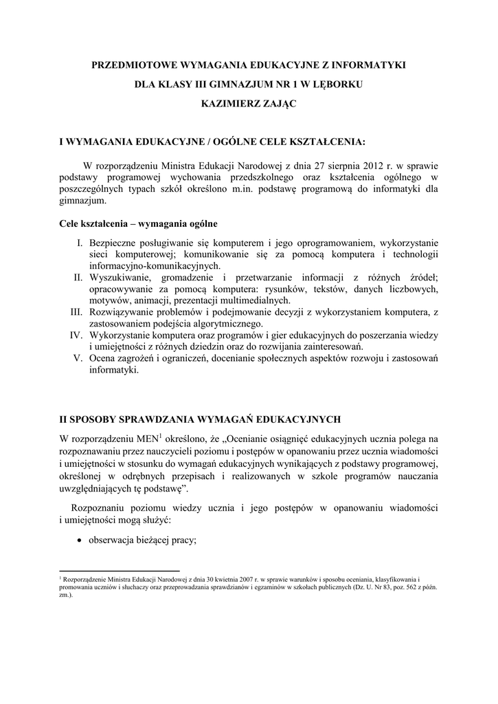 PRZEDMIOTOWE WYMAGANIA EDUKACYJNE Z INFORMATYKI DLA KLASY III GIMNAZJUM NR 1 W LĘBORKU KAZIMIERZ ZAJĄC I WYMAGANIA EDUKACYJNE / OGÓLNE CELE KSZTAŁCENIA: W rozporządzeniu Ministra Edukacji Narodowej z dnia 27 sierpnia 2012 r. w sprawie podstawy programowej wychowania przedszkolnego oraz kształcenia ogólnego w poszczególnych typach szkół określono m.in. podstawę programową do informatyki dla gimnazjum. Cele kształcenia – wymagania ogólne I. Bezpieczne posługiwanie się komputerem i jego oprogramowaniem, wykorzystanie sieci komputerowej; komunikowanie się za pomocą komputera i technologii informacyjno-komunikacyjnych. II. Wyszukiwanie, gromadzenie i przetwarzanie informacji z różnych źródeł; opracowywanie za pomocą komputera: rysunków, tekstów, danych liczbowych, motywów, animacji, prezentacji multimedialnych. III. Rozwiązywanie problemów i podejmowanie decyzji z wykorzystaniem komputera, z zastosowaniem podejścia algorytmicznego. IV. Wykorzystanie komputera oraz programów i gier edukacyjnych do poszerzania wiedzy i umiejętności z różnych dziedzin oraz do rozwijania zainteresowań. V. Ocena zagrożeń i ograniczeń, docenianie społecznych aspektów rozwoju i zastosowań informatyki. II SPOSOBY SPRAWDZANIA WYMAGAŃ EDUKACYJNYCH W rozporządzeniu MEN1 określono, że „Ocenianie osiągnięć edukacyjnych ucznia polega na rozpoznawaniu przez nauczycieli poziomu i postępów w opanowaniu przez ucznia wiadomości i umiejętności w stosunku do wymagań edukacyjnych wynikających z podstawy programowej, określonej w odrębnych przepisach i realizowanych w szkole programów nauczania uwzględniających tę podstawę”. Rozpoznaniu poziomu wiedzy ucznia i jego postępów w opanowaniu wiadomości i umiejętności mogą służyć: obserwacja bieżącej pracy; Rozporządzenie Ministra Edukacji Narodowej z dnia 30 kwietnia 2007 r. w sprawie warunków i sposobu oceniania, klasyfikowania i promowania uczniów i słuchaczy oraz przeprowadzania sprawdzianów i egzaminów w szkołach publicznych (Dz. U. Nr 83, poz. 562 z późn. zm.). 1 obserwacja ucznia na lekcji (m.in. samodzielność w wykonywaniu ćwiczeń, aktywność na lekcji, inwencja twórcza, stosowanie zasad bezpieczeństwa i właściwej organizacji pracy oraz higieny na stanowisku komputerowym itd.); wykonana przez ucznia praca – utworzony lub zmodyfikowany dokument komputerowy, m.in. rysunek, prezentacja, tekst, tabela arkusza kalkulacyjnego, prezentacja multimedialna, strona internetowa, program komputerowy; zadania sprawdzające; prezentowanie samodzielnie opracowanych zagadnień prace podejmowane z własnej inicjatywy na przykład: referaty, prezentacje, plansze poglądowe, instrukcje itp. Podczas lekcji nauczyciel ma możliwość zebrania wielu informacji o umiejętnościach uczniów oraz o ich sprawności w posługiwaniu się narzędziami TI. Nauczyciel powinien obserwować, czy działania podejmowane przez uczniów w celu rozwiązania ćwiczenia wynikają z nabytych umiejętności i czy są to działania świadome oraz czy uczeń wykonuje wszystkie czynności planowo i nie działa chaotycznie lub przypadkowo. Należy premiować uczniów (również słownie) za wykonanie ćwiczenia samodzielnie i poprawnie. Czas wykonania zadania nie powinien być głównym miernikiem oceny. W trakcie wykonywania ćwiczeń można zadawać uczniom pytania o sposób otrzymania danego rozwiązania. Uczeń odpowiadający na lekcji na pytania dodatkowe lub wykonujący dodatkowe ćwiczenia powinien być za to również oceniany. Należy tak organizować pracę na lekcji (przygotowywać odpowiednie ćwiczenia), aby uczniowie początkujący nie czuli się gorsi. Należy zwracać szczególną uwagę na postępy w zdobywaniu wiedzy i odpowiednio je premiować. Dla uczniów szczególnie zainteresowanych informatyką trzeba przygotować ćwiczenia trochę trudniejsze, aby mogli wykazać się swoimi umiejętnościami i wiedzą. Ćwiczenia sprawdzające powinny być bardzo precyzyjnie określone i dokładnie przygotowane, w formie zrozumiałej dla ucznia i ułatwiającej jednoznaczną ocenę. Forma zadań nie powinna odbiegać od ćwiczeń, które uczniowie wykonują na zajęciach. W ocenie ćwiczenia należy uwzględnić wykonanie wszystkich poleceń zgodnie z treścią. Jeśli na lekcji informatyki dwie osoby pracują przy jednym komputerze, należy tak planować zajęcia, aby uczniowie mogli wykonywać ćwiczenia na zmianę. Tej zasady należy przestrzegać i egzekwować ją, by nie dochodziło do sytuacji, w której pracuje tylko uczeń, posiadający większe umiejętności. W prezentowanym programie przykładowe wymagania edukacyjne na poszczególne oceny zostały opisane w rozdziale IV. Korzystając z zapisów umieszczonych w tabelach, po ich ewentualnej modyfikacji, nauczyciel może ocenić każdego ucznia. III SPRAWDZIANY Po każdym rozdziale przeprowadzony zostaje test-praktyczny Termin sprawdzianu podaje nauczyciel z minimum tygodniowym wyprzedzeniem. Na sprawdzenie nauczyciel ma 2 tygodnie. W przypadku nieobecności ucznia na zadaniach sprawdzających uczeń jest zobowiązany do wykonania w/w w ciągu 2 tygodni od dnia powrotu do szkoły. Termin i sposób uzupełnienia zaległości wyznacza nauczyciel w porozumieniu z uczniem. W szczególnym przypadku termin zaległej pracy może zostać przedłużony przez nauczyciela. Jeśli uczeń unika prac (nieusprawiedliwione nieobecności w wyznaczonych terminach), musi ją wykonać po powrocie do szkoły w najbliższym terminie.W przypadku nie uzupełnienia treści programowych uczeń otrzymuje ocenę niedostateczną. IV SZCZEGÓŁOWE KRYTERIA OCENIANIA Oceny ustala się w stopniach według tradycyjnej skali: Stopień celujący 6 Stopień bardzo dobry 5 Stopień dobry 4 Stopień dostateczny 3 Stopień dopuszczający 2 Stopień niedostateczny 1 1. Stopień celujący otrzymuje uczeń, który: wyróżnia się wiedzą i umiejętnościami określonymi w programie nauczania przedmi