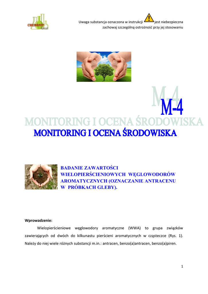 Uwaga substancja oznaczona w instrukcji jest niebezpieczna zachowaj szczególną ostrożność przy jej stosowaniu BADANIE ZAWARTOŚCI WIELOPIERŚCIENIOWYCH WĘGLOWODORÓW AROMATYCZNYCH (OZNACZANIE ANTRACENU W PRÓBKACH GLEBY). Wprowadzenie: Wielopierścieniowe węglowodory aromatyczne (WWA) to grupa związków zawierających od dwóch do kilkunastu pierścieni aromatycznych w cząsteczce (Rys. 1). Należy do niej wiele różnych substancji m.in.: antracen, benzo(a)antracen, benzo(a)piren. 1 Uwaga substancja oznaczona w instrukcji jest niebezpieczna zachowaj szczególną ostrożność przy jej stosowaniu Rys. 1. Przykłady wielopierścieniowych węglowodorów aromatycznych. Wiele z tych związków jest szkodliwych dla środowiska, toksycznych i kancerogennych dla ludzi. Wielopierścieniowe węglowodory aromatyczne występujące w środowisku pochodzą zarówno ze źródeł antropogenicznych jak i naturalnych, przy czym ilości tych zanieczyszczeń będące wynikiem działalności człowieka są zdecydowanie większe. Związki te powstają jako produkty uboczne w wielu procesach chemicznych, praktycznie każdy proces, związany z silnym ogrzewaniem lub niecałkowitym spalaniem związków organicznych, może być źródłem emisji WWA, również pozaprzemysłowym (spalarnie odpadów, pożary lasów, spaliny samochodowe). Źródłem WWA jest także palenie tytoniu, przy czym zarówno bierne jak i czynne palenie jest istotnym czynnikiem ryzyka nowotworowego. WWA są na ogół słabo rozpuszczalne w wodzie, mogą jednak tworzyć z wodą emulsje, są trwałe pod względem chemicznym i nie ulegają łatwo rozkładowi pod wpływem mikroorganizmów. Ponadto związki te gromadzą się w osadach dennych, gdzie w warunkach beztlenowych ich rozkład jest dodatkowo spowolniony. Węglowodory 2 Uwaga substancja oznaczona w instrukcji jest niebezpieczna zachowaj szczególną ostrożność przy jej stosowaniu aromatyczne są kumulowane w organizmach zwierzęcych np. w tłuszczu oraz mięsie ryb czy mięczaków. Bardzo często WWA są obecne również w wodach podziemnych, do których przenikają przez mało zwarte warstwy filtracyjne gruntu zanieczyszczając w ten sposób źródła wody pitnej. Analiza WWA w próbkach środowiskowych jest trudna i czasochłonna gdyż na ogół obecna jest duża liczba związków z tej grupy, występują one w małym stężeniu wspólnie z innymi zanieczyszczeniami organicznymi. Izolacja WWA z próbek wody i ścieków może być wykonana poprzez ekstrakcje: ciecz-ciecz, do fazy stałej, płynem w stanie nadkrytycznym czy też z wykorzystaniem membran półprzepuszczalnych. W przypadku analizy próbek gleby stosuje się ekstrakcję rozpuszczalnikiem. Najczęściej wykorzystywane są takie rozpuszczalniki jak: benzen, toluen, heksan lub mieszaninę heksan – aceton. Jeśli chodzi zaś o oznaczanie WWA w próbkach powietrza to przeprowadza się adsorpcję na odpowiednim filtrze, a następnie ekstrakcję rozpuszczalnikiem. Często stosowanym sposobem kontroli dokładności wyników analitycznych jest metoda odzysku. Realizuje się ją w ten sposób, że do kilku porcji tej samej próbki dodaje się znane, różne ilości wzorca oznaczanej substancji i przeprowadza procedurę analityczną. Stosowanie tej metody wymaga jednak zachowania środków ostrożności i rozwagi podczas wnioskowania, a także uwzględnienia jak największej ilości informacji na temat badanego układu. Cele ćwiczenia: Celem ćwiczenia jest oznaczenie antracenu w roztworze glebowym i obliczenie odzysku antracenu z ekstraktu glebowego Wykonanie oznaczenia Odczynniki: 1. Acetonitryl (czystość HPLC) roztwór 70%, 2. heksan, 3 Uwaga substancja oznaczona w instrukcji jest niebezpieczna zachowaj szczególną ostrożność przy jej stosowaniu 3. aceton, 4. antracen (roztwór wzorcowy o stężeniu 1 mg/cm3). UWAGA Wszelkie roztwory pipetować z użyciem nasadki. Przy pracy z kwasami stosować okulary ochronne. Pozostałe po oznaczeniu roztwory przenieść do przeznaczonych na odpady pojemników. Sprzęt laboratoryjny i aparatura pomiarowa: Probówki stożkowe z tworzywa sztucznego, pipety automatyczne, chromatograf cieczowy HP 1050 z detektorem UV/VIS. Sposób wykonania: A. Wyznaczenie czasu retencji antracenu Przeprowadzić jedno oznaczenie Antracen oznacza się poddając analizie chromatograficznej ekstrakt glebowy. Analizę należy wykonać z zastosowaniem wysokosprawnej chromatografii cieczowej (HPLC), przy użyciu chromatografu HP 1050 z detektorem UV/VIS (pętla nastrzykowa o objętości 20 mm3, kolumna chromatograficzna ze złożem C18 (Grace, 250 x 4,6 mm)), sterowanego oprogramowaniem Clarity. Fazę ruchomą stanowi roztwór acetonitrylu i wody (70:30 v/v), szybkość przepływu wynosi 1,5 cm3/min. Detekcję prowadzić należy przy długości fali 250 nm. Identyfikacji związku dokonać na podstawie zgodności czasu retencji z wzorcem. W tym celu przygotować w wialce chromatograficznej 1cm3 roztworu wzorcowego roboczego 4 Uwaga substancja oznaczona w instrukcji jest niebezpieczna zachowaj szczególną ostrożność przy jej stosowaniu antracenu o stężeniu 50 µg/cm3 poprzez rozcieńczenie acetonitrylem roztworu wzorcowego podstawowego o stężeniu 1 mg/cm3 i przeprowadzić jego analizę chromatograficzną. B. Przygotowanie ekstraktu glebowego Przeprowadzić dwa równoległe oznaczenia Na wadze analitycznej odważyć po 5 g wysuszonej na powietrzu i rozdrobnionej gleby, przenieść ją do plastikowych probówek (a, b). Następnie pipetą automatyczną dodać do każdej z nich 100,0 mm3 roztworu podstawowego antracenu o stężeniu 1 mg/cm3 i po 2,5 cm3 acetonu i heksanu. Wytrząsać przez 10 min. Próbki odstawić na kilkanaście minut, aż osad ulegnie sedymentacji. Pobrać do strzykawek 2 cm3 ekstraktów, przesączyć przez filtr 0,45 µm do wialek chromatograficznych (1a i 1b). Przeprowadzić chromatograficzne oznaczanie antracenu. C. Oznaczanie zawartości antracenu Przeprowadzić dwa równoleg