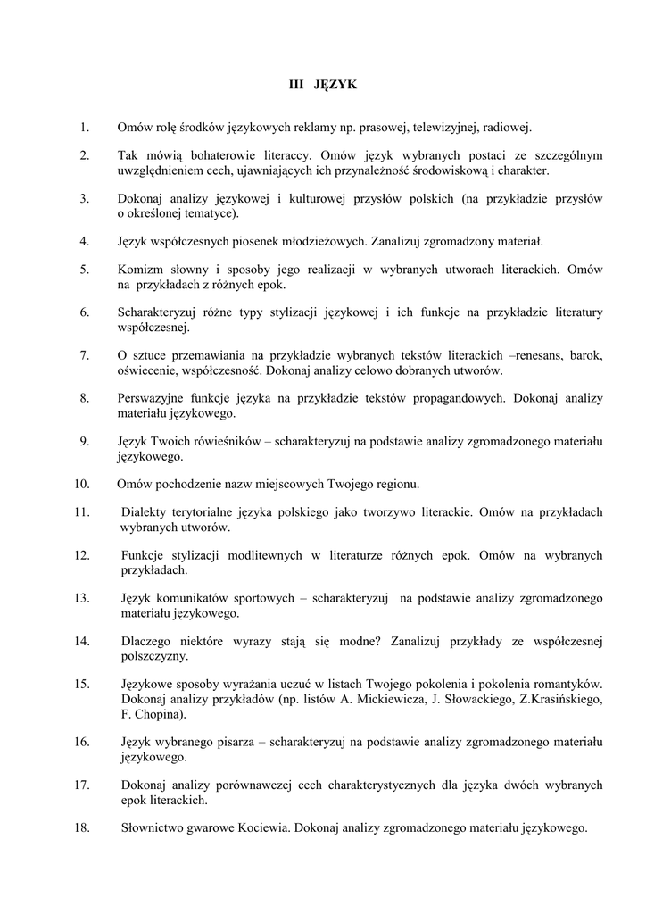 III JĘZYK 1. Omów rolę środków językowych reklamy np. prasowej, telewizyjnej, radiowej. 2. Tak mówią bohaterowie literaccy. Omów język wybranych postaci ze szczególnym uwzględnieniem cech, ujawniających ich przynależność środowiskową i charakter. 3. Dokonaj analizy językowej i kulturowej przysłów polskich (na przykładzie przysłów o określonej tematyce). 4. Język współczesnych piosenek młodzieżowych. Zanalizuj zgromadzony materiał. 5. Komizm słowny i sposoby jego realizacji w wybranych utworach literackich. Omów na przykładach z różnych epok. 6. Scharakteryzuj różne typy stylizacji językowej i ich funkcje na przykładzie literatury współczesnej. 7. O sztuce przemawiania na przykładzie wybranych tekstów literackich –renesans, barok, oświecenie, współczesność. Dokonaj analizy celowo dobranych utworów. 8. Perswazyjne funkcje języka na przykładzie tekstów propagandowych. Dokonaj analizy materiału językowego. 9. Język Twoich rówieśników – scharakteryzuj na podstawie analizy zgromadzonego materiału językowego. 10. Omów pochodzenie nazw miejscowych Twojego regionu. 11. Dialekty terytorialne języka polskiego jako tworzywo literackie. Omów na przykładach wybranych utworów. 12. Funkcje stylizacji modlitewnych w literaturze różnych epok. Omów na wybranych przykładach. 13. Język komunikatów sportowych – scharakteryzuj na podstawie analizy zgromadzonego materiału językowego. 14. Dlaczego niektóre wyrazy stają się modne? Zanalizuj przykłady ze współczesnej polszczyzny. 15. Językowe sposoby wyrażania uczuć w listach Twojego pokolenia i pokolenia romantyków. Dokonaj analizy przykładów (np. listów A. Mickiewicza, J. Słowackiego, Z.Krasińskiego, F. Chopina). 16. Język wybranego pisarza – scharakteryzuj na podstawie analizy zgromadzonego materiału językowego. 17. Dokonaj analizy porównawczej cech charakterystycznych dla języka dwóch wybranych epok literackich. 18. Słownictwo gwarowe Kociewia. Dokonaj analizy zgromadzonego materiału językowego. 19. Życie wsi polskiej, jej obyczajowość i system wartościowania świata w języku mieszkańców Pomorza, Kociewia i Kujaw. 20. Język jako instrument walki o władzę. Zanalizuj wybrane materiały wyborcze. 21. Ekspresja i impresja – analizując celowo zgromadzony materiał językowy, określ właściwości wypowiedzi świadczące o nadawcy i odbiorcy. 22. Specyfika języka bohaterów literatury science – fiction. Omów na przykładach wybranych utworów. 23. Analizując zgromadzony materiał językowy, we współczesnym języku polskim. Oceń ich celowość. 24. Język współczesnych powieści dla dzieci i młodzieży. Na przykładach scharakteryzuj język i styl pisarstwa wybranych autorów. 25. Oceń poprawność językową wybranych tekstów prasowych. Scharakteryzuj kryteria, którymi się posłużyłeś. 26. Historia języka polskiego utrwalona w zasadach pisowni. Omów na wybranych przykładach. 27. Omów na wybranych przykładach cechy językowe kazań dawnych i współczesnych. 28. Wpływ literatury na współczesną frazeologię polską. Analizując zgromadzony materiał, scharakteryzuj funkcje skrzydlatych słów w tekstach mówionych i pisanych. 29. Funkcje stylizacji biblijnych w literaturze różnych epok. Omów na wybranych przykładach. 30. Gwara a stylizacja gwarowa. Omów te zjawiska, analizując celowo zgromadzony materiał językowy. 31. Ekspansywność anglicyzmów we współczesnej polszczyźnie. Omów problem, analizując wybrane przykłady z różnych dziedzin życia. 32. Błędy językowe w programach telewizyjnych i radiowych. Omów na wybranych przykładach. scharakteryzuj zapożyczenia Opracował zespół polonistów