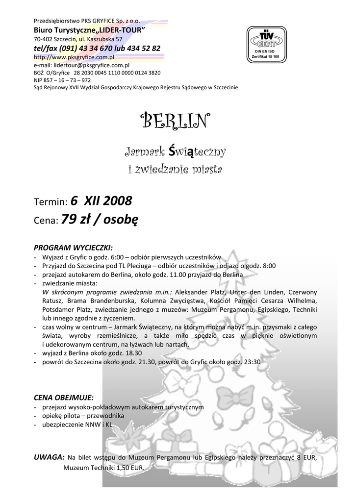 Przedsiębiorstwo PKS GRYFICE Sp. z o.o. Biuro Turystyczne„LIDER-TOUR” 70-402 Szczecin, ul. Kaszubska 57 tel/fax (091) 43 34 670 lub 434 52 82 http://www.pksgryfice.com.pl e-mail: [email protected] DIN EN ISO Zertifikat 15 100 BGŻ O/Gryfice 28 2030 0045 1110 0000 0124 3820 NIP 857 – 16 – 73 – 972 Sąd Rejonowy XVII Wydział Gospodarczy Krajowego Rejestru Sądowego w Szczecinie BERLIN Jarmark Świąteczny i zwiedzanie miasta Termin: 6 XII 2008 Cena: 79 zł / osobę PROGRAM WYCIECZKI: Wyjazd z Gryfic o godz. 6:00 – odbiór pierwszych uczestników Przyjazd do Szczecina pod TL Pleciuga – odbiór uczestników i odjazd o godz. 8:00 przejazd autokarem do Berlina, około godz. 11.00 przyjazd do Berlina zwiedzanie miasta: W skróconym programie zwiedzania m.in.: Aleksander Platz, Unter den Linden, Czerwony Ratusz, Brama Brandenburska, Kolumna Zwycięstwa, Kościół Pamięci Cesarza Wilhelma, Potsdamer Platz, zwiedzanie jednego z muzeów: Muzeum Pergamonu, Egipskiego, Techniki lub innego zgodnie z życzeniem. - czas wolny w centrum – Jarmark Świąteczny, na którym można nabyć m.in. przysmaki z całego świata, wyroby rzemieślnicze, a także miło spędzić czas w pięknie oświetlonym i udekorowanym centrum, na łyżwach lub nartach. - wyjazd z Berlina około godz. 18.30 - powrót do Szczecina około godz. 21.30, powrót do Gryfic około godz. 23:30 - CENA OBEJMUJE: - przejazd wysoko-pokładowym autokarem turystycznym - opiekę pilota – przewodnika - ubezpieczenie NNW i KL UWAGA: Na bilet wstępu do Muzeum Pergamonu lub Egipskiego należy przeznaczyć 8 EUR, Muzeum Techniki 1,50 EUR.