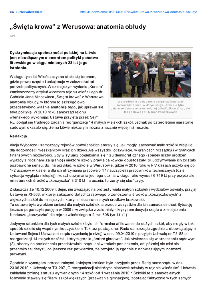 kurie rwile nski.lt http://kurierwilenski.lt/2014/01/07/swieta-kro wa-z-weruso wa-anato mia-o bludy/ „Święta krowa” z Werusowa: anatomia obłudy KW Dyskryminacja społeczności polskiej na Litwie jest nieodłącznym elementem polityki państwa litewskiego w ciągu minionych 23 lat jego istnienia. W ciągu tych lat Wileńszczyzna stała się terenem, gdzie prawo często f unkcjonuje w zależności od potrzeb politycznych. W dzisiejszym wydaniu „Kuriera” zamieszczamy artykuł wicemera rejonu wileńskiego dr Gabriela Jana Mincewicza „Święta krowa” z Werusowa: W p rz e d e d niu p o s ie d z e nia z o rg aniz o wano p rz y anatomia obłudy, w którym to szczegółowo s amo rz ąd z ie wie c , w któ rym wz ię li ud z iał nie tylko przedstawiono właśnie anatomię tego, jak uprawia się d z iałac z e i z wo le nnic y o s ławio ne j „Vilniji”, „Rytas a” itp ., ale te ż p o s ło wie Fo t. Marian Palus z kie wic z taką politykę. W 2010 roku samorząd rejonu wileńskiego wykonując Ustawę przyjętą przez Sejm RL, podjął się trudnego zadania reorganizacji 14 małych wiejskich szkół. Jednak po czteroletnim maratonie sądowym okazało się, że na Litwie niektórym można znacznie więcej niż reszcie. Redakcja Akcja Wyborcza i samorządy rejonów podwileńskich starały się, jak mogły, zachować małe szkółki wiejskie dla dogodności mieszkańców oraz ich dzieci. Ale wszystko, oczywiście, w granicach rozsądku i w granicach f inansowych możliwości. Gdy w sytuacji pogłębiania się niżu demograf icznego (spadek liczby urodzeń, wyjazdy z rodzinami za granicę) niektóre szkoły prawie całkowicie opustoszały, to utrzymywanie ich zostało pozbawione sensu. Bo, na przykład, w szkole w Werusowie, gdzie w 2010 roku w I-IV klasach uczyło się po 1-2 uczniów w klasie, a dla ich utrzymania pracowało 17 nauczycieli i pracowników technicznych (dziś sytuacja wygląda nielepiej) i koszt utrzymania jednego ucznia w ciągu roku wynosił 6 719 Lt przy przydziale ministerskich środków „koszyczka” 3 310 Lt na ucznia, to żarty się skończyły. Z właszcza że 10.12.2009 r. Sejm, nie zważając na protesty wielu małych szkółek i wydziałów oświaty, przyjął Ustawę nr XI-563, w której zakazano dotychczasowego przenoszenia środków „koszyczkowych” z większych szkół do mniejszych, którym nieuchronnie tych środków brakowało. Ta ustawa była wyrokiem śmierci dla małych szkółek, a przede wszystkim dla ich samodzielności. Sytuację jeszcze pogorszyła podjęta w 2009 r. w związku z zaistniałym kryzysem decyzja rządu o zmniejszeniu f unduszu „koszyczka” dla rejonu wileńskiego o 2 mln 608 tys. Lt. (1) Jedynym ratunkiem dla tych małych szkółek było ich f ormalne af iliowanie do dużych szkół, aby mogły w taki sposób dzielić się wspólnym koszyczkiem. Tak też postąpiono. Rada samorządu zgodnie z obowiązującymi Ustawami Sejmu i Uchwałami rządu (wymienię je niżej) w dniu 09.04.2010 r. przyjęła Uchwałę nr T 3-88 o reorganizacji 14 małych szkółek, którym groziła „śmierć głodowa”. Jak stwierdza się w orzeczeniu sądowym (2), obecny na posiedzeniu przedstawiciel rządu ani w trakcie posiedzenia, ani później nie miał nic przeciwko tej decyzji, co jeszcze raz potwierdza, że przyjęto ją zgodnie z obowiązującymi normami prawnymi. Z godnie z wymogami proceduralnymi, kolejnym krokiem było przyjęcie przez Radę samorządu w dniu 23.06.2010 r. Uchwały nr T 3-207 „O reorganizacji niektórych placówek oświaty w rejonie wileńskim”. Uchwała zakładała zmianę statusu wymienionych 14 szkół od 1 września 2010 r. Szkółki te z samodzielnych f ormalnie stawały się f iliami szkół większych (przeważnie gimnazjów), zostając f aktycznie w tych samych miejscach, w tych samych budynkach i z tymi samymi nauczycielami. Chodziło przede wszystkim o dopasowanie sytuacji f ormalnej odpowiednio do zmienionych przepisów prawnych, dotyczących koszyczka. W pozostałych 13 szkołach reorganizacja przeszła spokojnie. Tylko dyrektorka szkółki w Werusowie Dalia Peciūnienė koniecznie postanowiła zostać na f otelu dyrektorki samodzielnej, nieaf iliowanej szkółki i to za wszelką cenę. A jako że prócz własnych wybujałych ambicji widocznie miała poparcie u władz najwyższych, natychmiast zabrała się do dzieła. Czy ta szkoła miała jakieś atuty prócz ambicji dyrektorki? Była jedną z najmniejszych reorganizowanych szkółek. Z aś zasłynęła przede wszystkim z tego, że w szkole był kompletny bałagan. Oto przykład. Jak wiadomo, samorząd zgodnie z planem regularnie dokonuje sprawdzania wszystkich placówek oświatowych. W trakcie jednego takiego planowego sprawdzenia 22.09.2010 r. czteroosobowa komisja wydziału oświaty wykryła w szkole w Werusowie szereg karygodnych naruszeń, co zarejestrowała w służbowym raporcie. Więc na podstawie rozkazu mer samorządu Marii Rekść nr M22-18 została utworzona 11-osobowa komisja z pracowników oświaty, radnych członków komitetu oświaty Rady samorządowej, prawników, ekonomistów i innych kompetentnych osób na czele z wicemerem dr G. J. Mincewiczem. To, co stwierdziła komisja, zostało wyrażone w przedstawionym raporcie z dnia 27.09.2010 r. (3) 1. W naruszenie obowiązujących przepisów dwoje 5-letnich dzieci wpisano do grupy przedszkolnej bez zaświadczenia od służby pedagogiczno-psychologicznej.(4) 2. Jedno dziecko, które uczęszczało do „zerówki” w roku ubiegłym, przyjęto do tejże grupy powtórnie w roku bieżącym.(5) 3. Jedno dziecko całkowicie niemówiące wymaga pomocy specjalnego pedagoga, logopeda i psychologa.(6) 4. Jedna uczennica kategorycznie nie uczęszcza na lekcje w swojej klasie, lecz stale przebywa w klasie, gdzie uczy się jej starszy brat. 5. Jedna uczennica po ukończeniu w roku ubiegłym pierwszej klasy została przyjęta powtórnie do pierwszej klasy.(7) 6. Jeden uczeń zostawiony w pierwszej