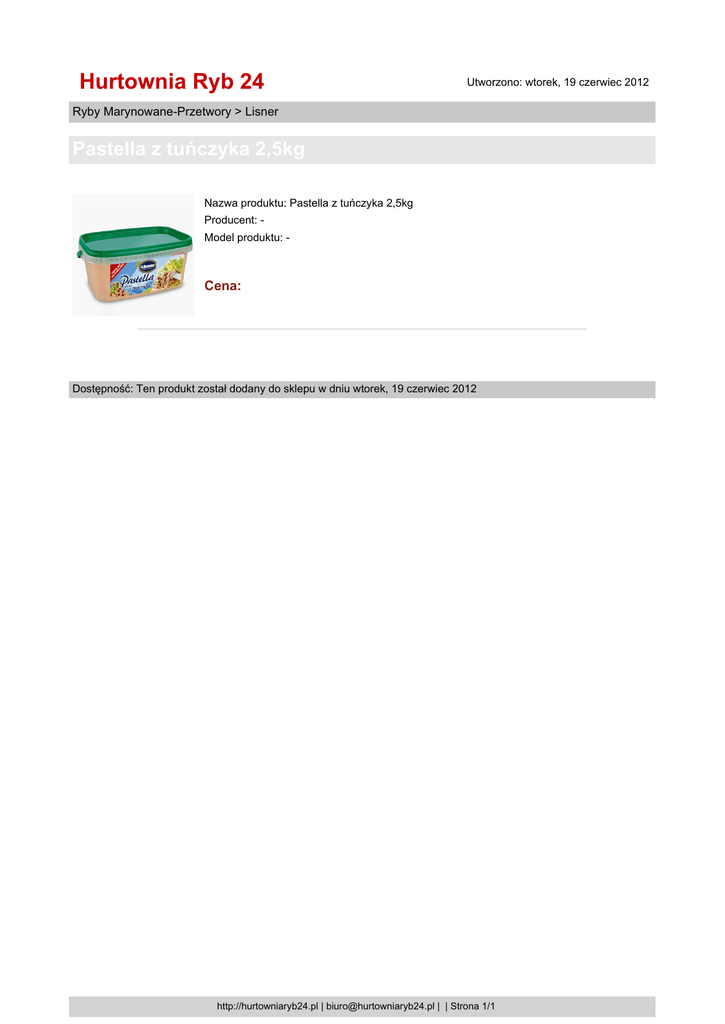 Hurtownia Ryb 24 Utworzono: wtorek, 19 czerwiec 2012 Ryby Marynowane-Przetwory > Lisner Pastella z tuńczyka 2,5kg Nazwa produktu: Pastella z tuńczyka 2,5kg Producent: Model produktu: - Cena: Dostępność: Ten produkt został dodany do sklepu w dniu wtorek, 19 czerwiec 2012 http://hurtowniaryb24.pl | [email protected] | | Strona 1/1