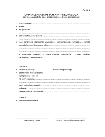 Zał. Nr 4 OPINIA LEKARZA PSYCHIATRY/ NEUROLOGA dotycząca uczestnika zajęć Środowiskowego Domu Samopomocy 1. Imię i nazwisko .......................................................................................................... 2. Adres ......................................................................................................................... 3. Rozpoznanie ............................................................................................................. ................................................................................................................................... 4. Zalecone leki, dawkowanie ....................................................................................... …................................................................................................................................ 5. Inne schorzenia (sprzeone) utrudniające funkcjonowanie, wymagające kontroli specjalistycznej, stosowania leków ........................................................................... ................................................................................................................................... ................................................................................................................................... w przypadku epilepsji – charakterystyka zwiastunów, przebieg ataków, niezbędnego postępowania ...................................................................................... ................................................................................................................................... ................................................................................................................................... uczulenia: .................................................................................................................. 6. Ilosc hospitalizacji ................................ ostatnia hospitalizacja ................................ 7. Zachowania niebezpieczne: występowały – tak/ nie na czym polegały ....................................................................................................... ................................................................................................................................... kiedy ostatni raz wystąpiły ........................................................................................ zwiastuny ................................................................................................................... zalecane środki ostrożności ...................................................................................... ................................................................................................................................... próby „S” ................................................................................................................... 8. Inne ważne informacje .............................................................................................. ................................................................................................................................... ................................................................................................................................... ................................................................. (miejscowość i data) ................................................................. (podpis i pieczęć lekarza psychiatry)