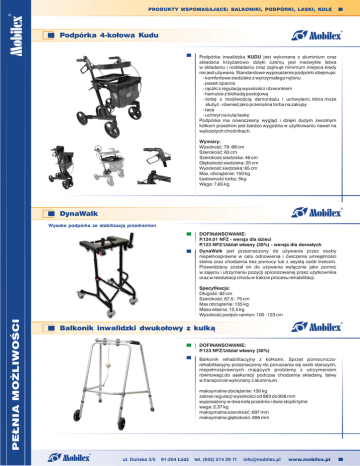 PRODUKTY WSPOMAGAJĄ CE: BALKONIKI, PODPÓ RKI, LASKI, KULE Podpórka 4-kołowa Kudu Podpórka inwalidzka KUDU jest wykonana z aluminium oraz sk³adana krzy¿akowo dziêki czemu jest niezwykle ³atwa w sk³adaniu i rozk³adaniu oraz zajmuje minimum miejsca kiedy nie jest u¿ywana. Standardowe wyposa¿enie podpórki obejmuje: - komfortowe siedzisko z wytrzyma³ego nylonu - pasek oparcia - r¹czki z regulacj¹ wysokoœci i dzwonkiem - hamulce z blokad¹ postojow¹ - torbê z mo¿liwoœci¹ demonta¿u i uchwytami, która mo¿e s³u¿yæ - równie¿ jako przenoœna torba na zakupy - tacê - uchwyt na kulê/laskê Podpórka ma nowoczesny wygl¹d i dziêki du¿ym zwrotnym kó³kom przednim jest bardzo wygodna w u¿ytkowaniu nawet na wyboistych chodnikach. Wymiary: Wysokoœæ: 79 -99 cm Szerokoœæ: 63 cm Szerokoœæ siedziska: 46 cm G³êbokoœæ siedziska: 25 cm Wysokoœæ siedziska: 65 cm Max. obci¹¿enie: 150 kg £adownoœæ torby: 5kg Waga: 7,65 kg DynaWalk Wysoka podpórka ze stabilizacj¹ przedramion DOFINANSOWANIE: P.124.01 NFZ - wersja dla dzieci P.123 NFZ/Udziałwłasny (30%) - wersja dla dorosłych DynaWalk jest przeznaczony do u¿ywania przez osoby niepe³nosprawne w celu odnowienia i æwiczenia umiejêtnoœci stania oraz chodzenia bez pomocy lub z asyst¹ osób trzecich. Przewidziany zosta³ on do u¿ywania wy³¹cznie jako pomoc w zajêciu i utrzymaniu pozycji spionizowanej przez u¿ytkownika oraz w reedukacji chodu w trakcie procesu rehabilitacji. PEŁNIA MOŻLIWOŚ CI Specyfikacja: D³ugoœæ: 82 cm Szerokoœæ: 67,5 - 75 cm Max obci¹¿enie: 135 kg Masa w³asna: 12,5 kg Wysokoœæ podpór ramion: 100 - 123 cm Balkonik inwalidzki dwuko³owy z kulk¹ DOFINANSOWANIE: P.123 NFZ/Udziałwłasny (30%) Balkonik rehabilitacyjny z kó³kami. Sprzêt pomocniczorehabilitacyjny przeznaczony do poruszania siê osób starszych, niepe³nosprawnych maj¹cych problemy z utrzymaniem równowagi;do asekuracji podczas chodzenia sk³adany, ³atwy w transporcie wykonany z aluminium. maksymalne obci¹¿enie: 130 kg zakres regulacji wysokoœci od 863 do 938 mm wyposa¿ony w dwa ko³a przednie i dwie stopki tylne waga: 2,37 kg maksymalna szerokoœæ: 697 mm maksymalna g³êbokoœæ: 695 mm ul. Duńska 3/5 91-204 Łódź tel. (042) 214 29 11 [email protected] www.mobilex.pl