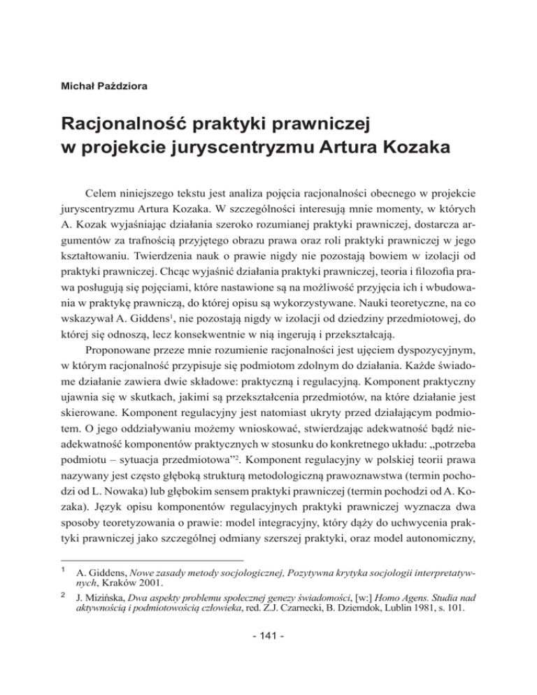 Michał Paździora Racjonalność praktyki prawniczej w projekcie juryscentryzmu Artura Kozaka Celem niniejszego tekstu jest analiza pojęcia racjonalności obecnego w projekcie juryscentryzmu Artura Kozaka. W szczególności interesują mnie momenty, w których A. Kozak wyjaśniając działania szeroko rozumianej praktyki prawniczej, dostarcza argumentów za trafnością przyjętego obrazu prawa oraz roli praktyki prawniczej w jego kształtowaniu. Twierdzenia nauk o prawie nigdy nie pozostają bowiem w izolacji od praktyki prawniczej. Chcąc wyjaśnić działania praktyki prawniczej, teoria i filozofia prawa posługują się pojęciami, które nastawione są na możliwość przyjęcia ich i wbudowania w praktykę prawniczą, do której opisu są wykorzystywane. Nauki teoretyczne, na co wskazywał A. Giddens1, nie pozostają nigdy w izolacji od dziedziny przedmiotowej, do której się odnoszą, lecz konsekwentnie w nią ingerują i przekształcają. Proponowane przeze mnie rozumienie racjonalności jest ujęciem dyspozycyjnym, w którym racjonalność przypisuje się podmiotom zdolnym do działania. Każde świadome działanie zawiera dwie składowe: praktyczną i regulacyjną. Komponent praktyczny ujawnia się w skutkach, jakimi są przekształcenia przedmiotów, na które działanie jest skierowane. Komponent regulacyjny jest natomiast ukryty przed działającym podmiotem. O jego oddziaływaniu możemy wnioskować, stwierdzając adekwatność bądź nieadekwatność komponentów praktycznych w stosunku do konkretnego układu: „potrzeba podmiotu – sytuacja przedmiotowa”2. Komponent regulacyjny w polskiej teorii prawa nazywany jest często głęboką strukturą metodologiczną prawoznawstwa (termin pochodzi od L. Nowaka) lub głębokim sensem praktyki prawniczej (termin pochodzi od A. Kozaka). Język opisu komponentów regulacyjnych praktyki prawniczej wyznacza dwa sposoby teoretyzowania o prawie: model integracyjny, który dąży do uchwycenia praktyki prawniczej jako szczególnej odmiany szerszej praktyki, oraz model autonomiczny, 1 A. Giddens, Nowe zasady metody socjologicznej, Pozytywna krytyka socjologii interpretatywnych, Kraków 2001. 2 J. Mizińska, Dwa aspekty problemu społecznej genezy świadomości, [w:] Homo Agens. Studia nad aktywnością i podmiotowością człowieka, red. Z.J. Czarnecki, B. Dziemdok, Lublin 1981, s. 101. - 141 - Michał Paździora który wykorzystując zdobycze teorii prawa oraz innych dziedzin nauki, zmierza w kierunku uzasadnienia pojęciowej i aksjologicznej odrębności prawoznawstwa. Zadaniem, które stawia przed sobą A. Kozak w swej ostatniej książce3 jest ocalenie autonomicznego języka, którym dysponuje prawo. Przy czym nie chodzi tu o język prawa rozumiany jako język aktów normatywnych, ale o język profesjonalisty, który jest zaangażowany w praktykę stosowania prawa. „Dla obywatela prawo to norma kształtująca sferę jego praw i obowiązków, zakazująca mu określonych działań lub zezwalająca na jakieś działania. Dla profesjonalisty prawo to reguła, wedle której musi on zakwalifikować postępowanie obywatela i określić jego konsekwencje”4. Owo określanie i kwalifikowanie jest działaniem, którego racjonalność sprowadza się do stopnia zgodności działania z regułami, które składają się na głęboką strukturę sensu praktyki prawniczej. Zatem, aby wyeksponować treść racjonalności, którą kierują się prawnicy, należy odtworzyć głęboką strukturę sensu praktyki prawniczej, która – zdaniem A. Kozaka – decyduje o autonomii prawoznawstwa. Ażeby uczynić analizę czytelniejszą, wprzód przedstawię koncepcję głębokiej struktury metodologicznej prawoznawstwa stworzonej przez Leszka Nowaka (I), a następnie w opozycji do niej przedstawię jej ujęcie zaproponowane przez autora Granic prawniczej władzy dyskrecjonalnej (II). Juryscentryzm, co postaram się udowodnić, choć akceptuje szereg rozstrzygnięć zaproponowanych przez L. Nowaka, to z uwagi na odmienność perspektywy poznawczej5 nadaje inny charakter głębokiej strukturze prawoznawstwa oraz związanym z nim ujęciem racjonalności (III). Na koniec wypadnie jeszcze zastanowić się nad problemami, przed którymi staje projekt juryscentryzmu (IV). I. Leszek Nowak wyjaśnia działania praktyki prawniczej przez jej wewnętrzną racjonalność, a nie przez analizę zewnętrznych wobec prawoznawstwa programów metodologicznych. Tym, co decyduje o wyjątkowości praktyki prawniczej, są działające przy interpretacji tekstów prawnych założenia idealizacyjne. Założenie idealizacyjne, które prawnik czyni odnośnie do autora tekstu, mają ze względu na społeczną rolę prawnika o wiele bardziej rygorystyczną formę niż w przypadku innych założeń idealizacyjnych funkcjonujących w naukach społecznych i humanistycznych. Zdaniem L. Nowaka, in- 3 A. Kozak, Myślenie analityczne w nauce prawa i praktyce prawniczej, Wrocław 2010. 4 Ibidem, s. 241. 5 Mianem perspektywy poznawczej określam założenia teoriopoznawcze, które przesądzają o tym, jakiego typu problemy badawcze są sensowne i możliwe do podjęcia, a jakiego nie. - 142 - Racjonalność praktyki prawniczej w projekcie... terpretacja prawnicza, zdeterminowana swoistą rolą prawnika, stanowi szczególnego rodzaju interpretację adaptacyjną, w której założenia idealizacyjne o racjonalności i doskonałości prawodawcy nie podlegają podważeniu, konfrontacji i weryfikacji w oparciu o dane empiryczne6. Konstrukcja racjonalnego prawodawcy opiera się na założeniach idealizacyjnych: a) prawodawca posiada wiedzę, która jest niesprzeczna; b) w zakres wiedzy wchodzą także konsekwencje twierdzeń; c) preferencje ocen, którymi kieruje się prawodawca, mają charakter asymetryczny oraz przechodni. Dopełnieniem konstrukcji racjonalnego prawodawcy jest przyjęcie założenia o racjonalności, które wprost wywodzi się z ekonomii: spośród możliwych i dostępnych dzi