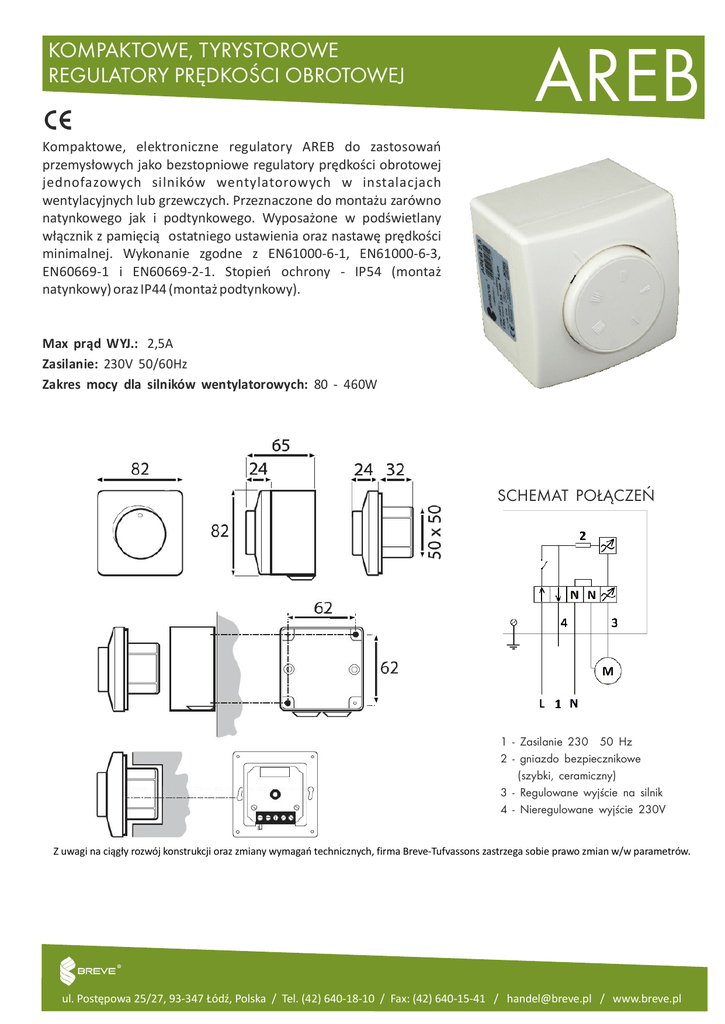 KOMPAKTOWE, TYRYSTOROWE REGULATORY PRĘDKOŚCI OBROTOWEJ AREB Kompaktowe, elektroniczne regulatory AREB do zastosowań przemysłowych jako bezstopniowe regulatory prędkości obrotowej jednofazowych silników wentylatorowych w instalacjach wentylacyjnych lub grzewczych. Przeznaczone do montażu zarówno natynkowego jak i podtynkowego. Wyposażone w podświetlany włącznik z pamięcią ostatniego ustawienia oraz nastawę prędkości minimalnej. Wykonanie zgodne z EN61000-6-1, EN61000-6-3, EN60669-1 i EN60669-2-1. Stopień ochrony - IP54 (montaż natynkowy) oraz IP44 (montaż podtynkowy). Max prąd WYJ.: 2,5A Zasilanie: 230V 50/60Hz Zakres mocy dla silników wentylatorowych: 80 - 460W SCHEMAT POŁĄCZEŃ 1 - Zasilanie 230 50 Hz 2 - gniazdo bezpiecznikowe (szybki, ceramiczny) 3 - Regulowane wyjście na silnik 4 - Nieregulowane wyjście 230V Z uwagi na ciągły rozwój konstrukcji oraz zmiany wymagań technicznych, firma Breve-Tufvassons zastrzega sobie prawo zmian w/w parametrów. ul. Postępowa 25/27, 93-347 Łódź, Polska / Tel. (42) 640-18-10 / Fax: (42) 640-15-41 / [email protected] / www.breve.pl