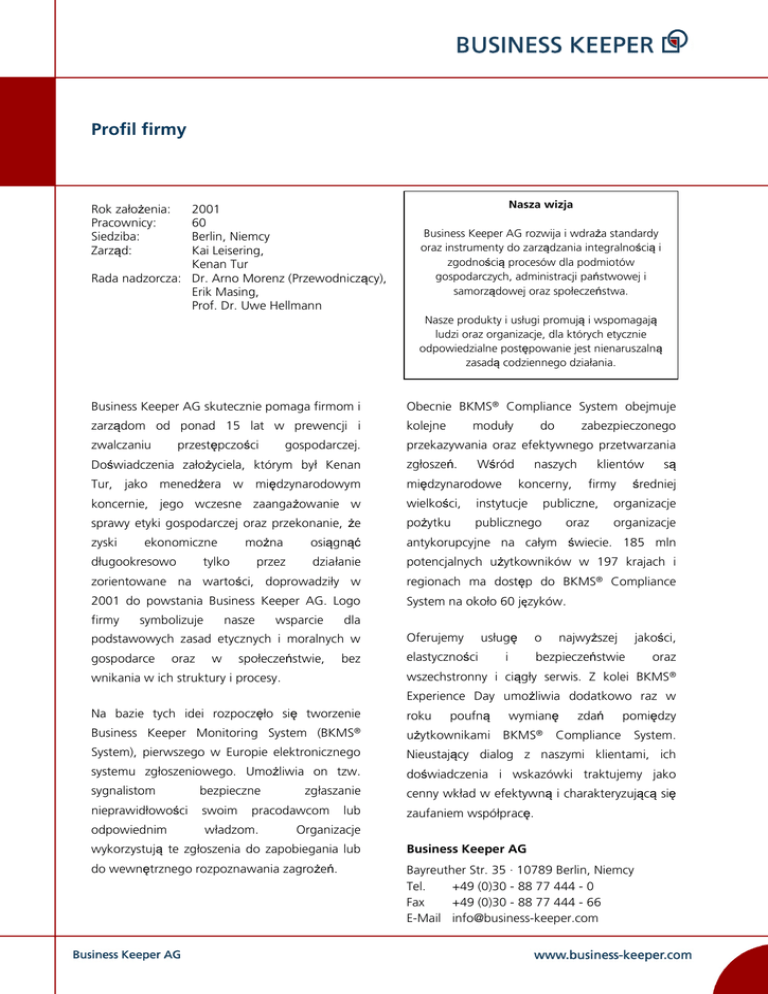Profil firmy Rok założenia: Pracownicy: Siedziba: Zarząd: 2001 60 Berlin, Niemcy Kai Leisering, Kenan Tur Rada nadzorcza: Dr. Arno Morenz (Przewodniczący), Erik Masing, Prof. Dr. Uwe Hellmann Nasza wizja Business Keeper AG rozwija i wdraża standardy oraz instrumenty do zarządzania integralnością i zgodnością procesów dla podmiotów gospodarczych, administracji państwowej i samorządowej oraz społeczeństwa. Nasze produkty i usługi promują i wspomagają ludzi oraz organizacje, dla których etycznie odpowiedzialne postępowanie jest nienaruszalną zasadą codziennego działania. Business Keeper AG skutecznie pomaga firmom i Obecnie BKMS® Compliance System obejmuje zarządom od ponad 15 lat w prewencji i kolejne zwalczaniu przekazywania oraz efektywnego przetwarzania przestępczości gospodarczej. moduły do Doświadczenia założyciela, którym był Kenan zgłoszeń. Wśród Tur, jako menedżera w międzynarodowym międzynarodowe koncernie, jego wczesne zaangażowanie w wielkości, instytucje sprawy etyki gospodarczej oraz przekonanie, że pożytku publicznego zyski zabezpieczonego naszych koncerny, klientów firmy publiczne, oraz są średniej organizacje organizacje można osiągnąć antykorupcyjne na całym świecie. 185 mln przez działanie potencjalnych użytkowników w 197 krajach i zorientowane na wartości, doprowadziły w regionach ma dostęp do BKMS® Compliance 2001 do powstania Business Keeper AG. Logo System na około 60 języków. ekonomiczne długookresowo firmy tylko symbolizuje nasze wsparcie dla podstawowych zasad etycznych i moralnych w Oferujemy gospodarce elastyczności oraz w społeczeństwie, bez usługę i o najwyższej jakości, bezpieczeństwie oraz wszechstronny i ciągły serwis. Z kolei BKMS® wnikania w ich struktury i procesy. Experience Day umożliwia dodatkowo raz w Na bazie tych idei rozpoczęło się tworzenie Business Keeper Monitoring System (BKMS® roku poufną użytkownikami wymianę BKMS® zdań Compliance pomiędzy System. System), pierwszego w Europie elektronicznego Nieustający dialog z naszymi klientami, ich systemu zgłoszeniowego. Umożliwia on tzw. doświadczenia i wskazówki traktujemy jako sygnalistom bezpieczne cenny wkład w efektywną i charakteryzującą się nieprawidłowości swoim odpowiednim władzom. zgłaszanie pracodawcom lub zaufaniem współpracę. Organizacje wykorzystują te zgłoszenia do zapobiegania lub Business Keeper AG do wewnętrznego rozpoznawania zagrożeń. Bayreuther Str. 35 ∙ 10789 Berlin, Niemcy Tel. +49 (0)30 - 88 77 444 - 0 Fax +49 (0)30 - 88 77 444 - 66 E-Mail [email protected]