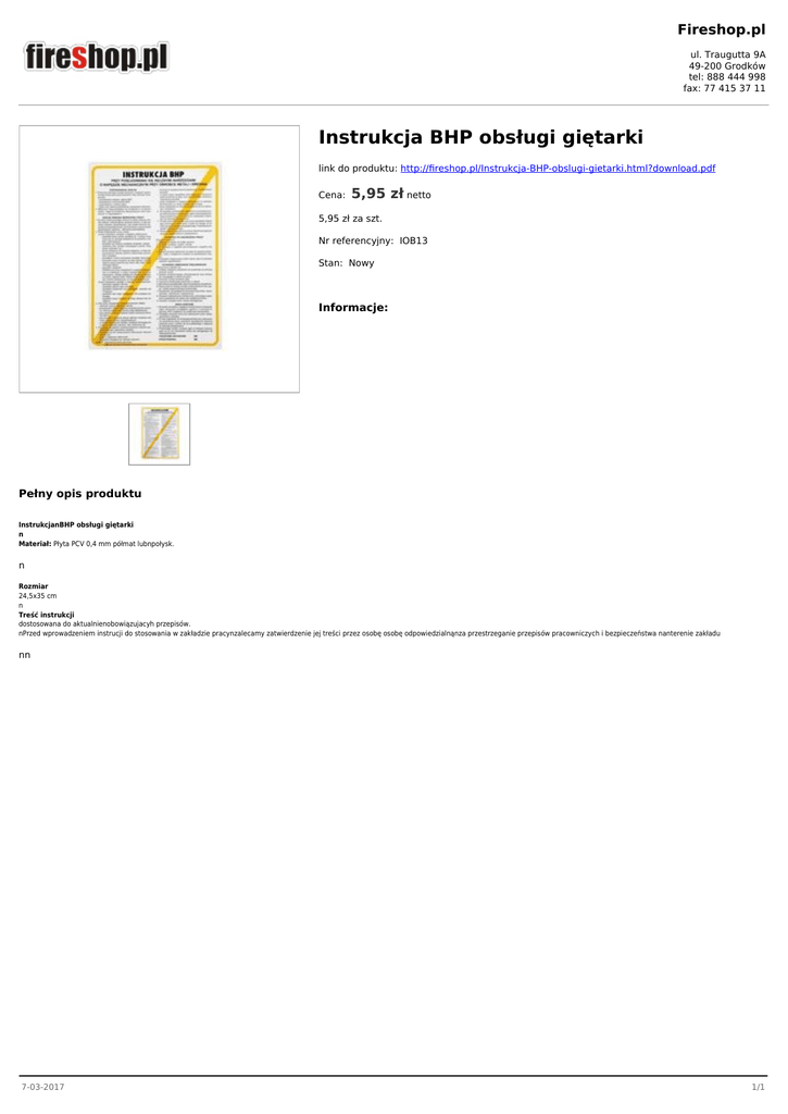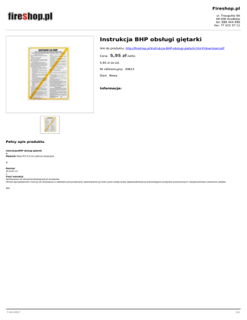 Fireshop.pl ul. Traugutta 9A 49-200 Grodków tel: 888 444 998 fax: 77 415 37 11 Instrukcja BHP obsługi giętarki link do produktu: http://fireshop.pl/Instrukcja-BHP-obslugi-gietarki.html?download.pdf Cena: 5,95 zł netto 5,95 zł za szt. Nr referencyjny: IOB13 Stan: Nowy Informacje: Pełny opis produktu InstrukcjanBHP obsługi giętarki n Materiał: Płyta PCV 0,4 mm półmat lubnpołysk. n Rozmiar 24,5x35 cm n Treść instrukcji dostosowana do aktualnienobowiązujacyh przepisów. nPrzed wprowadzeniem instrucji do stosowania w zakładzie pracynzalecamy zatwierdzenie jej treści przez osobę osobę odpowiedzialnąnza przestrzeganie przepisów pracowniczych i bezpieczeństwa nanterenie zakładu nn 7-03-2017 1/1